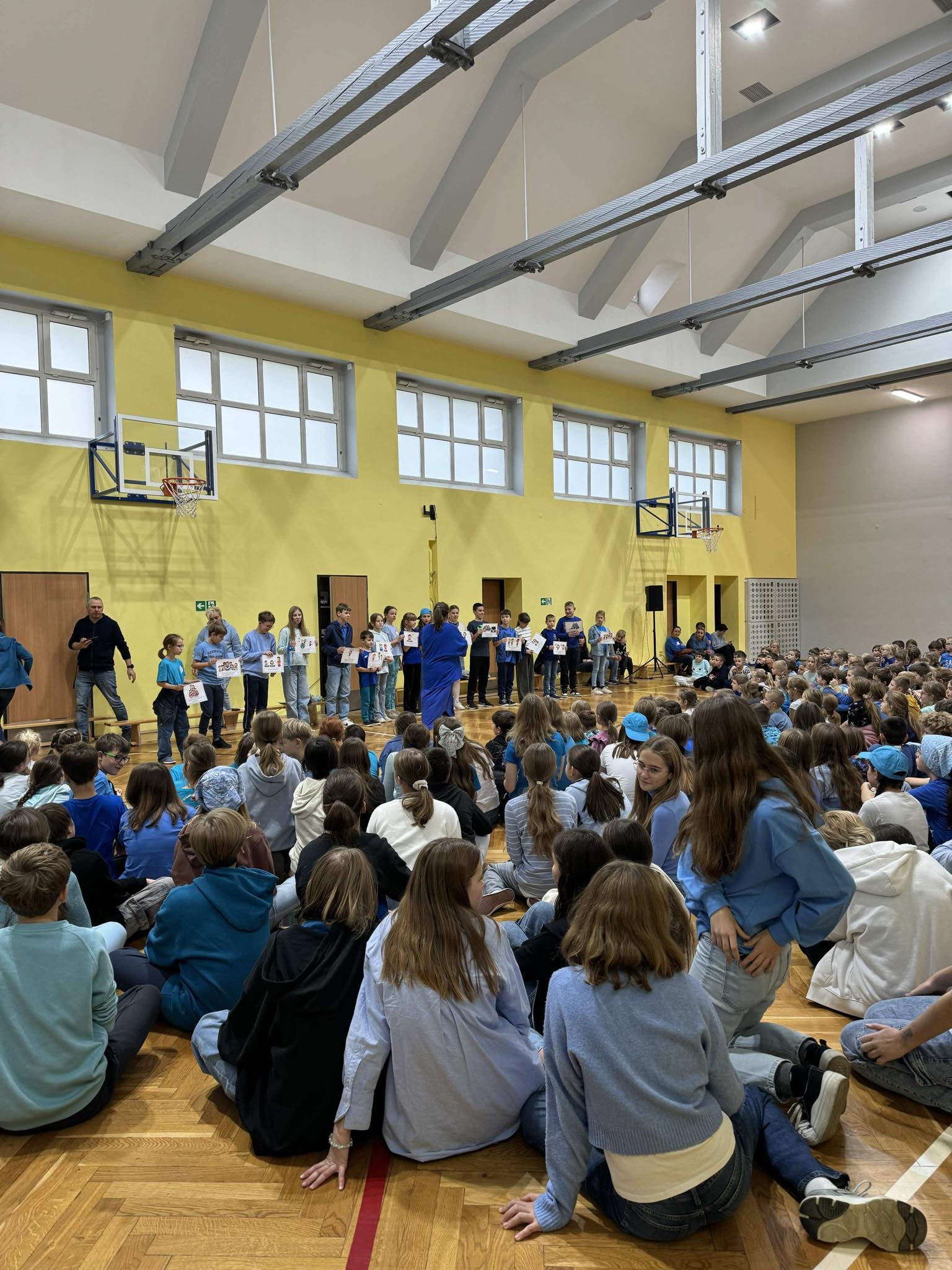 Na 5. lekcji spotkaliśmy się w sali gimnastycznej, gdzie pani dyrektor krótko podsumowała temat, a następnie graliśmy w ogólnoszkolne kalambury. Każda klasa losowała jedno prawo, które potem przedstawiała w postaci scenki lub pomnika. Bawiliśmy się świetnie.