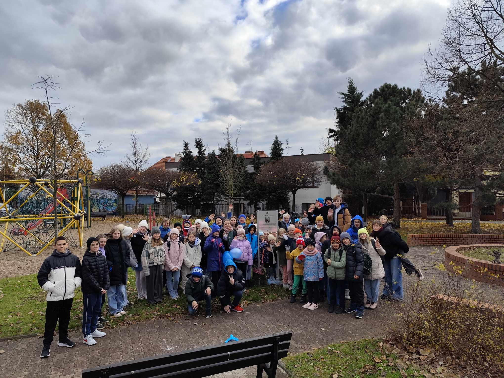 Po spotkaniu trójki klasowe wraz z opiekunami wybrały się na skwer Ludwika Rajchmana, aby złożyć symboliczną wiązankę kwiatów pod tablicą upamiętniającą jego działalność.
