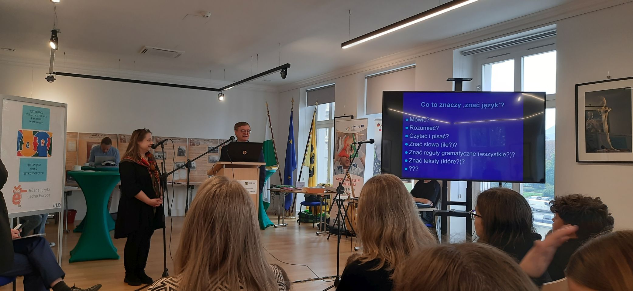 Następnie prof. dr. hab. Waldemar Martyniuk z Uniwersytetu Jagiellońskiego poprowadził wykład „Europejski Dzień Języków – bo wszystkie języki są ważne!“, po którym uczniowie wzięli udział w Speak-Dating – randce z językami czeskim, górnołużyckim, niemieckim, śląskim i ukraińskim.