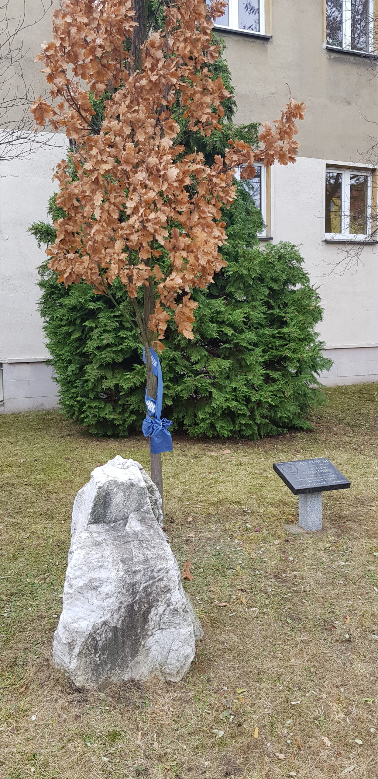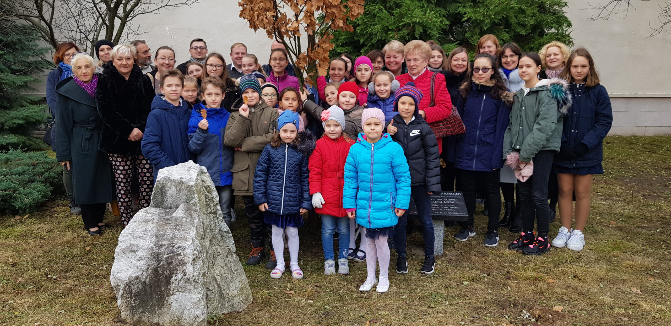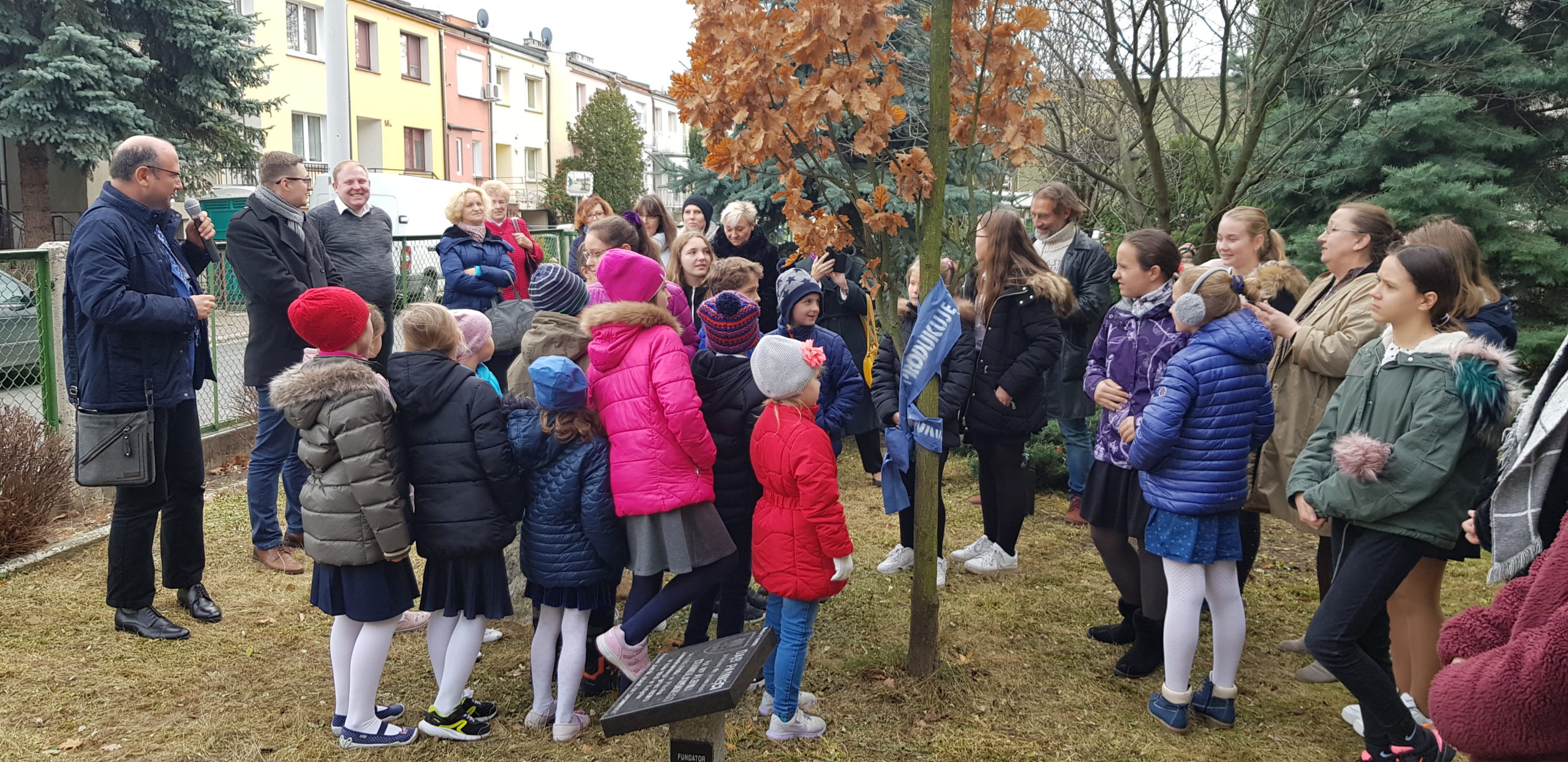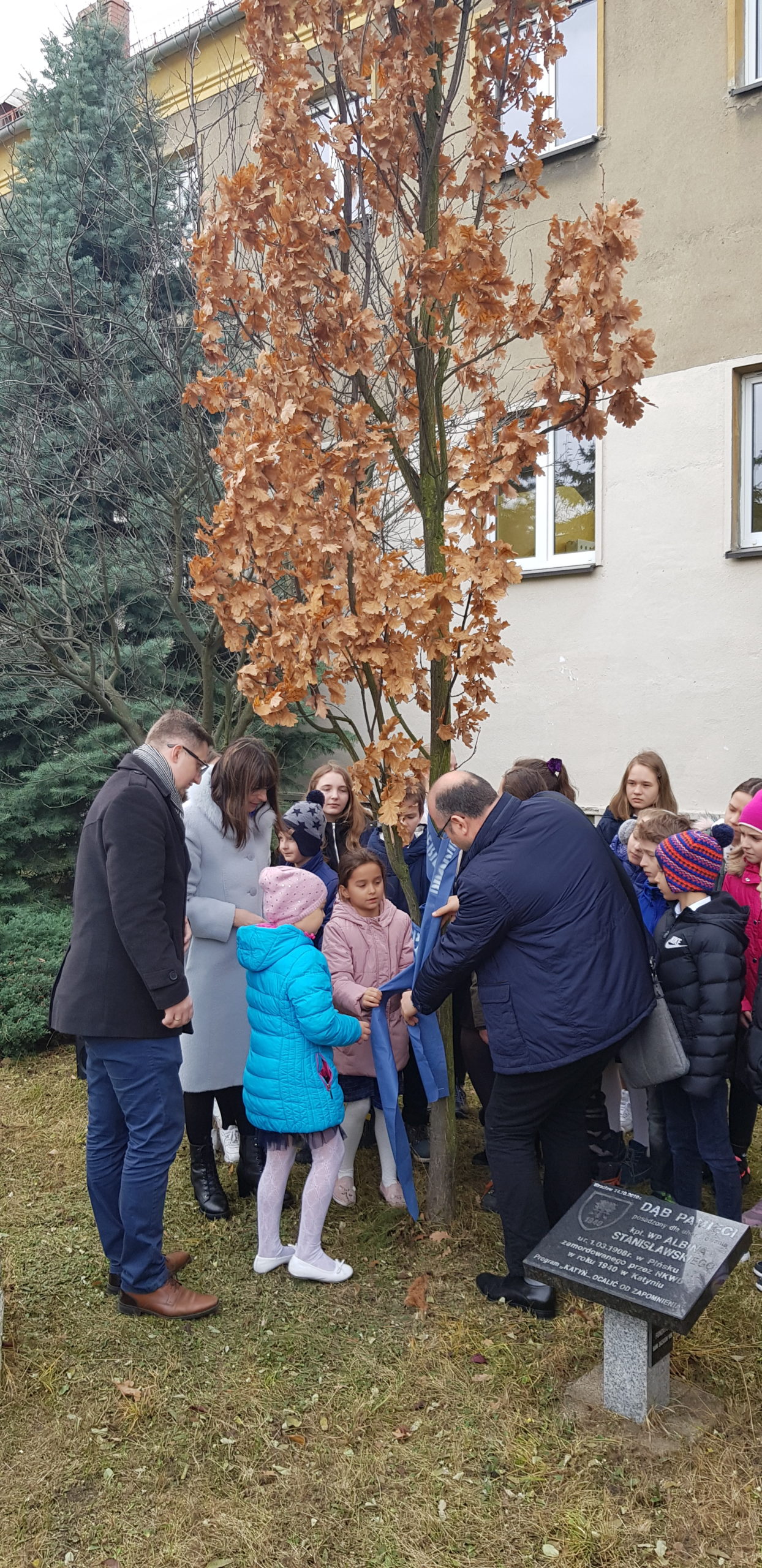 Po części oficjalnej zgromadzeni udali się przed szkołę, gdzie uroczyście nadali dębowi imię Staszek i opasali go niebieską wstążką. Wspólne zdjęcie upamiętniło tę wyjątkową chwilę.