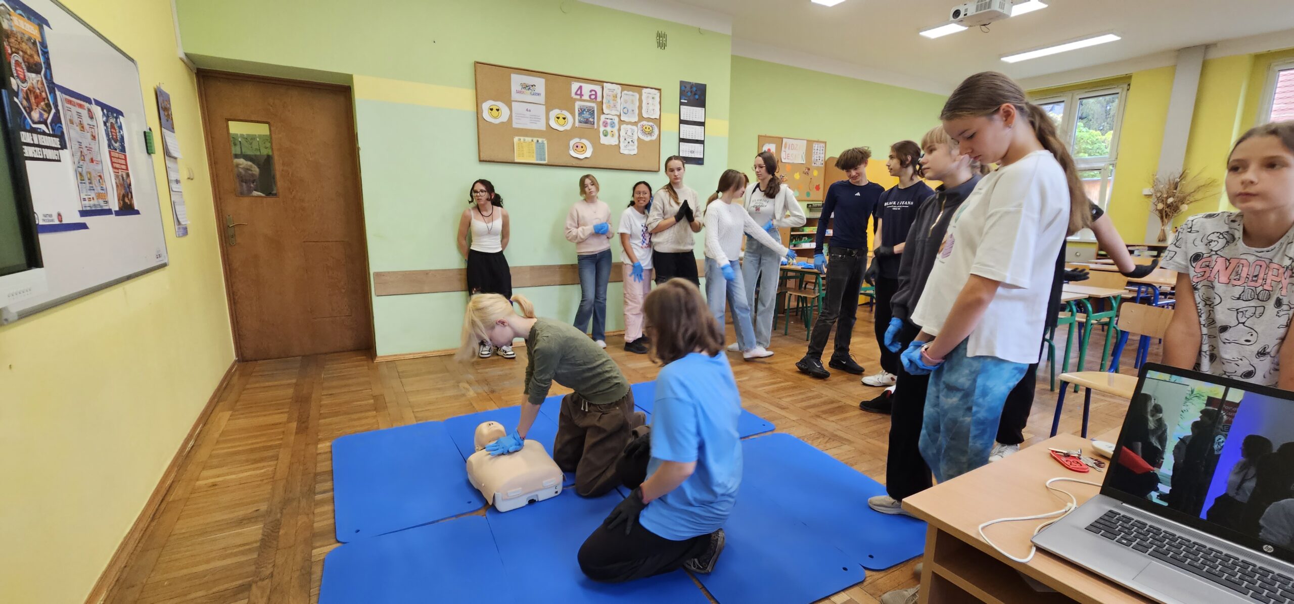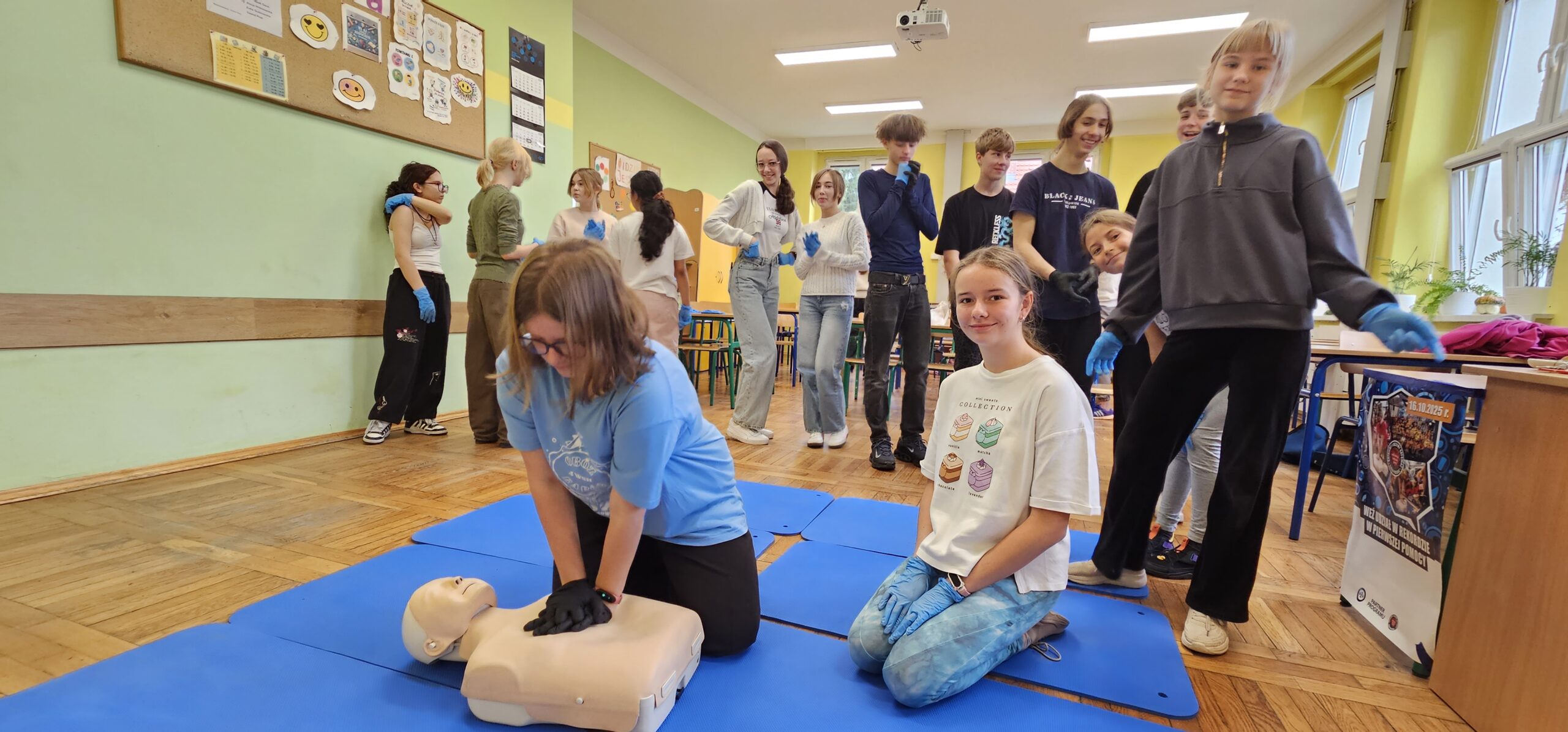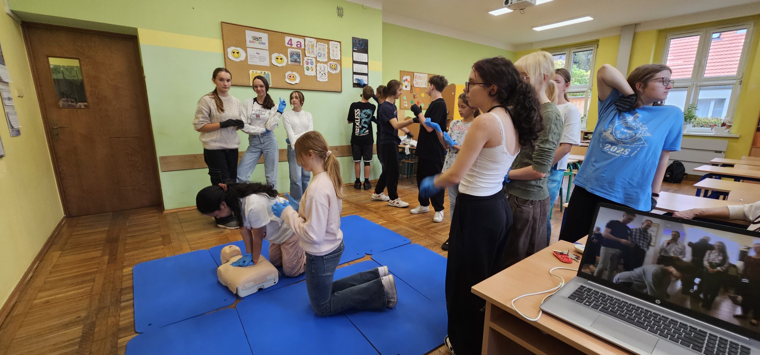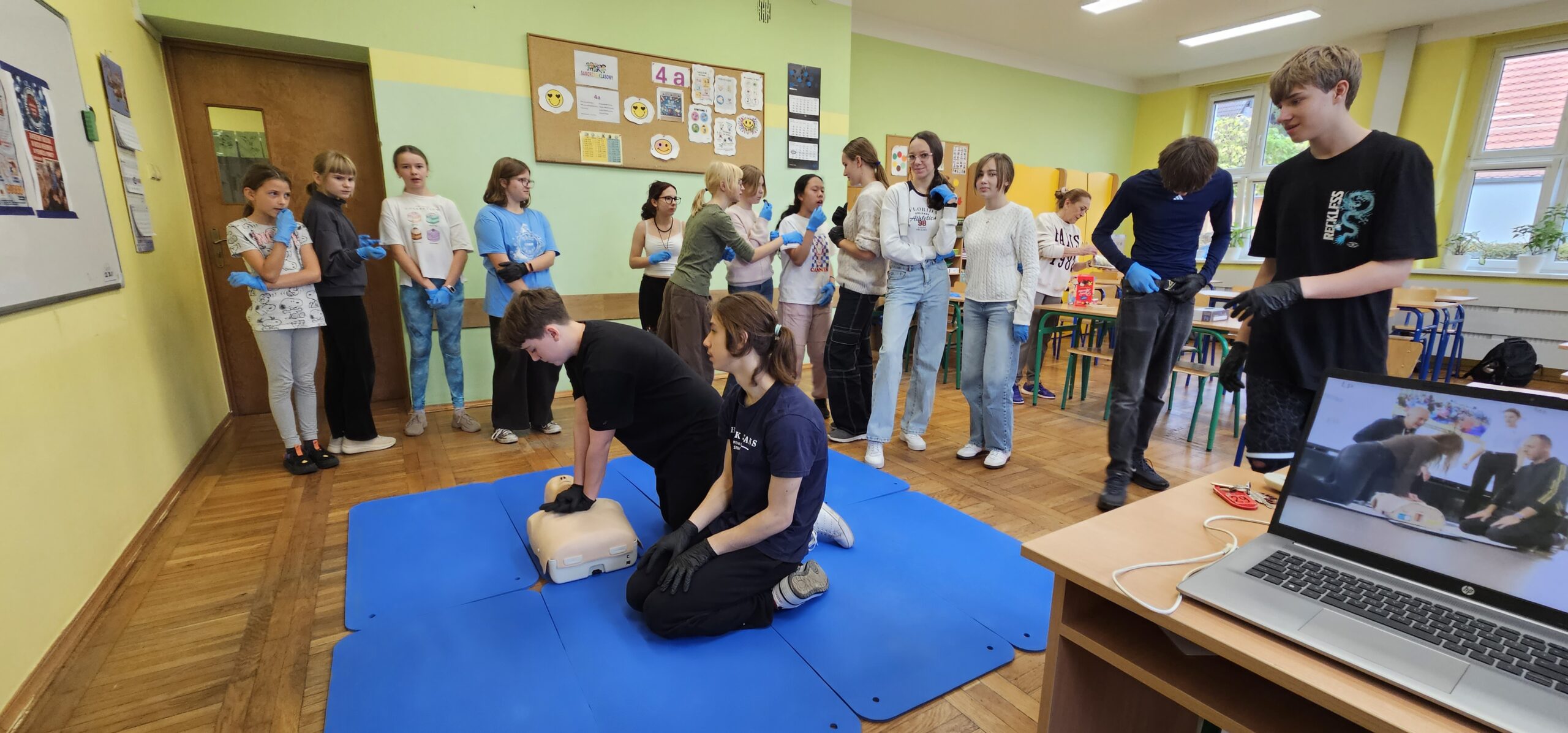 Tego dnia uczniowie klas 4a, 8a, 8b i 8c – pod opieką nauczycielki, p. Anety Stec – ćwiczyli resuscytację krążeniowo-oddechową (RKO), ucząc się, jak ratować ludzkie życie.