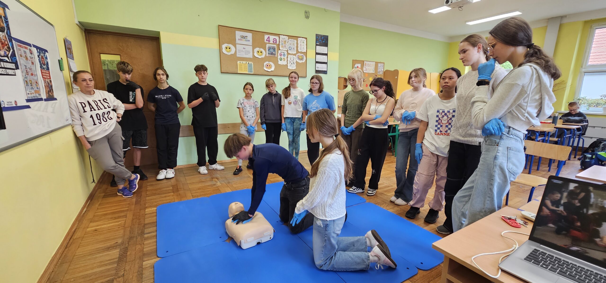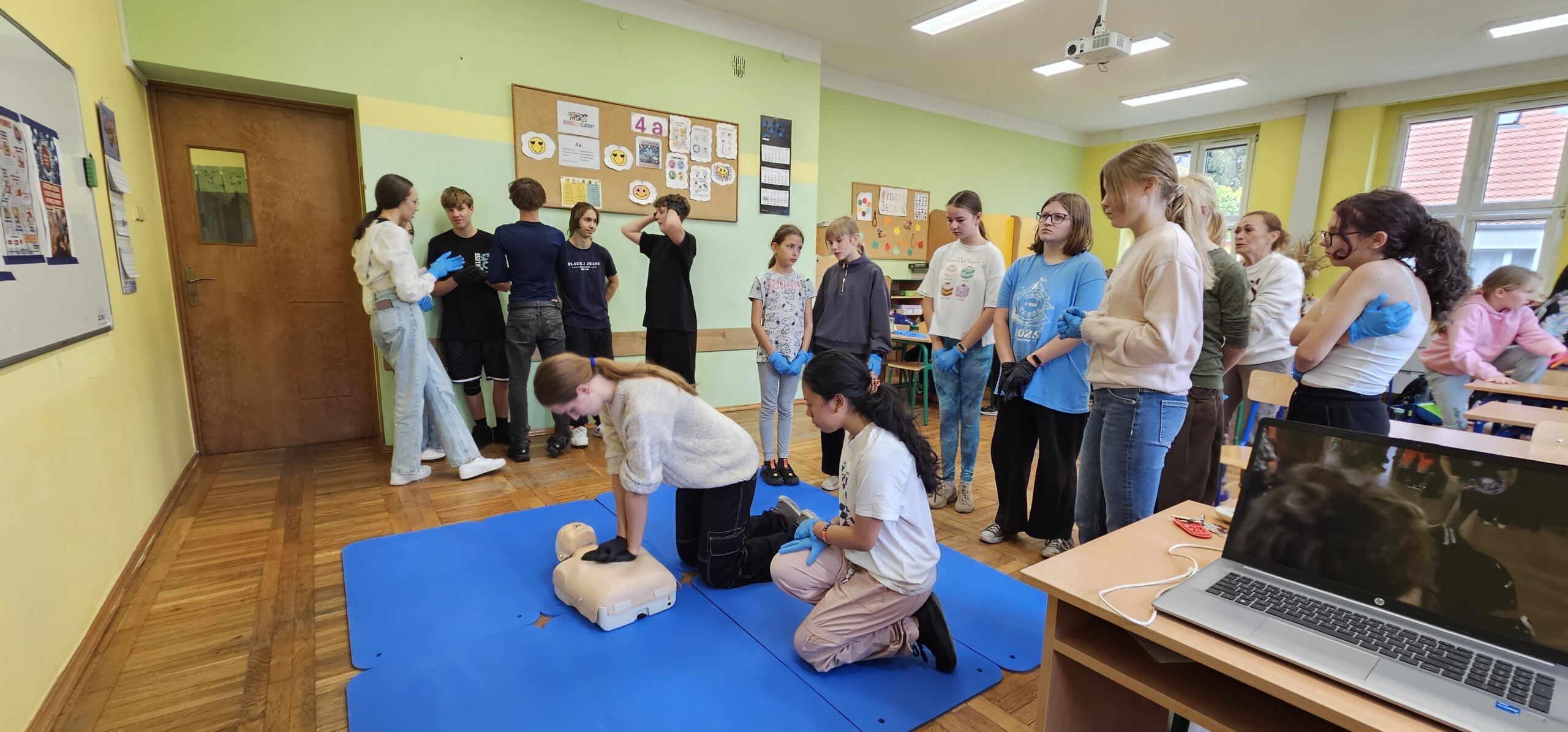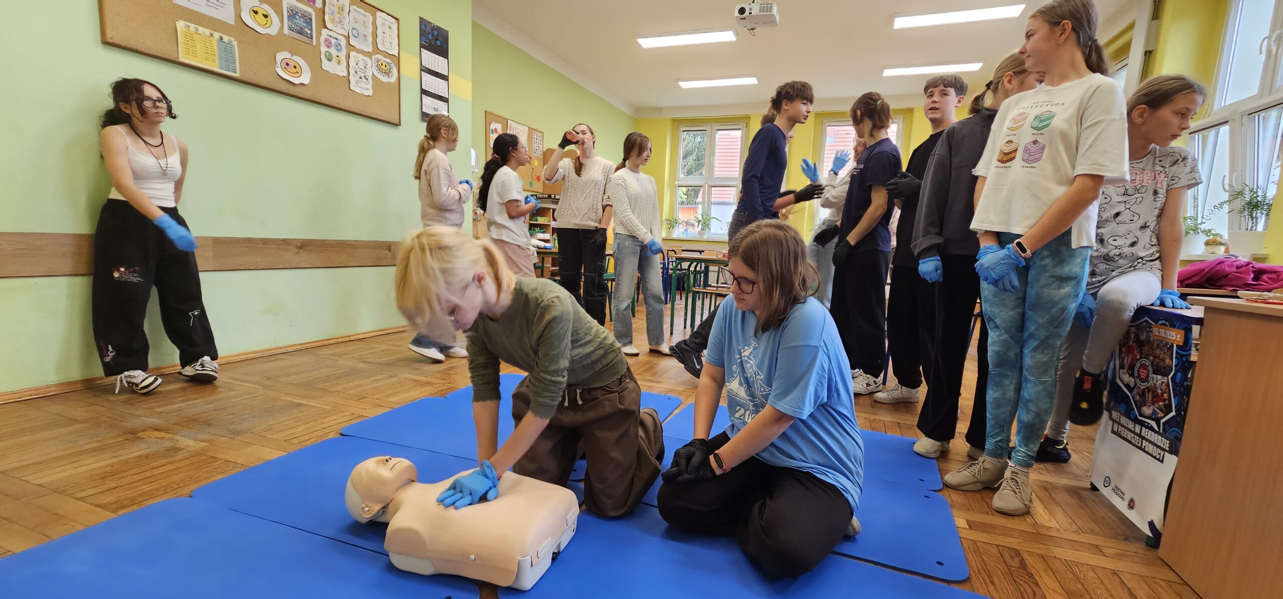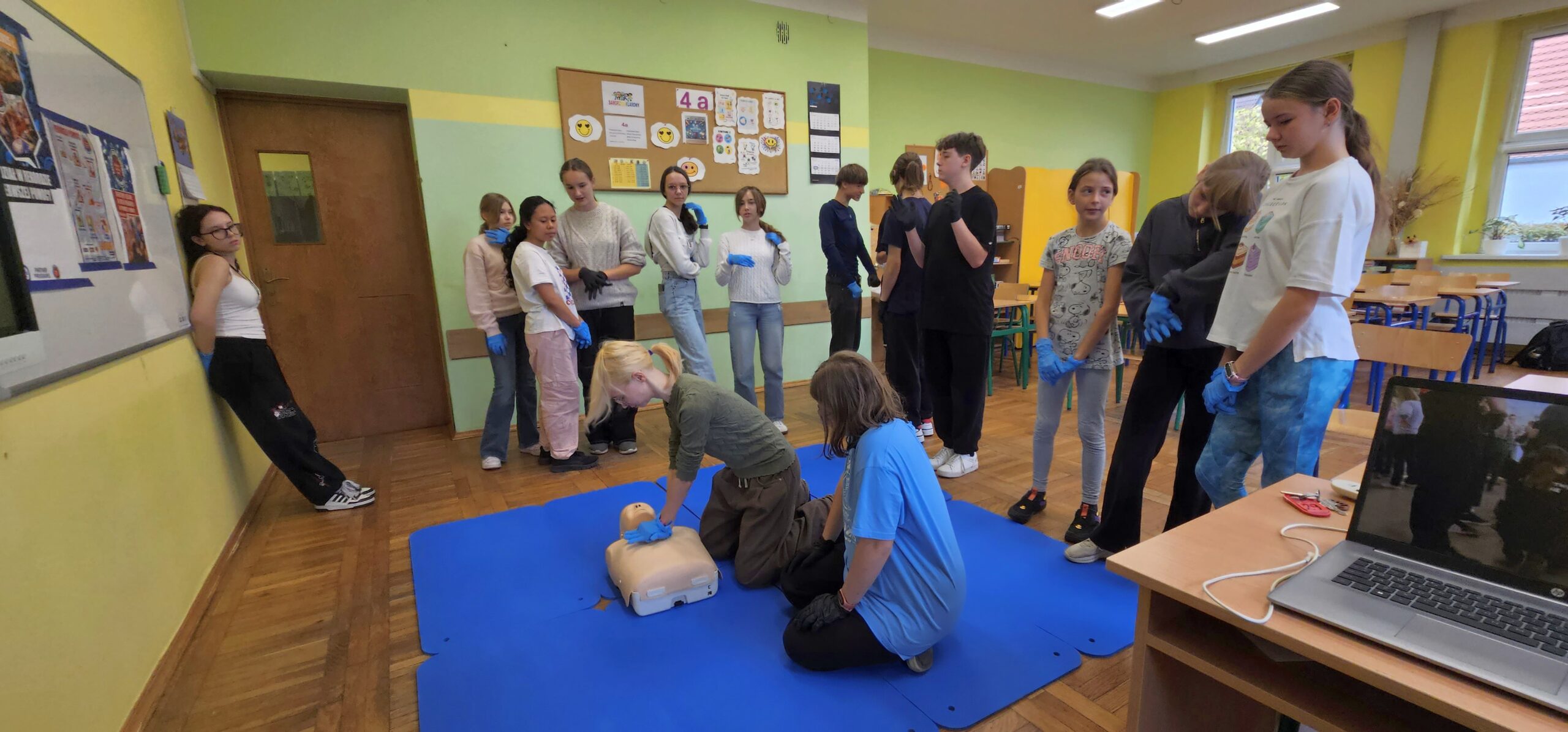 Tego dnia uczniowie klas 4a, 8a, 8b i 8c – pod opieką nauczycielki, p. Anety Stec – ćwiczyli resuscytację krążeniowo-oddechową (RKO), ucząc się, jak ratować ludzkie życie.