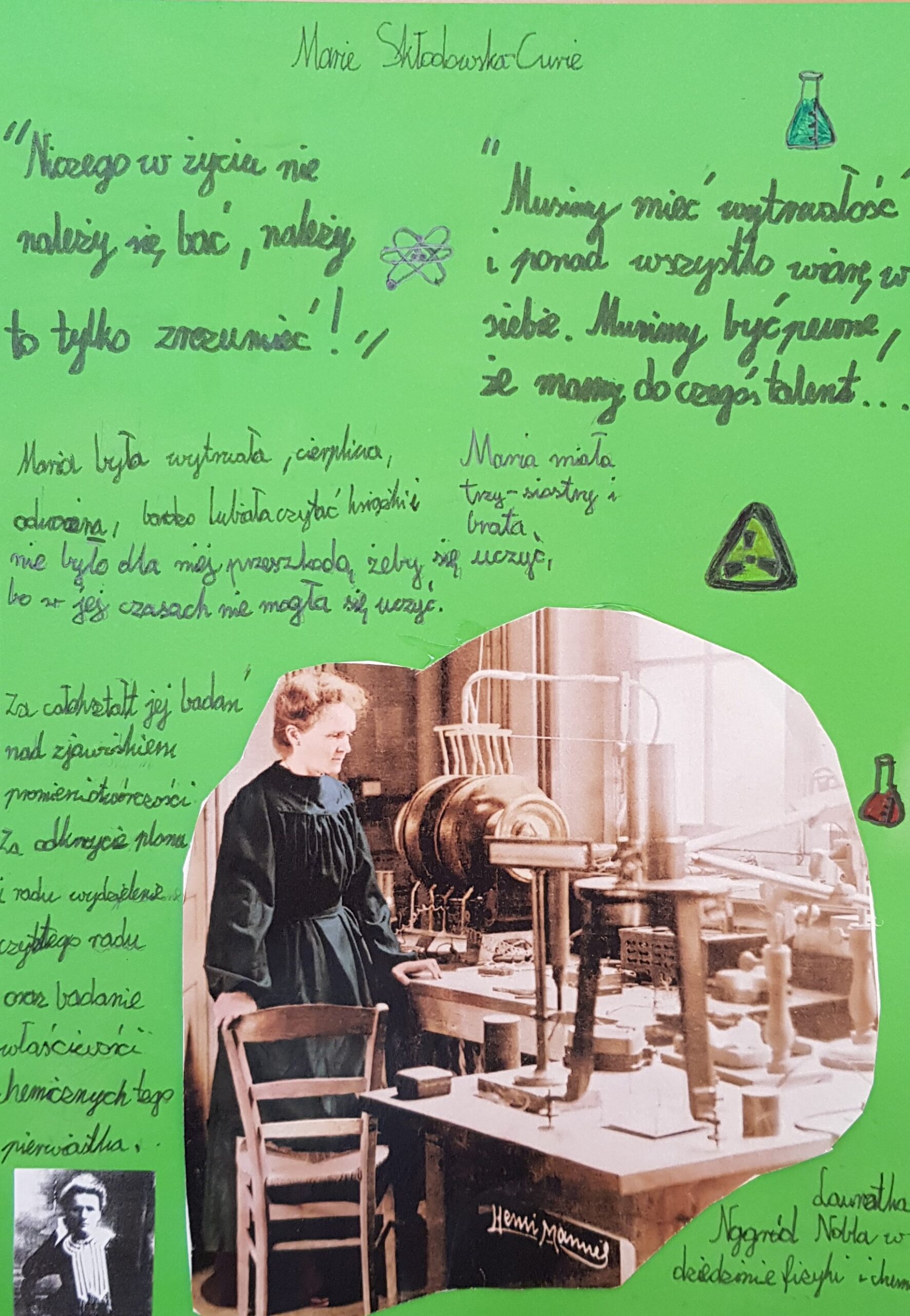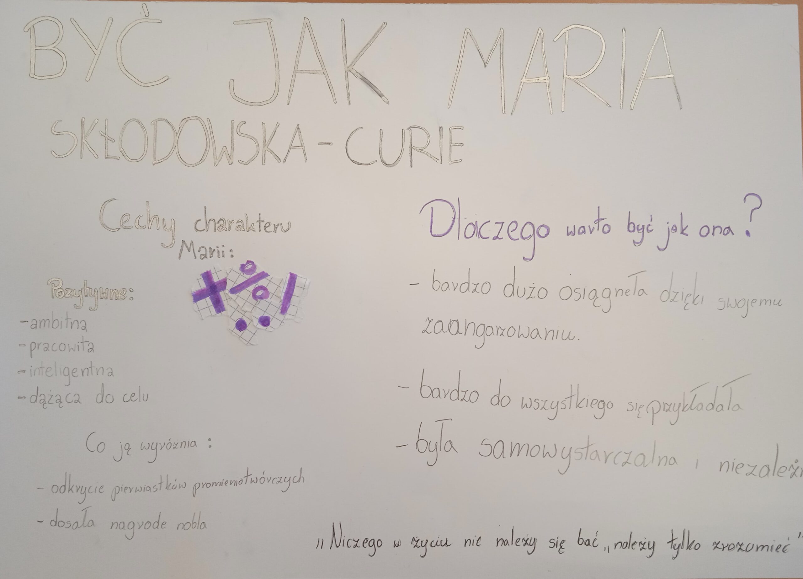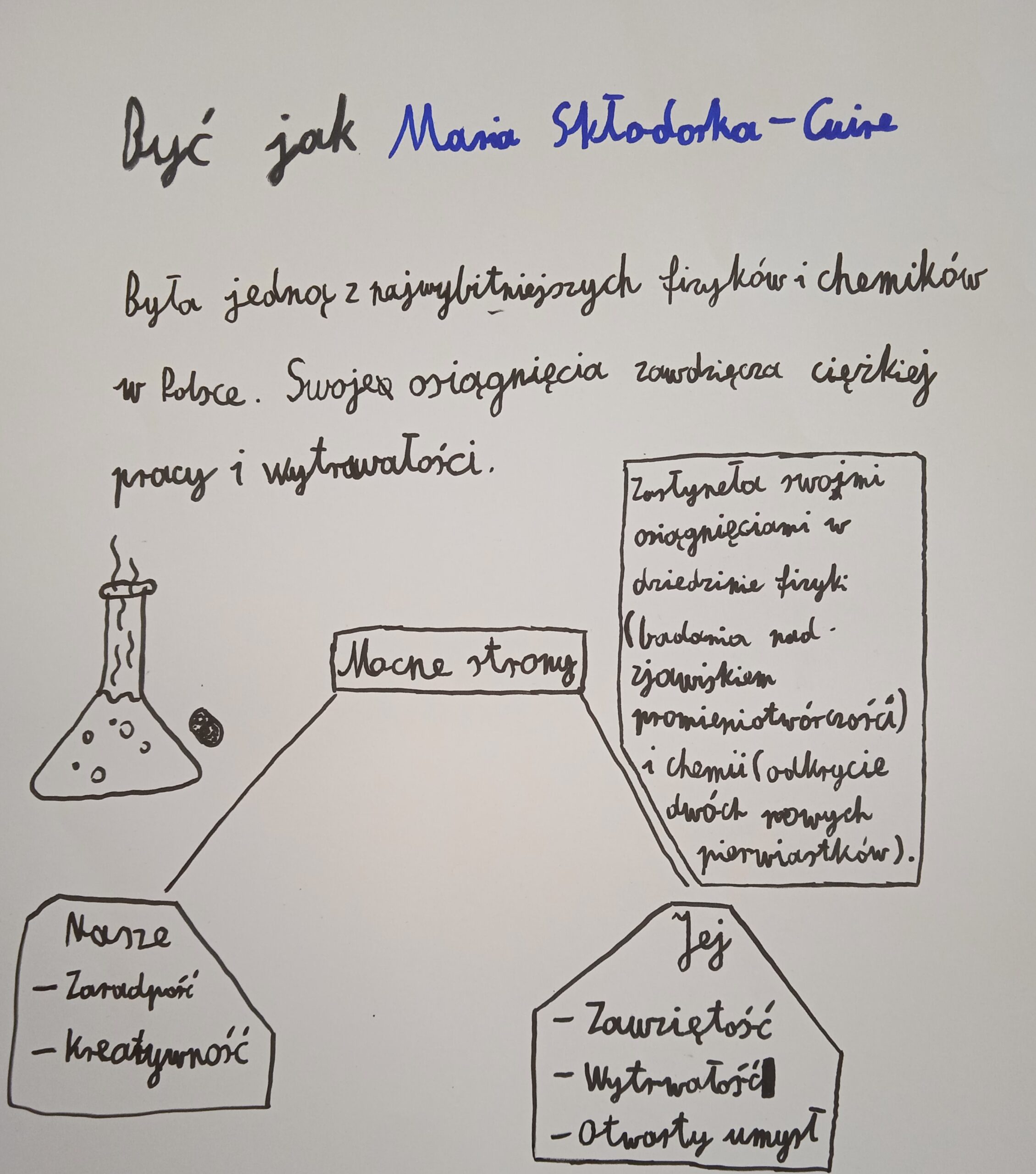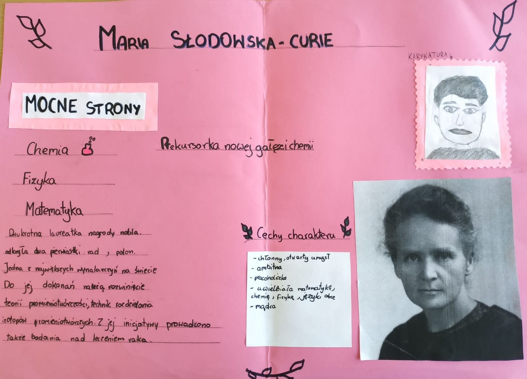 Wykonanie zadania konkursowego należało do uczniów klas siódmych. Wzięli w nim udział także inni uczniowie. Celem była prezentacja sylwetek Polek i Polaków wyróżniających się w przedmiotach ścisłych, poszukiwanie ich oraz swoich mocnych stron, które pomogą odnieść sukces. Prezentujemy prace uczniów w galerii pod tytułem: “Być jak…”.
