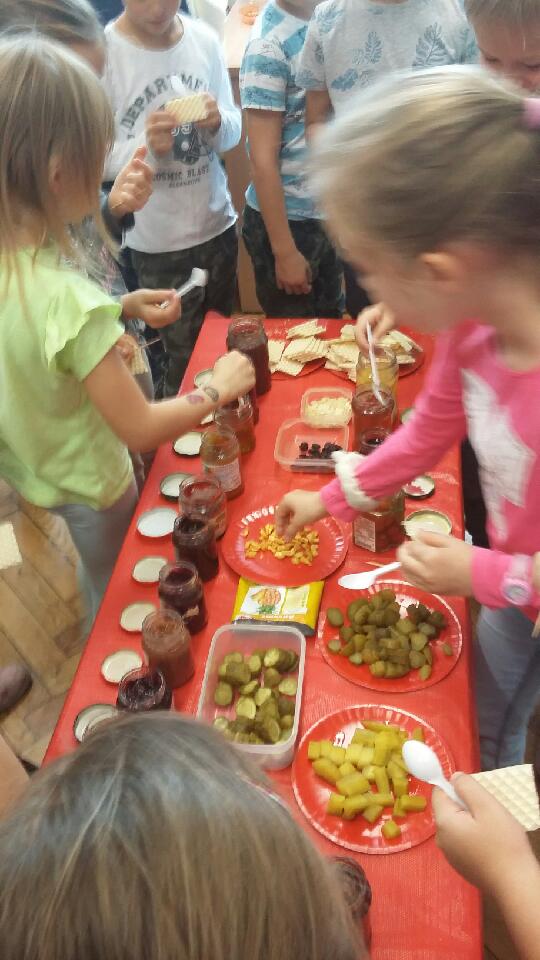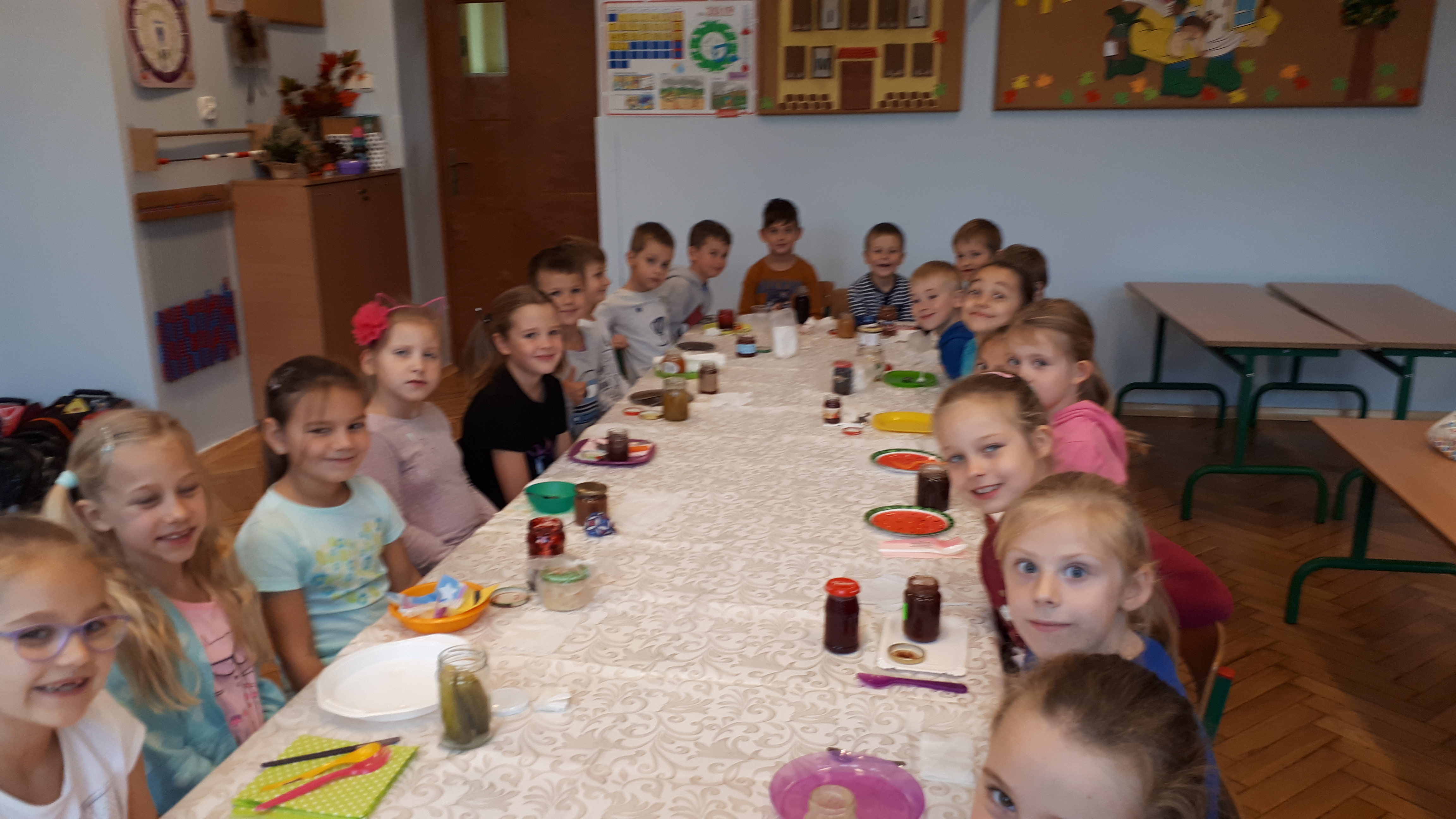 W październiku uczniowie klas 1b i 1c rozmawiali o darach jesieni. Jedna z lekcji dotyczyła przetworów czyli skarbów jesieni zamkniętych w słoikach. Dzieci dowiedziały się w jaki sposób otrzymuje się przetwory oraz z jakich warzyw i owoców się je robi. Kolejnym etapem zajęć była degustacja przetworów domowych były to: dżemy, konfitury, pikle, kiszonki, soki itp. – które wspaniale smakowały. Dzieci uświadomiły sobie potrzebę robienia zapasów na zimę. I poznały sprytny sposób „schowania lata do słoika”.