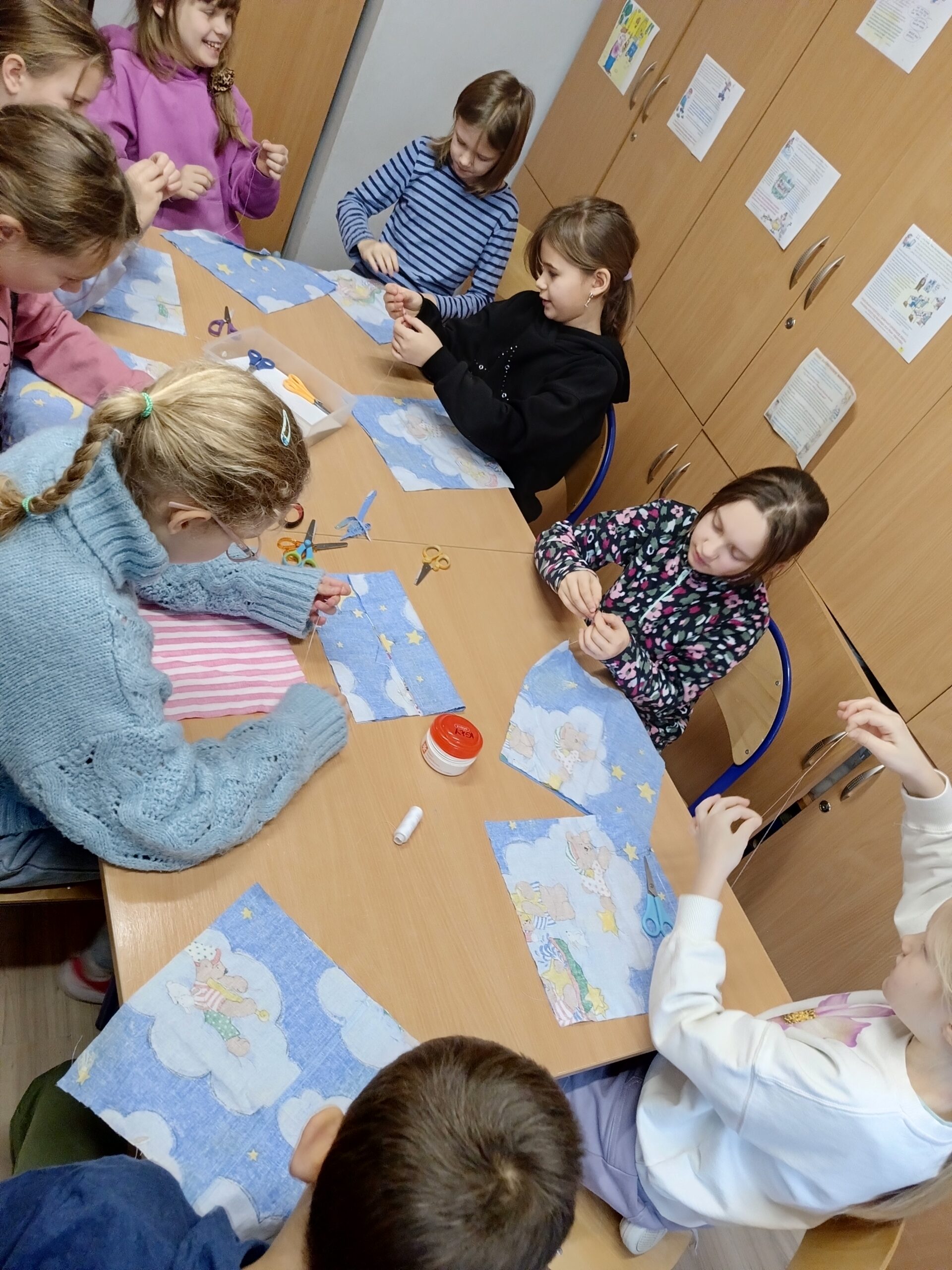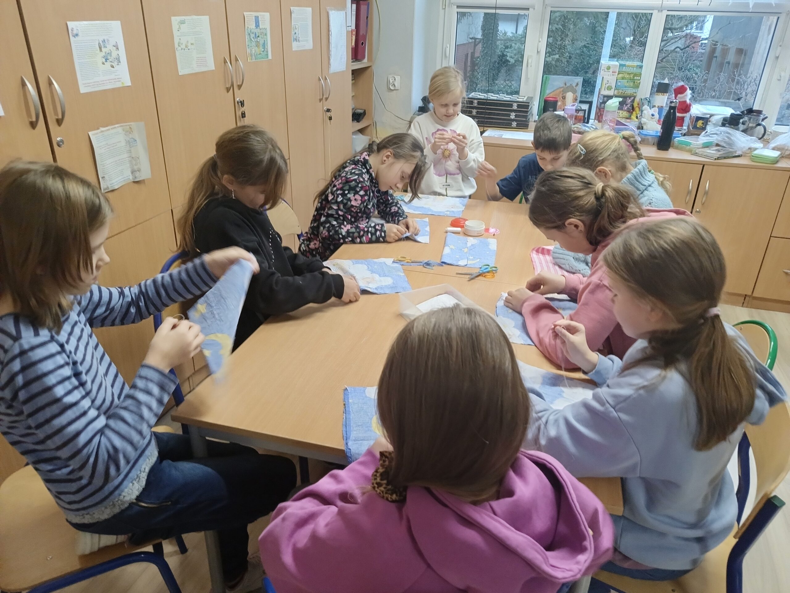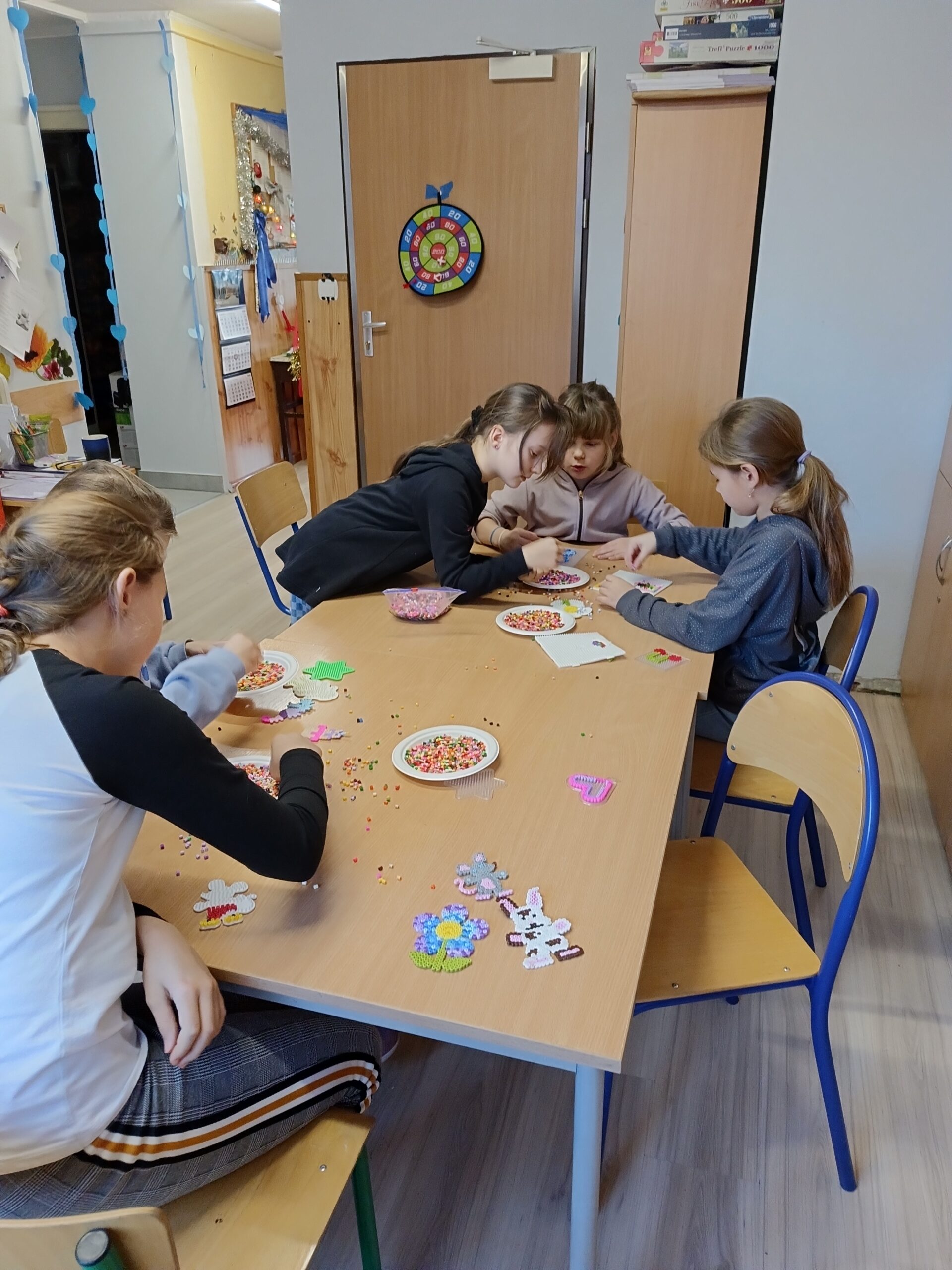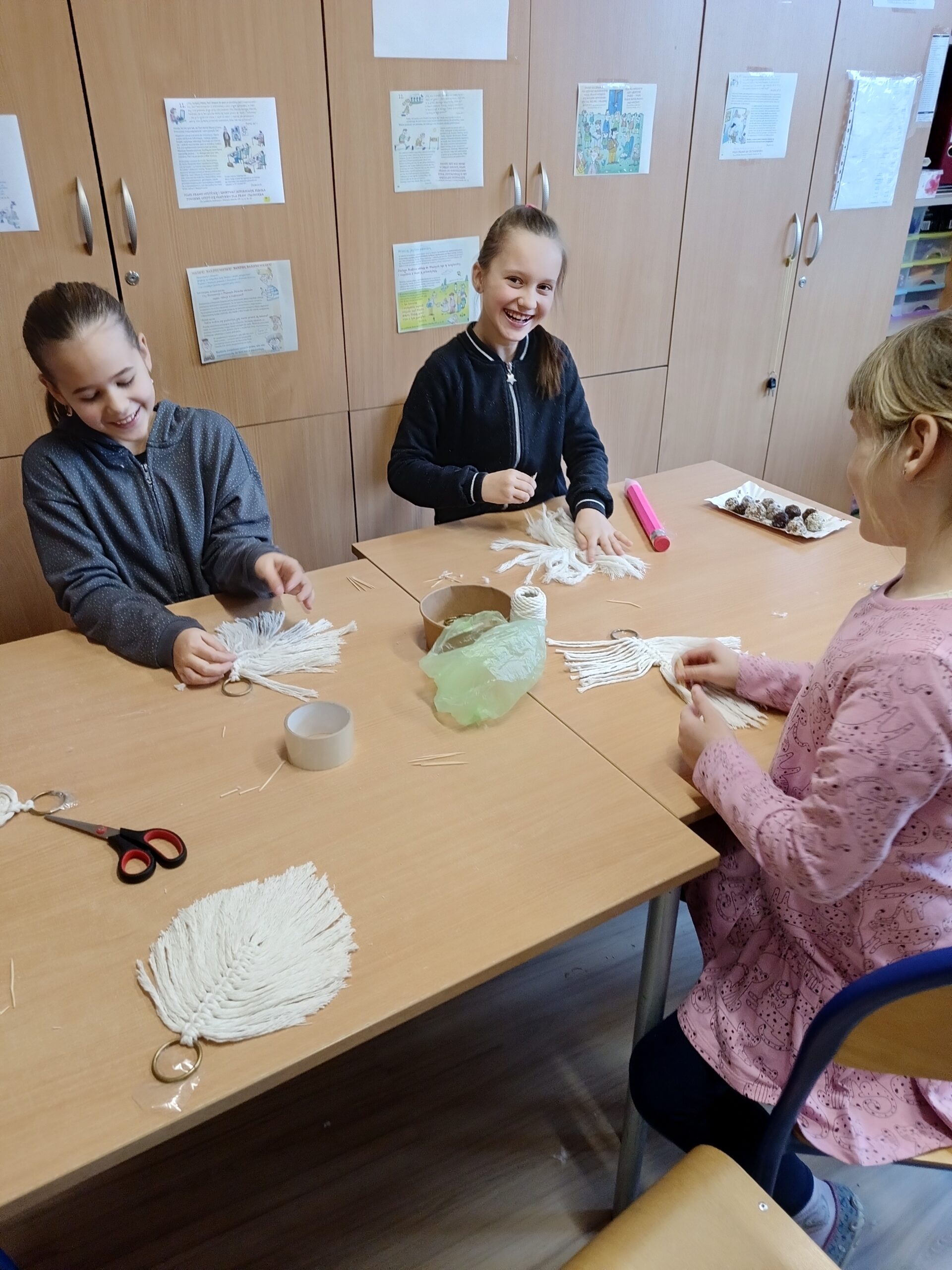 Co robiliśmy w tym semestrze: przestrzenne drzewa z papieru, rękę 3D w ołówku, bransoletki z kolorowych koralików, ozdoby na kiermasz świąteczny, gwiazdy z torebek śniadaniowych, obrazki z koralików zgrzewanych, breloki makramowe, wykonaliśmy również fotobudkę na Dzień Życzliwości. Obecnie szyjemy ręcznie poduszki.