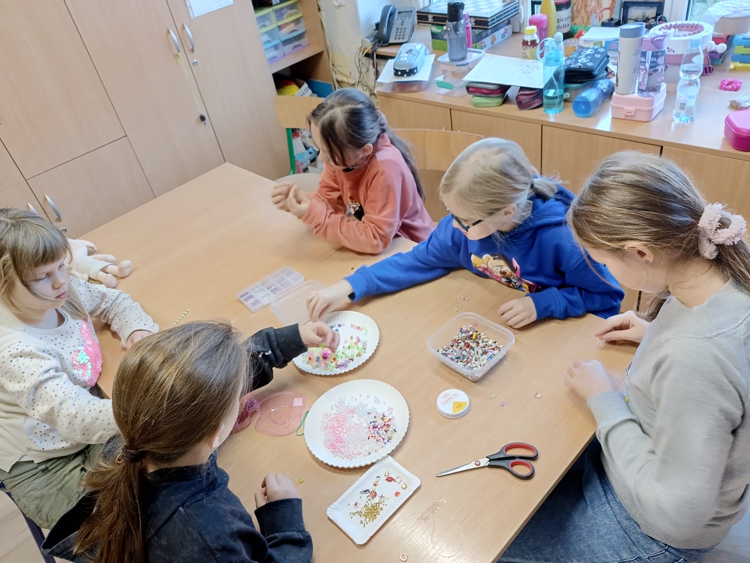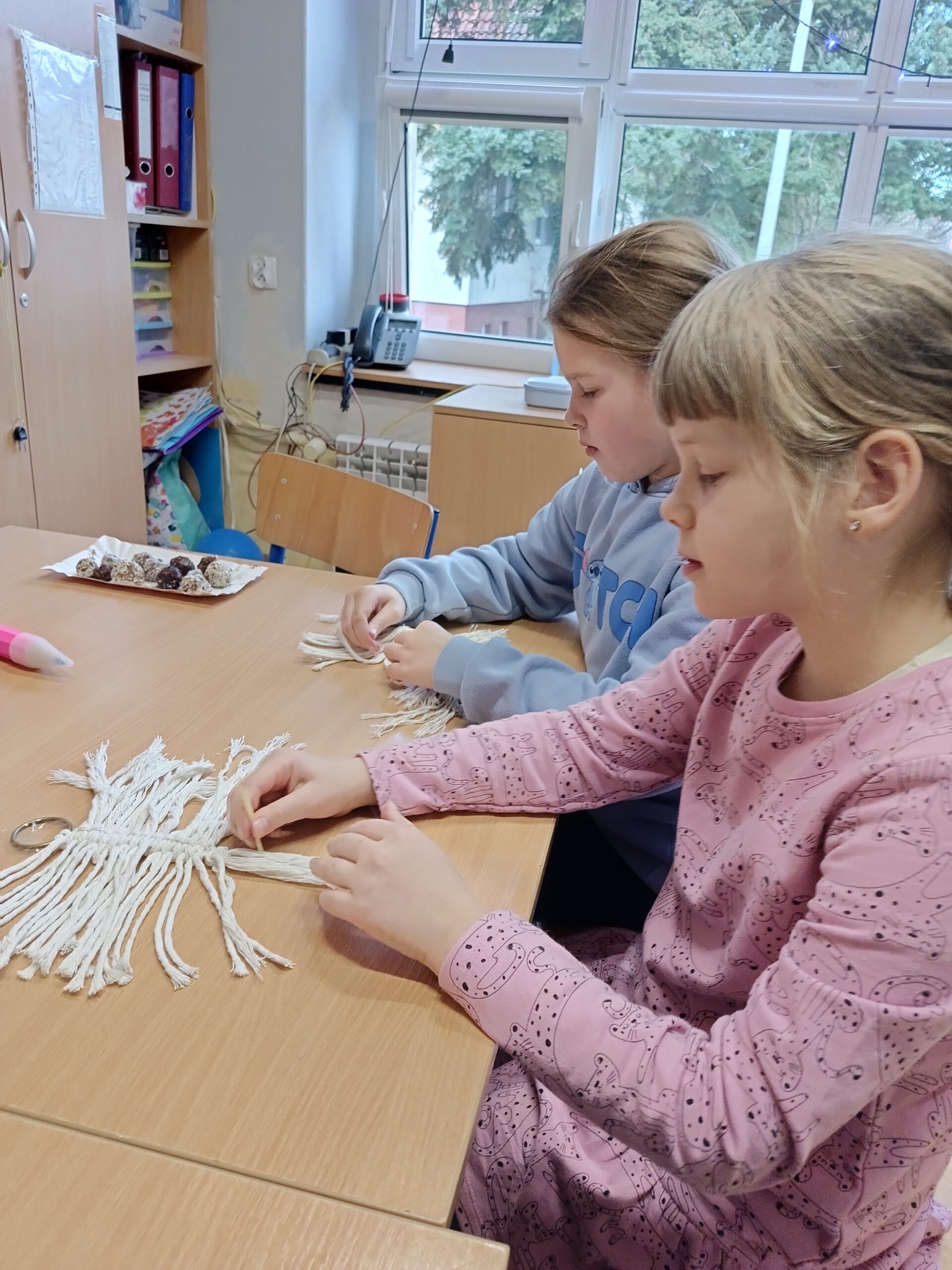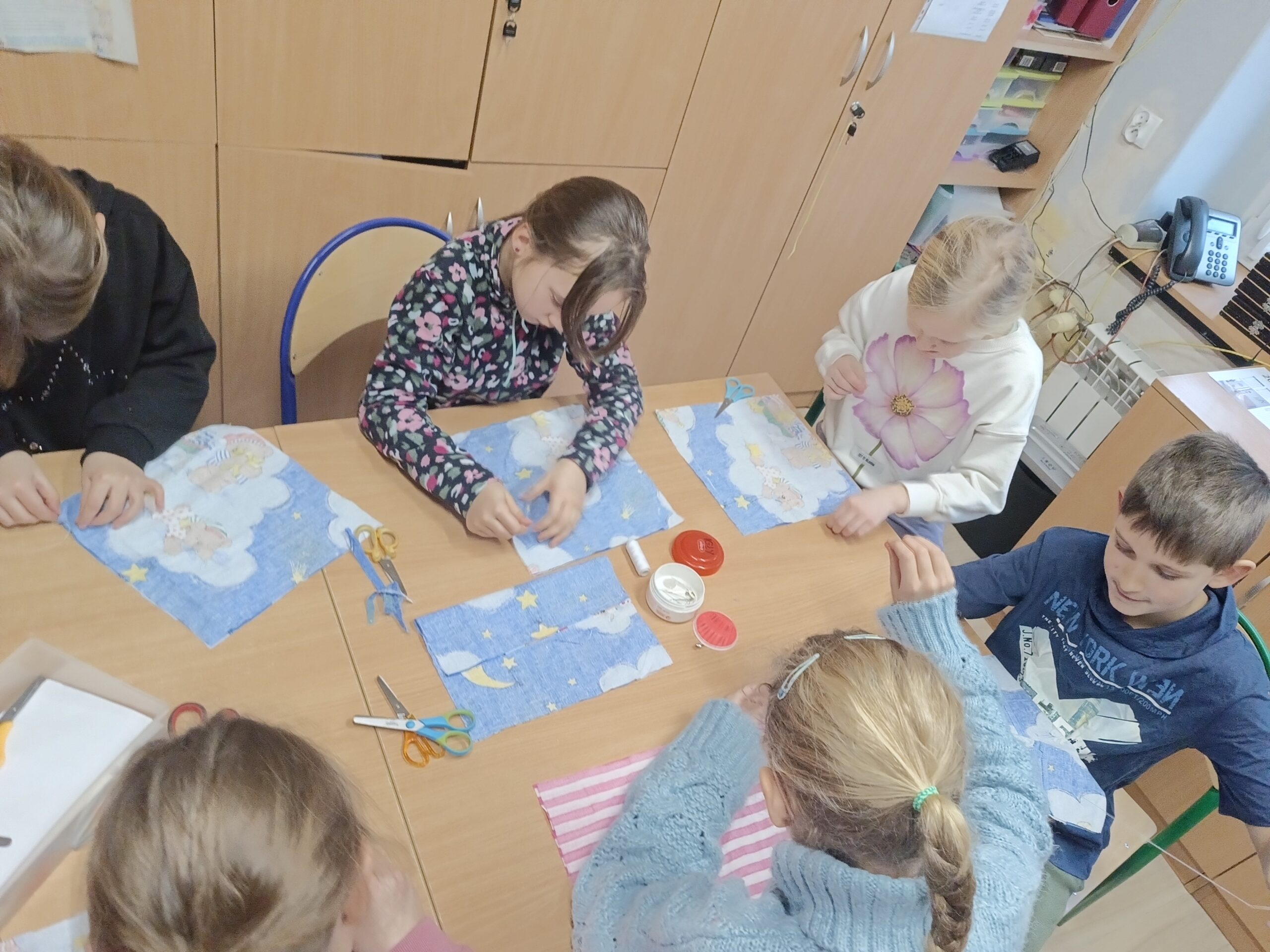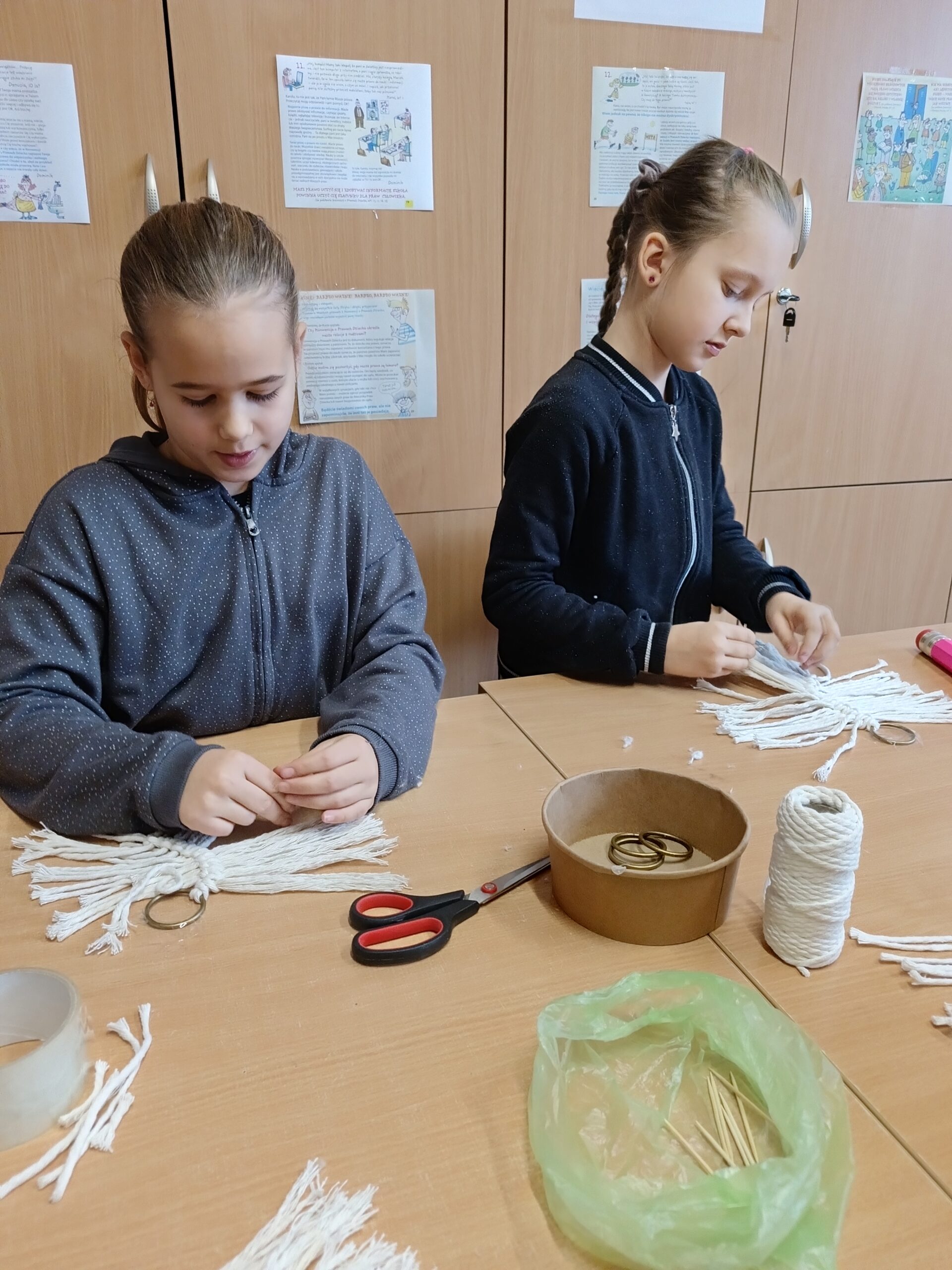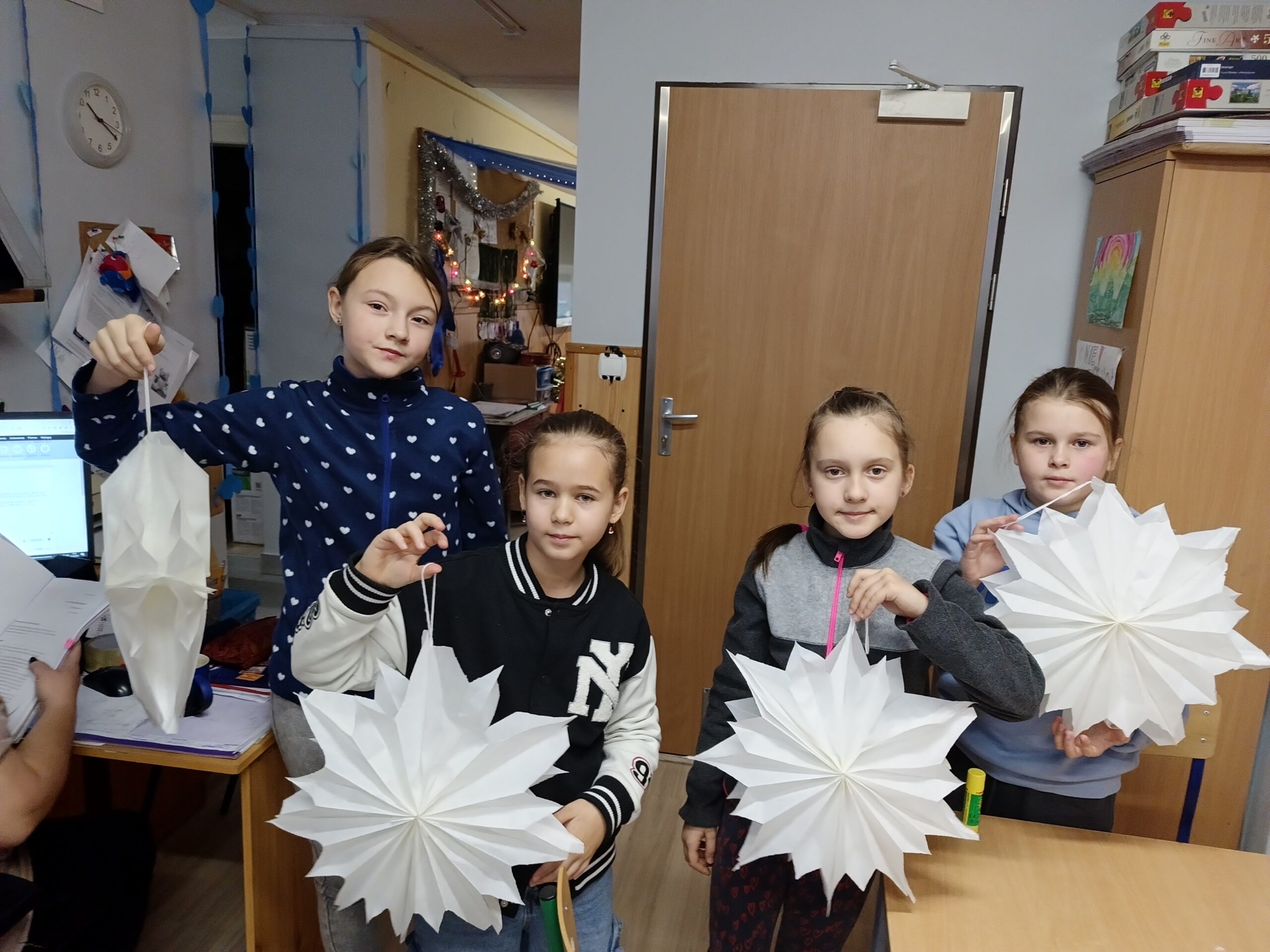 Co robiliśmy w tym semestrze: przestrzenne drzewa z papieru, rękę 3D w ołówku, bransoletki z kolorowych koralików, ozdoby na kiermasz świąteczny, gwiazdy z torebek śniadaniowych, obrazki z koralików zgrzewanych, breloki makramowe, wykonaliśmy również fotobudkę na Dzień Życzliwości. Obecnie szyjemy ręcznie poduszki.