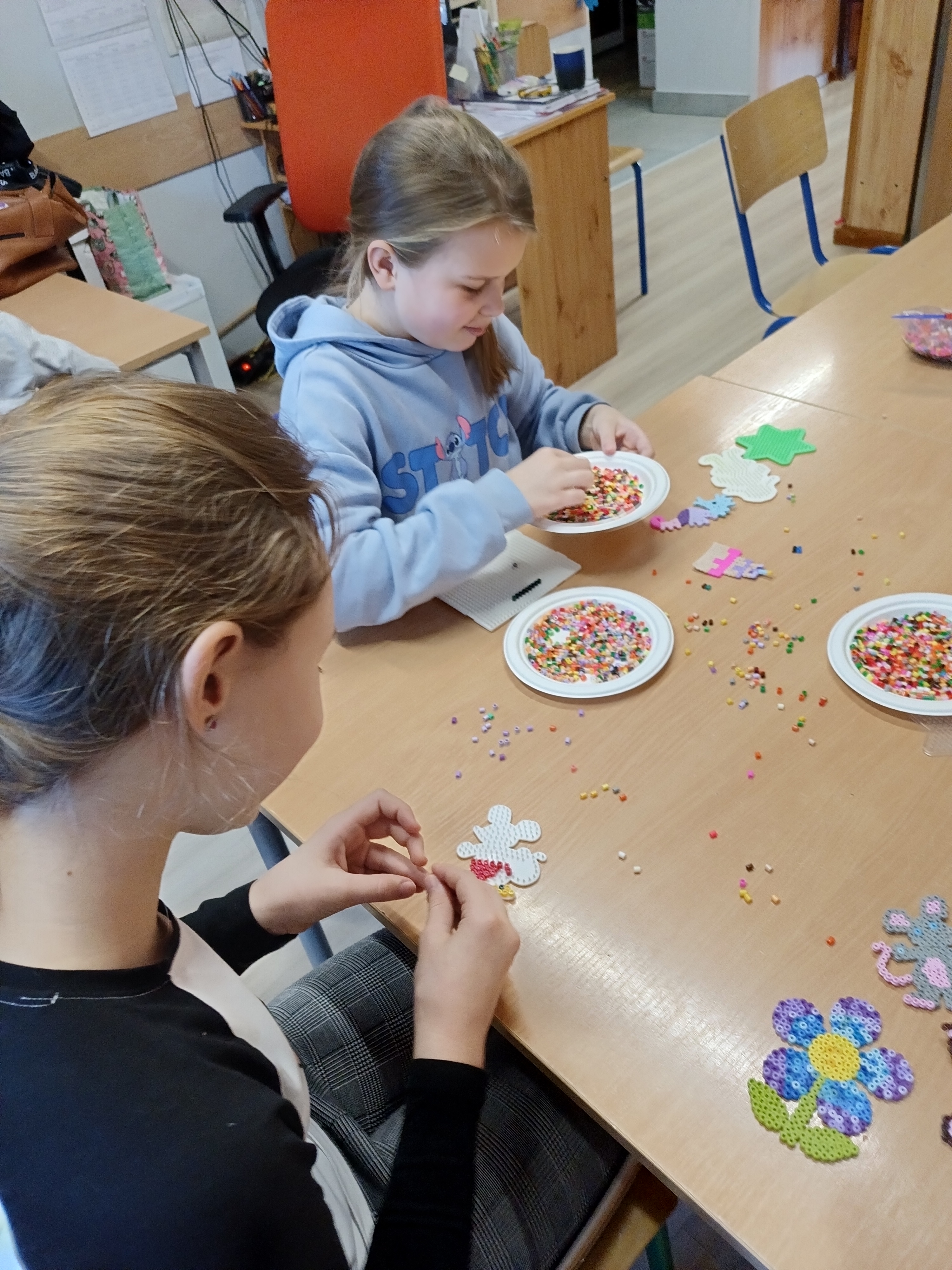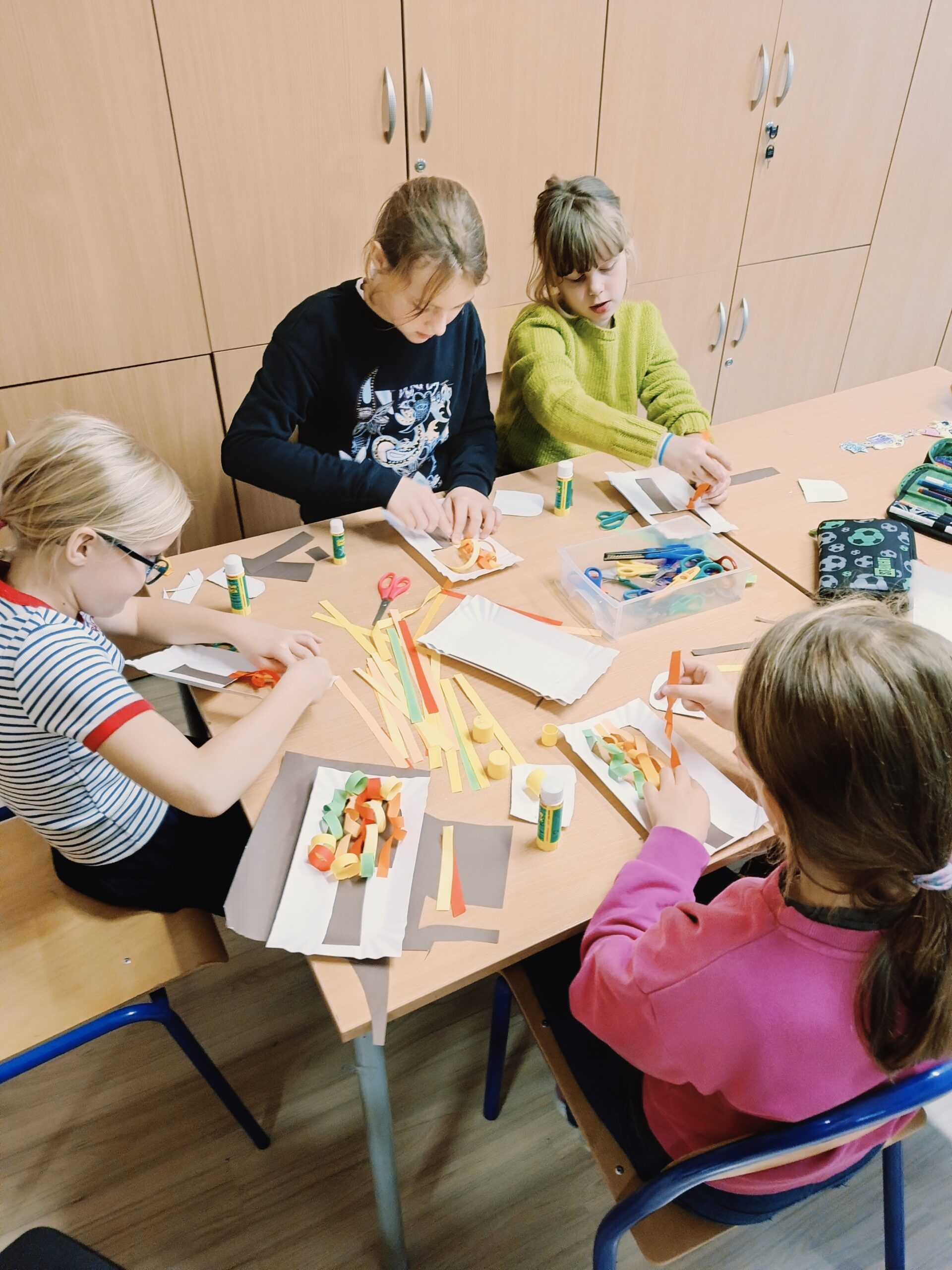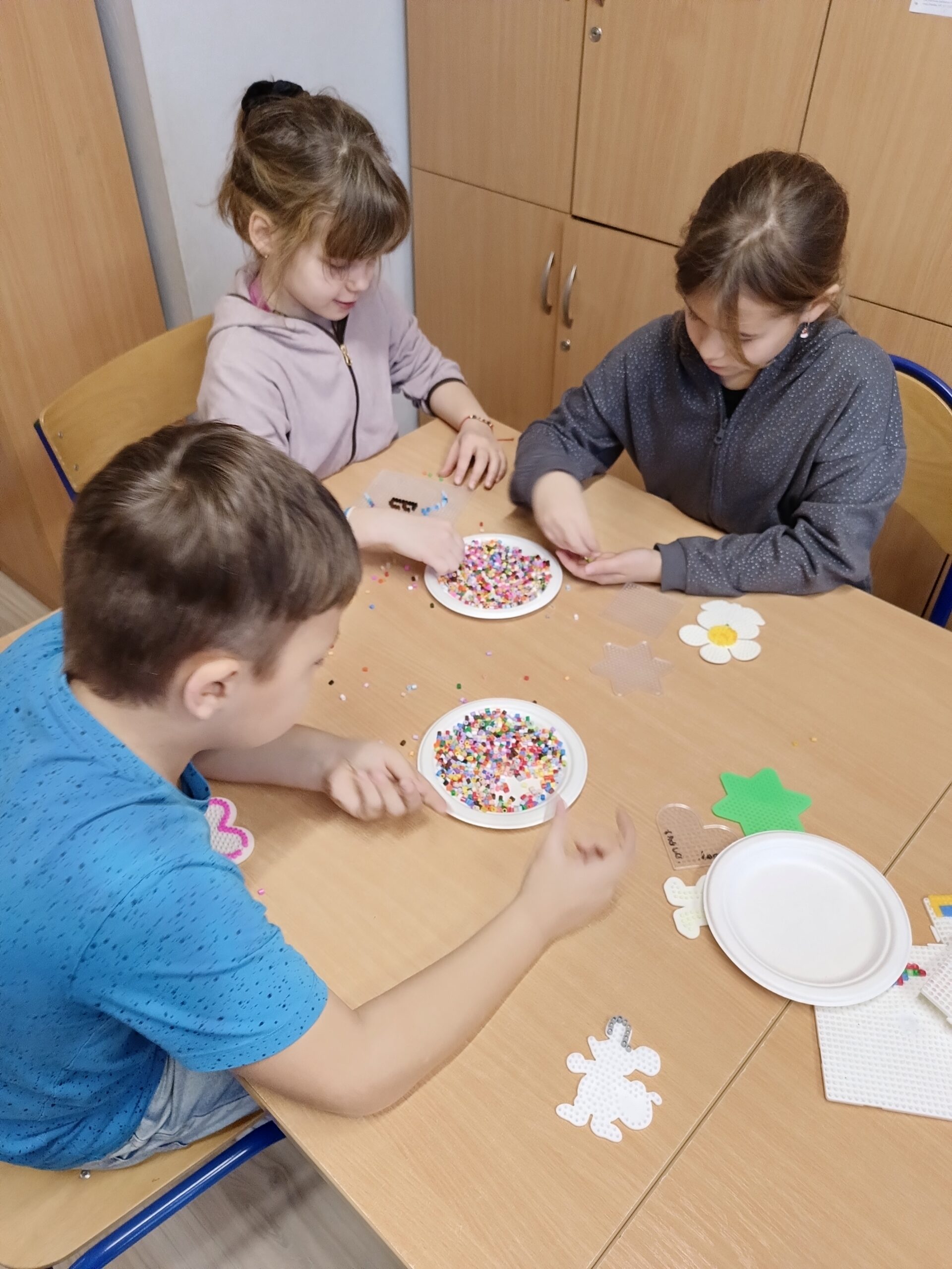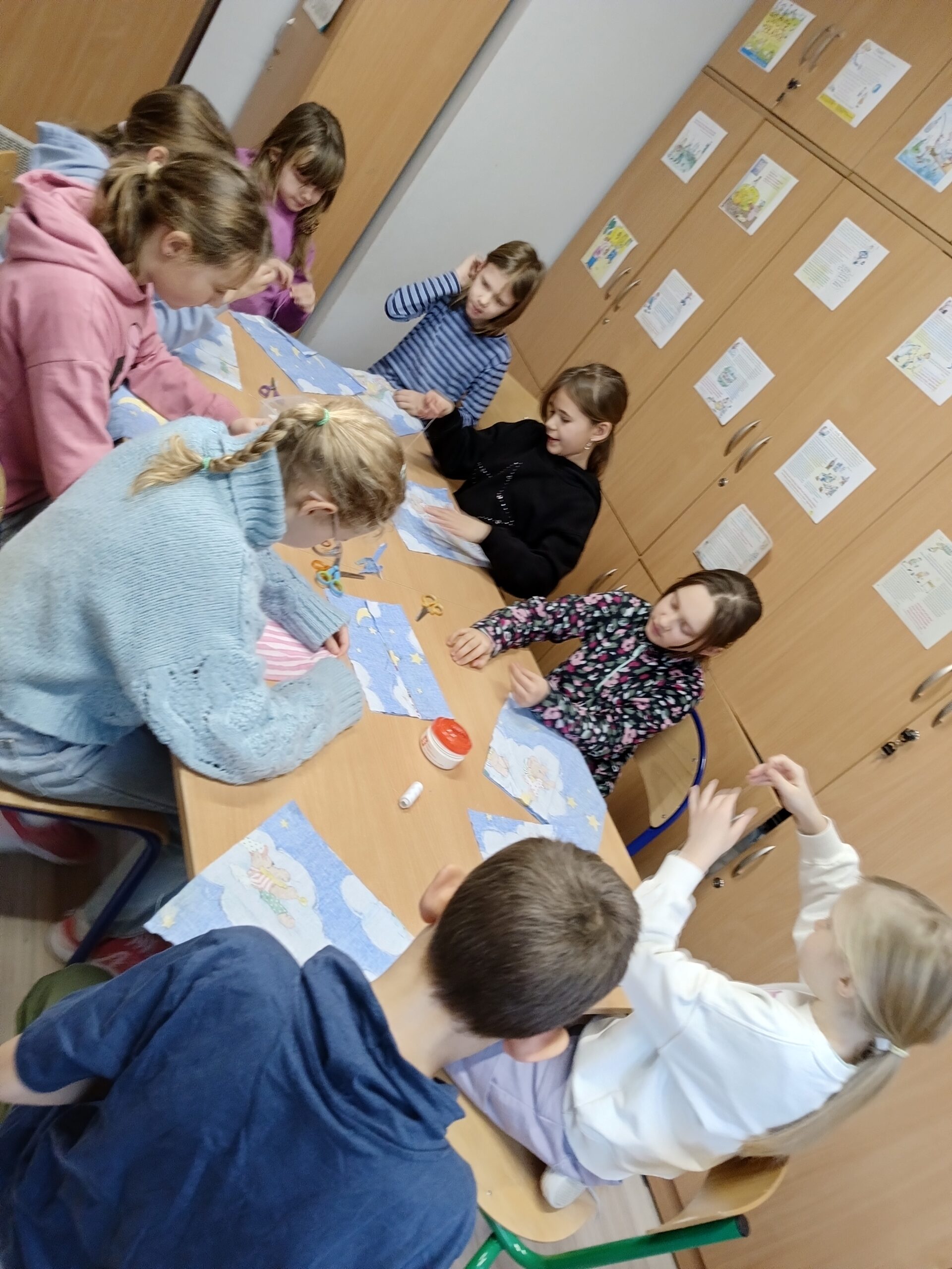 Co robiliśmy w tym semestrze: przestrzenne drzewa z papieru, rękę 3D w ołówku, bransoletki z kolorowych koralików, ozdoby na kiermasz świąteczny, gwiazdy z torebek śniadaniowych, obrazki z koralików zgrzewanych, breloki makramowe, wykonaliśmy również fotobudkę na Dzień Życzliwości. Obecnie szyjemy ręcznie poduszki.