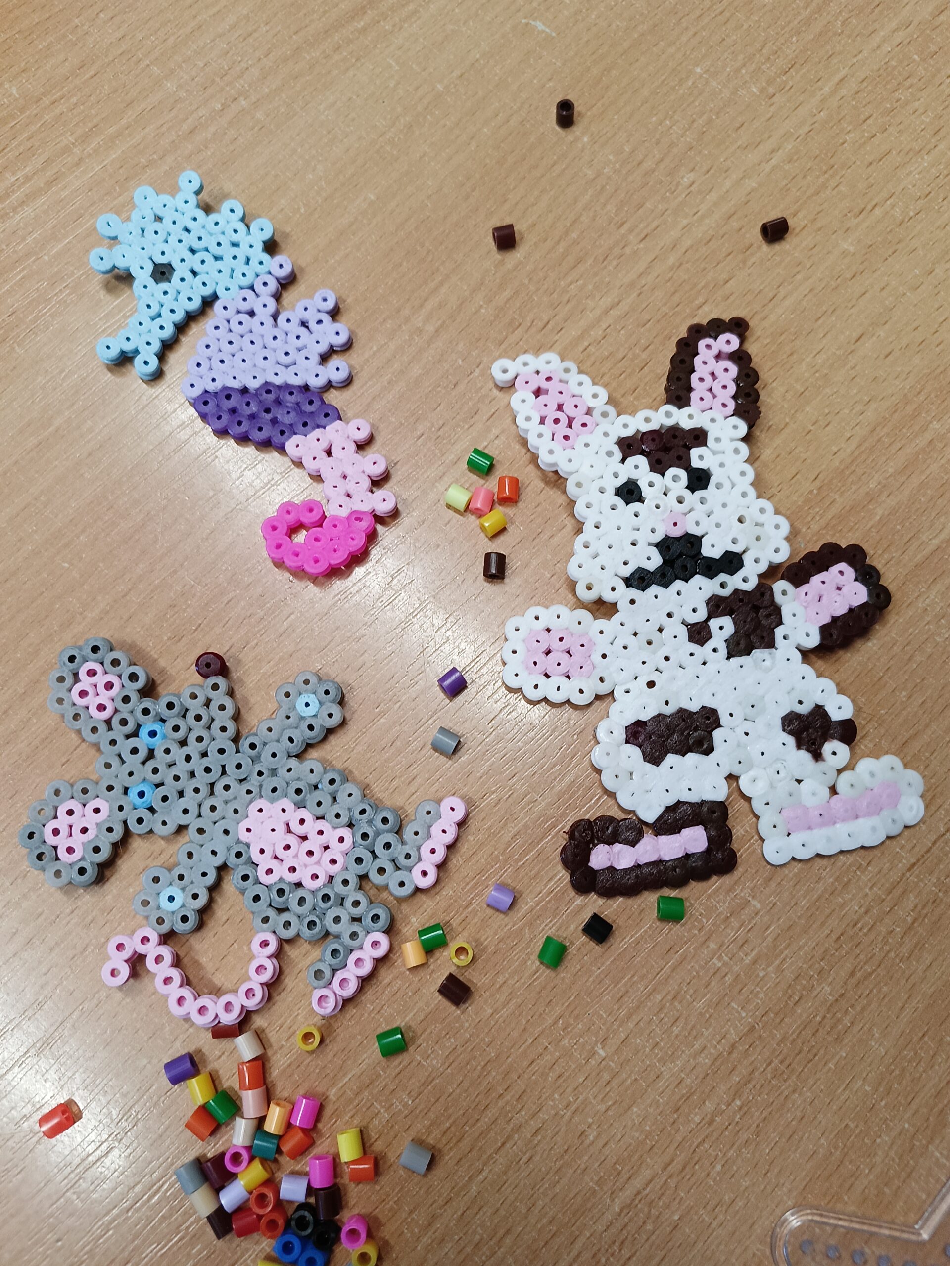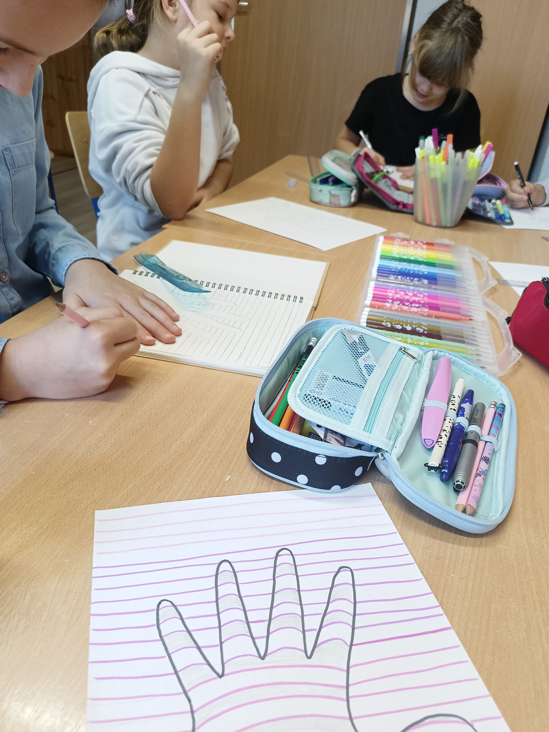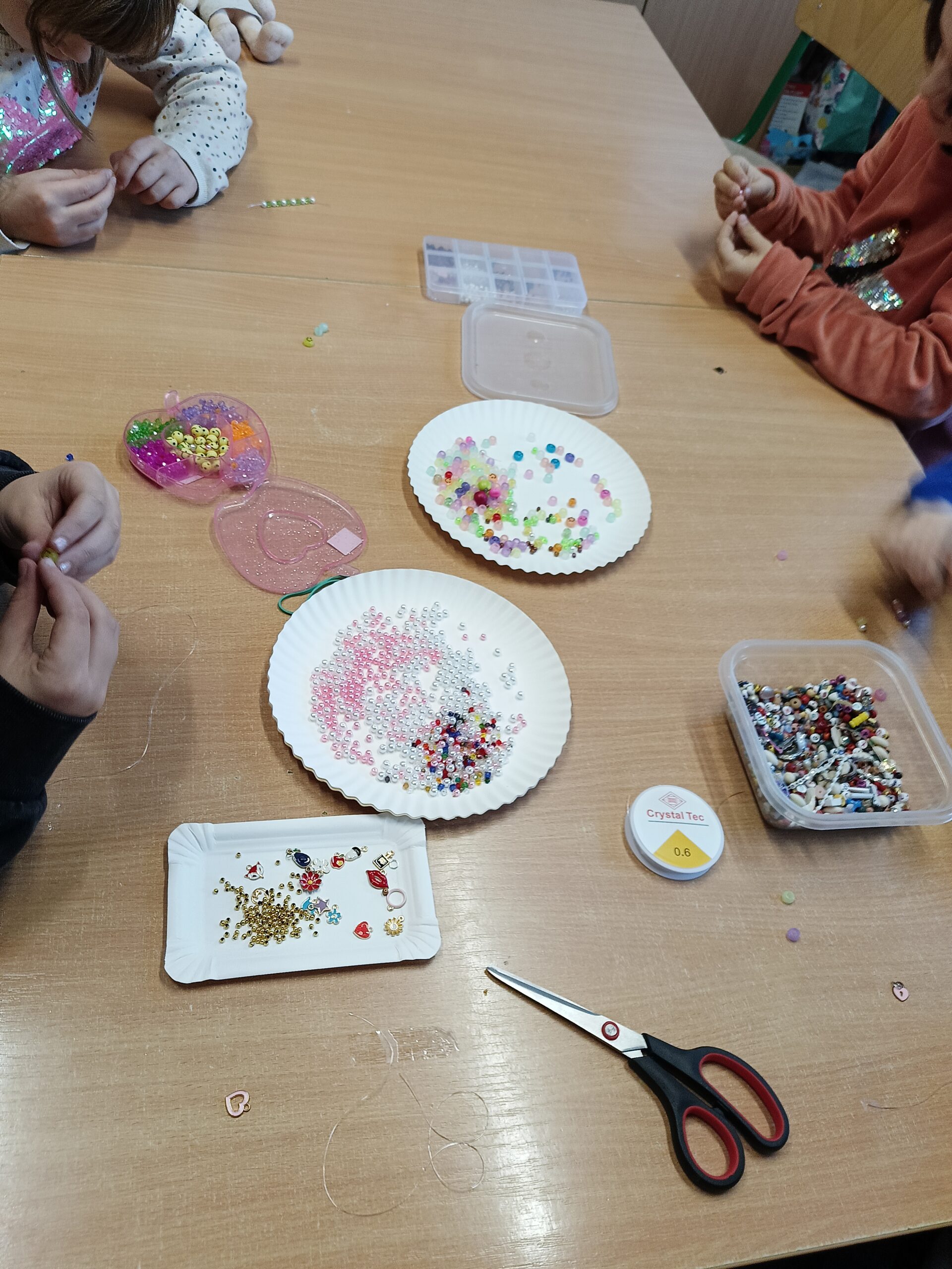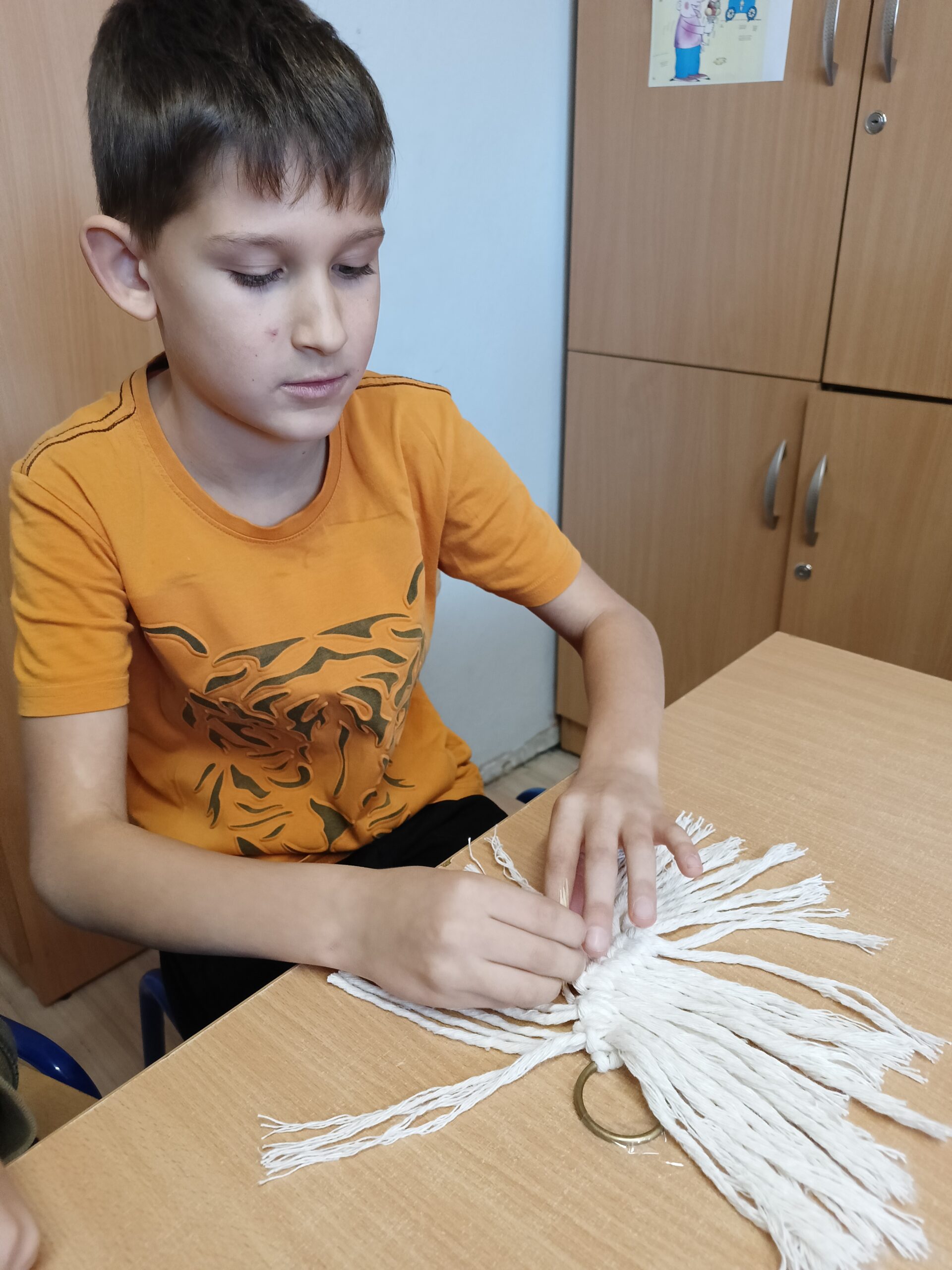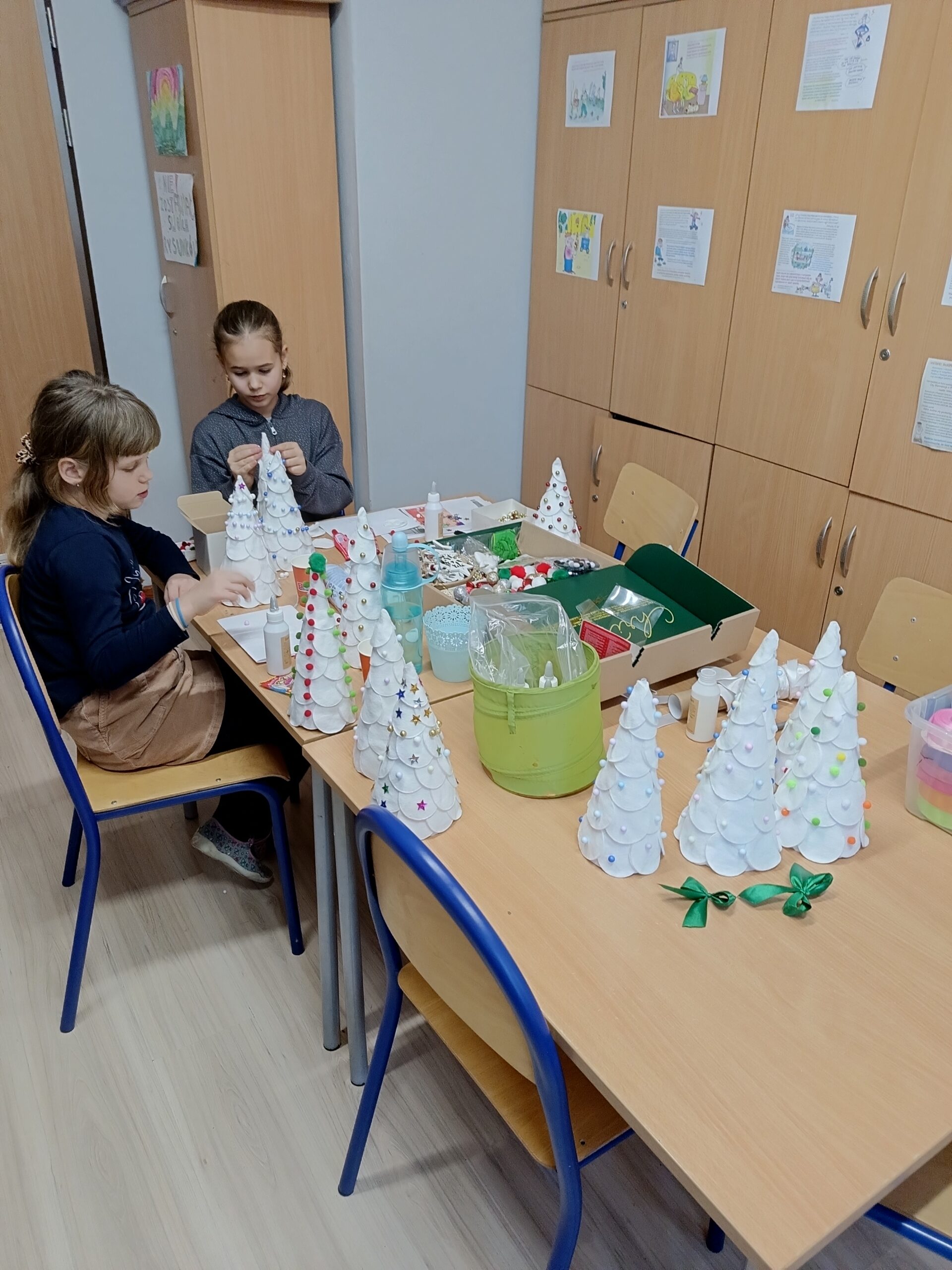 Co robiliśmy w tym semestrze: przestrzenne drzewa z papieru, rękę 3D w ołówku, bransoletki z kolorowych koralików, ozdoby na kiermasz świąteczny, gwiazdy z torebek śniadaniowych, obrazki z koralików zgrzewanych, breloki makramowe, wykonaliśmy również fotobudkę na Dzień Życzliwości. Obecnie szyjemy ręcznie poduszki.