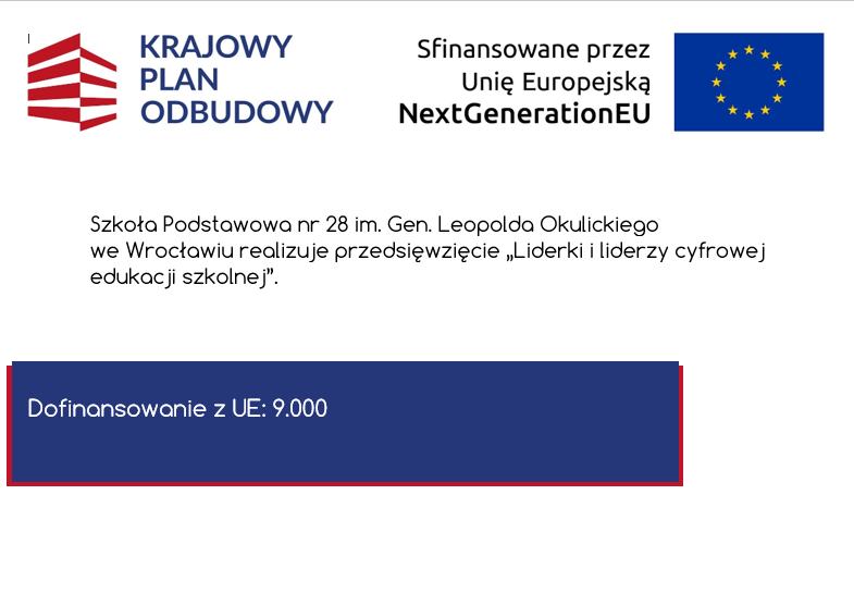 przystąpiła do projektu edukacyjnego „Liderki i liderzy cyfrowej edukacji szkolnej”(nr KPOD.05.08-IW.06-0110/25) realizowanego w ramach Krajowego Planu Odbudowy i Zwiększania Odporności, finansowanego w całości ze środków UE NextGenerationEU – Instrumentu na Rzecz Odbudowy i Zwiększenia Odporności, zawartego w ramach Krajowego Planu Odbudowy – Reforma: C2.1: Zwiększenie skali zastosowań rozwiązań cyfrowych w sferze publicznej, gospodarce i społeczeństwie, Inwestycja C2.1.3: E-kompetencje.