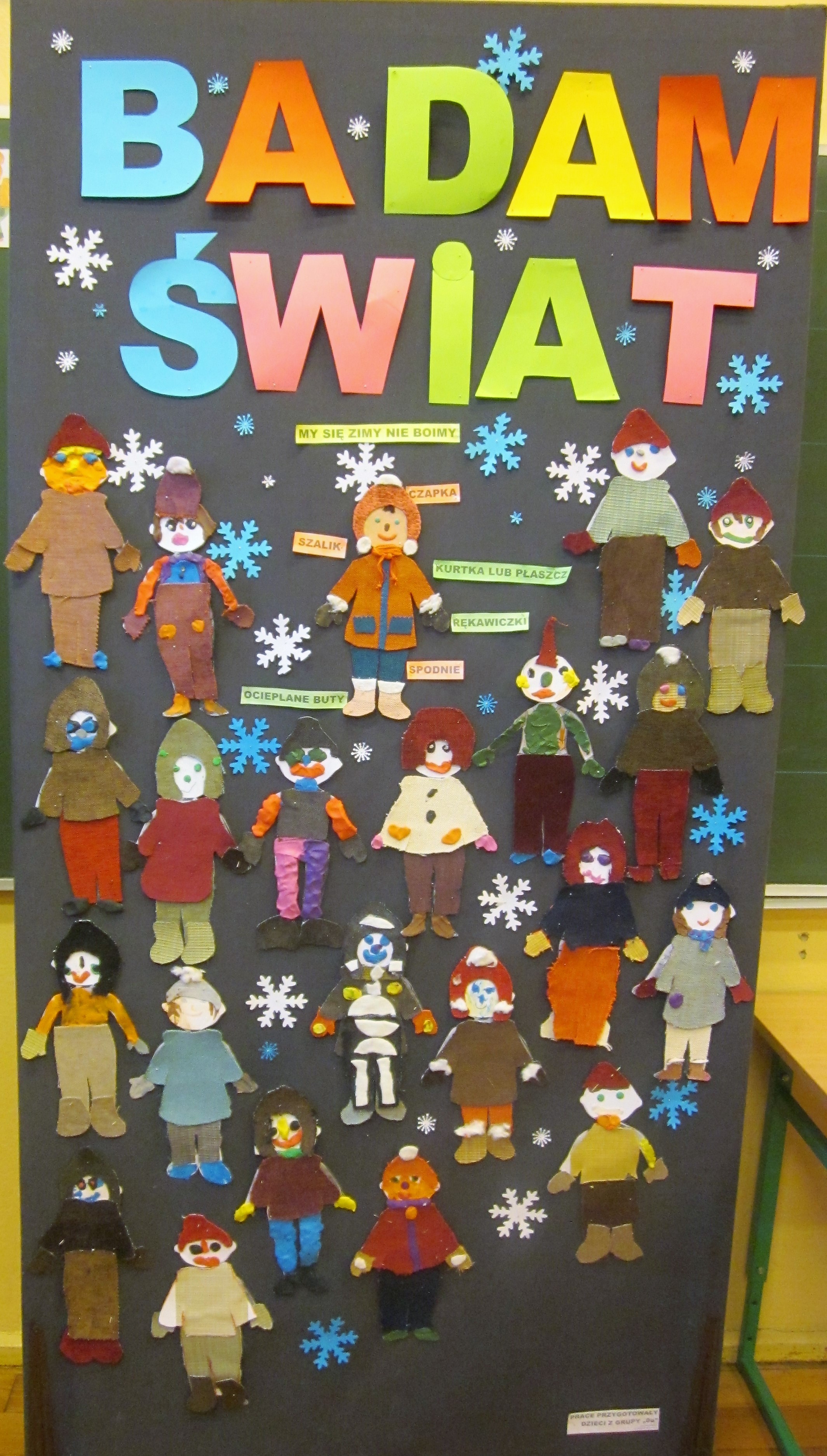 W ramach projektu „Badam świat” uczniowie z oddziału „0a” przygotowali prace plastyczne, przypominające jak należy ubierać się zimową porą. Efekty tej dziecięcej aktywności można było obejrzeć na szkolnym korytarzu.