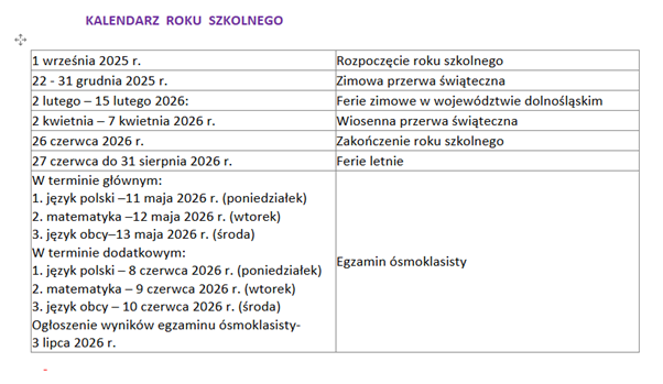 Kalendarz organizacji roku szkolnego 2025/2026 Kalendarz organizacji roku szkolnego 2025/2026