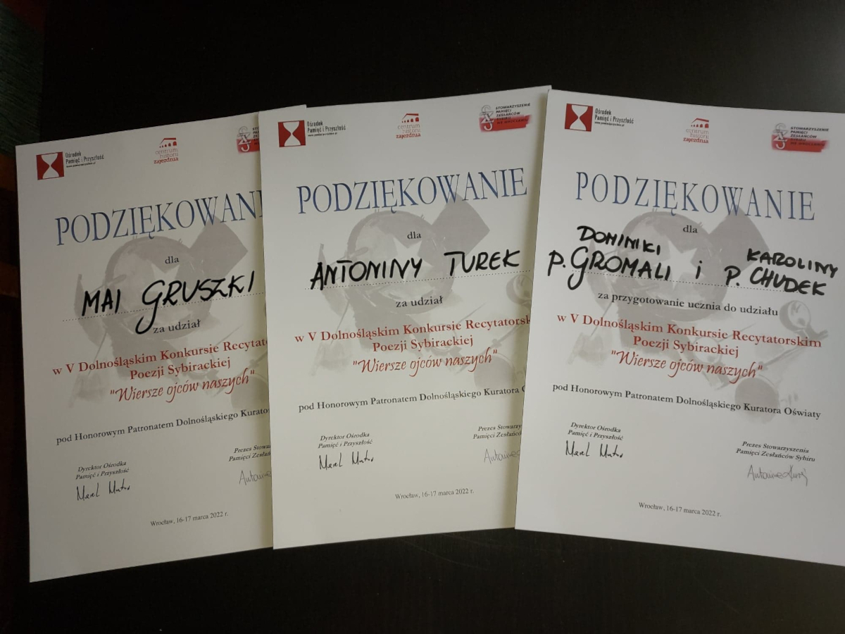 Nasza szkoła po raz pierwszy wzięła udział w Dolnośląskim Konkursie Recytatorskim Poezji Sybirackiej „Wiersze ojców naszych”. Szlaki przecierały uczennice klasy 8c: Maja i Tosia. Dzięki uprzejmości organizatorów, udało nam się zwiedzić również główną wystawę w Centrum Historii Zajezdnia, gdzie odbywał się konkurs. Gratulujemy naszym uczennicom i obiecujemy, że w przyszłym roku nasza szkoła pojawi się podczas kolejnej edycji tego wydarzanie.