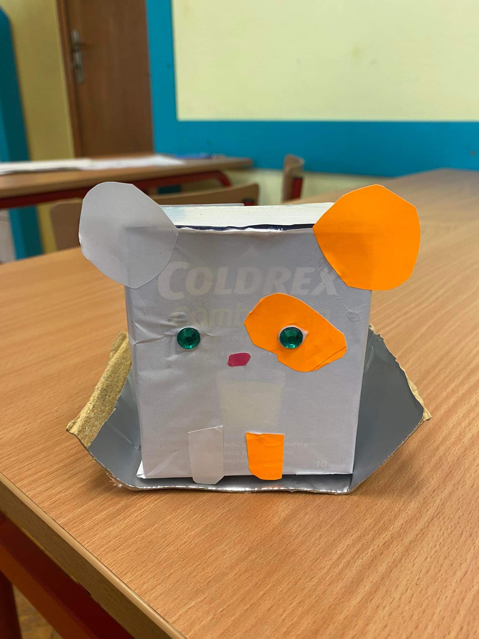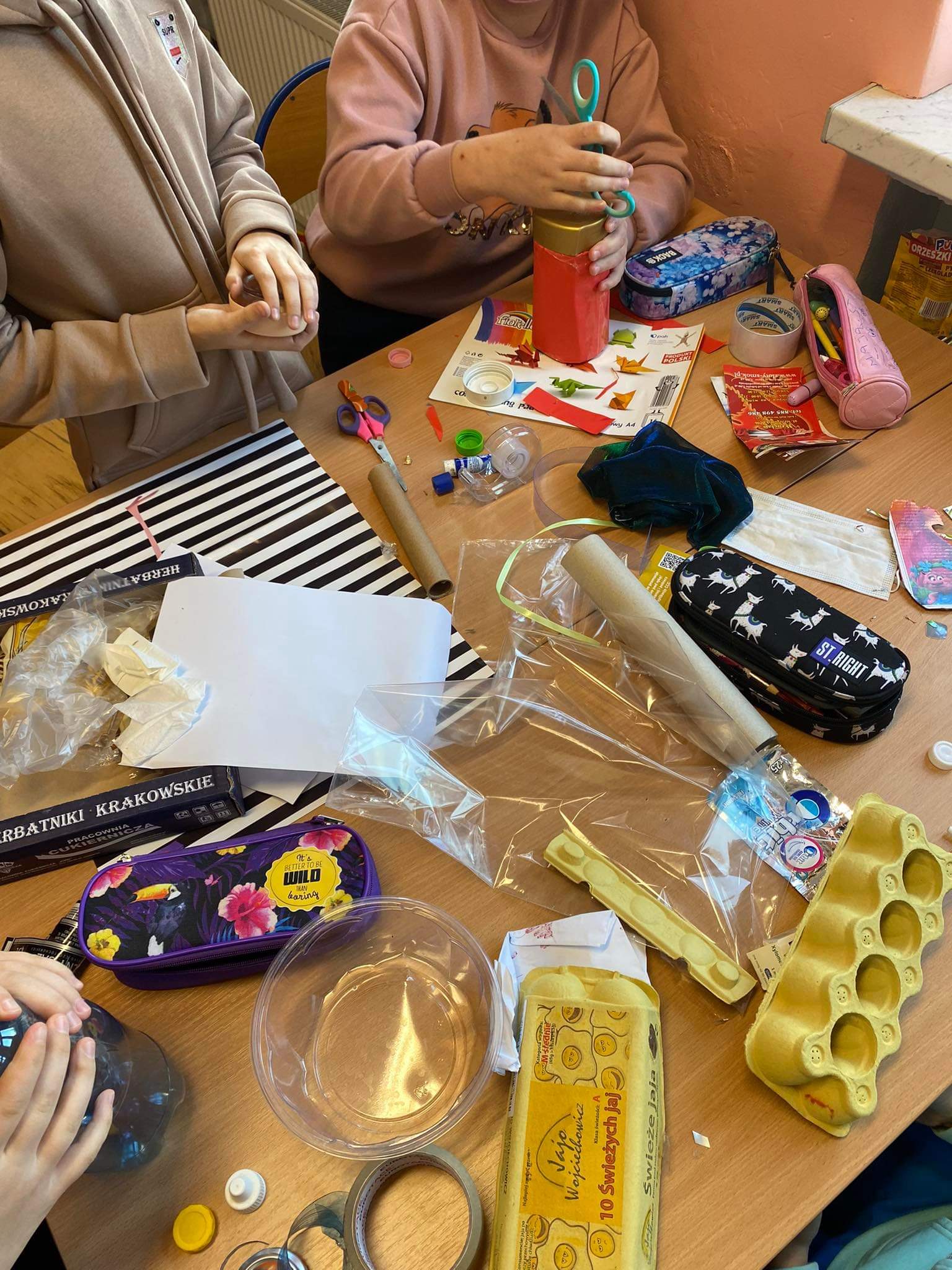 Klasy 4 na zajęciach z techniki realizowały zadanie w ramach projektu Przedsiębiorcza Szkoła – Przedsiębiorczy Uczeń. Wykonano prace na dowolnie wybrany temat wykorzystując surowce wtórne. Uczniowie zwracali uwagę na potrzebę dbania o środowisko naturalne.