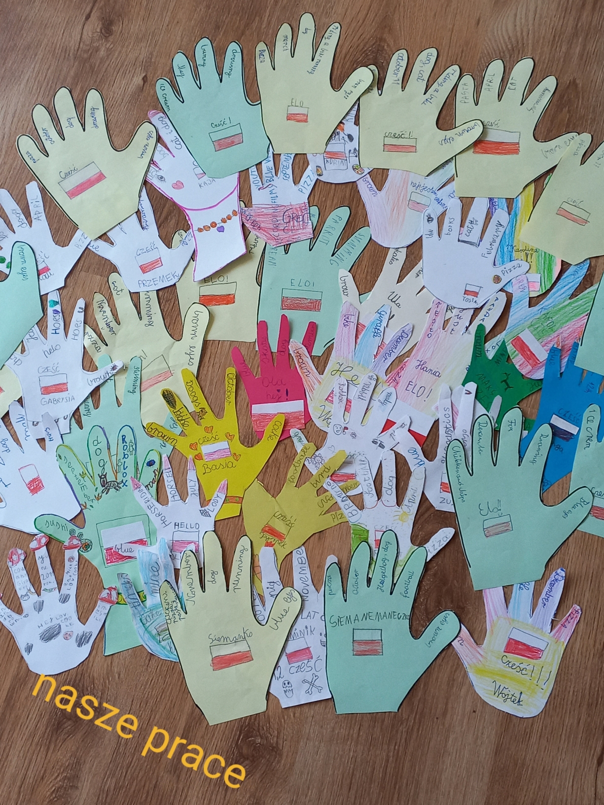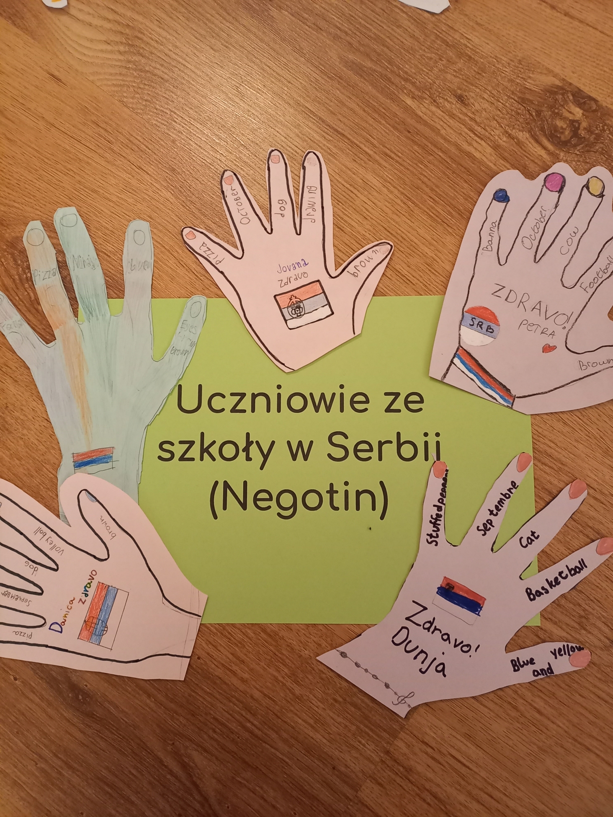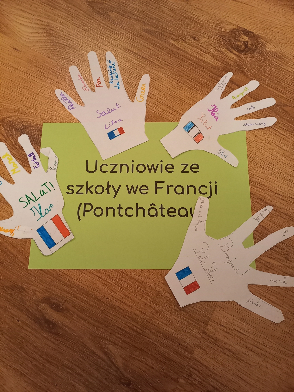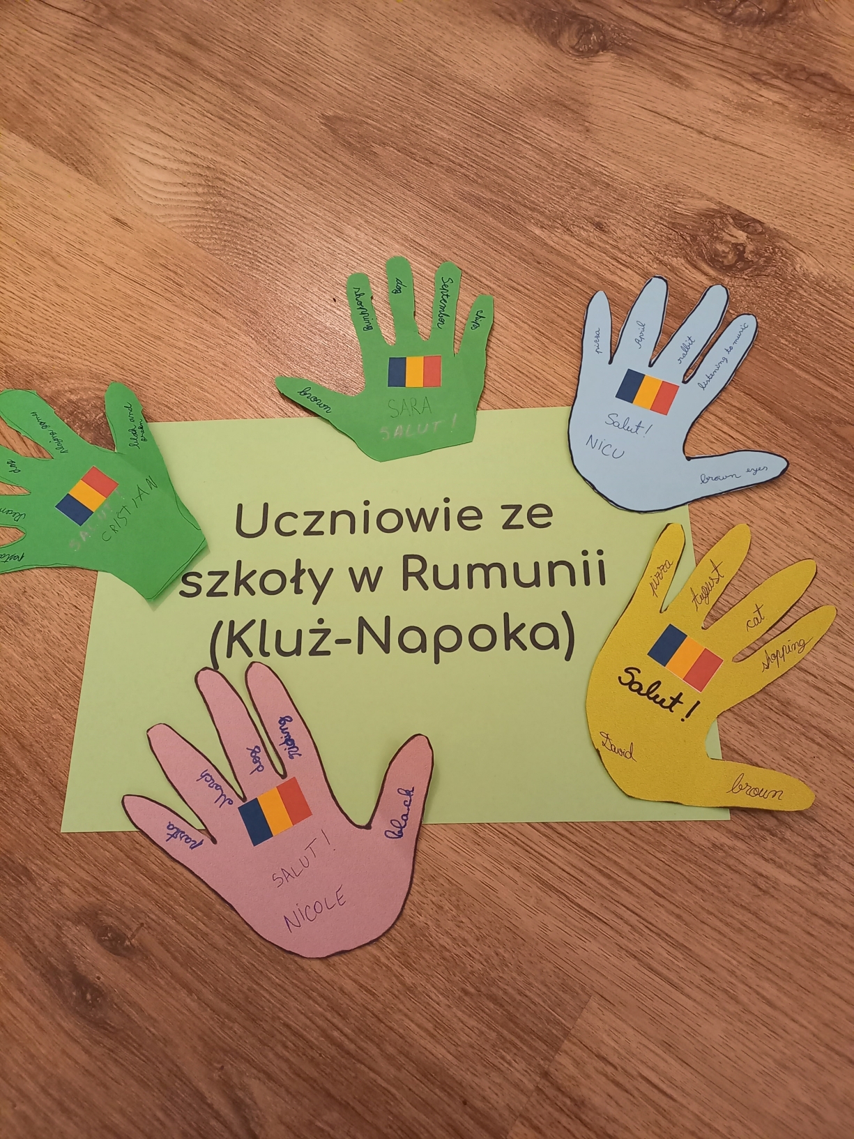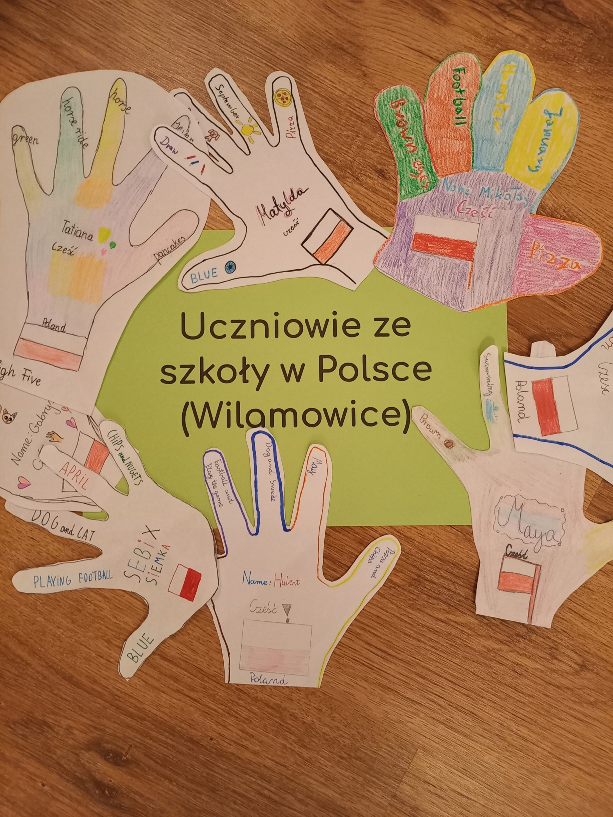 W tym semestrze klasy 2a,2b i 3b wzięły udział w międzynarodowym projekcie E-twinning , w ramach którego  na odległość przybiły piątki uczniom z zagranicy, którzy uczą się angielskiego. Naszym zadaniem było przygotowanie papierowych odcisków swoich dłoni z podstawowymi informacjami o sobie, oczywiście w języku angielskim. W ramach pocztowej wymiany otrzymaliśmy podobne prace, dzięki czemu poznaliśmy uczniów z Rumunii, Francji, Serbii oraz innej szkoły w Polsce.