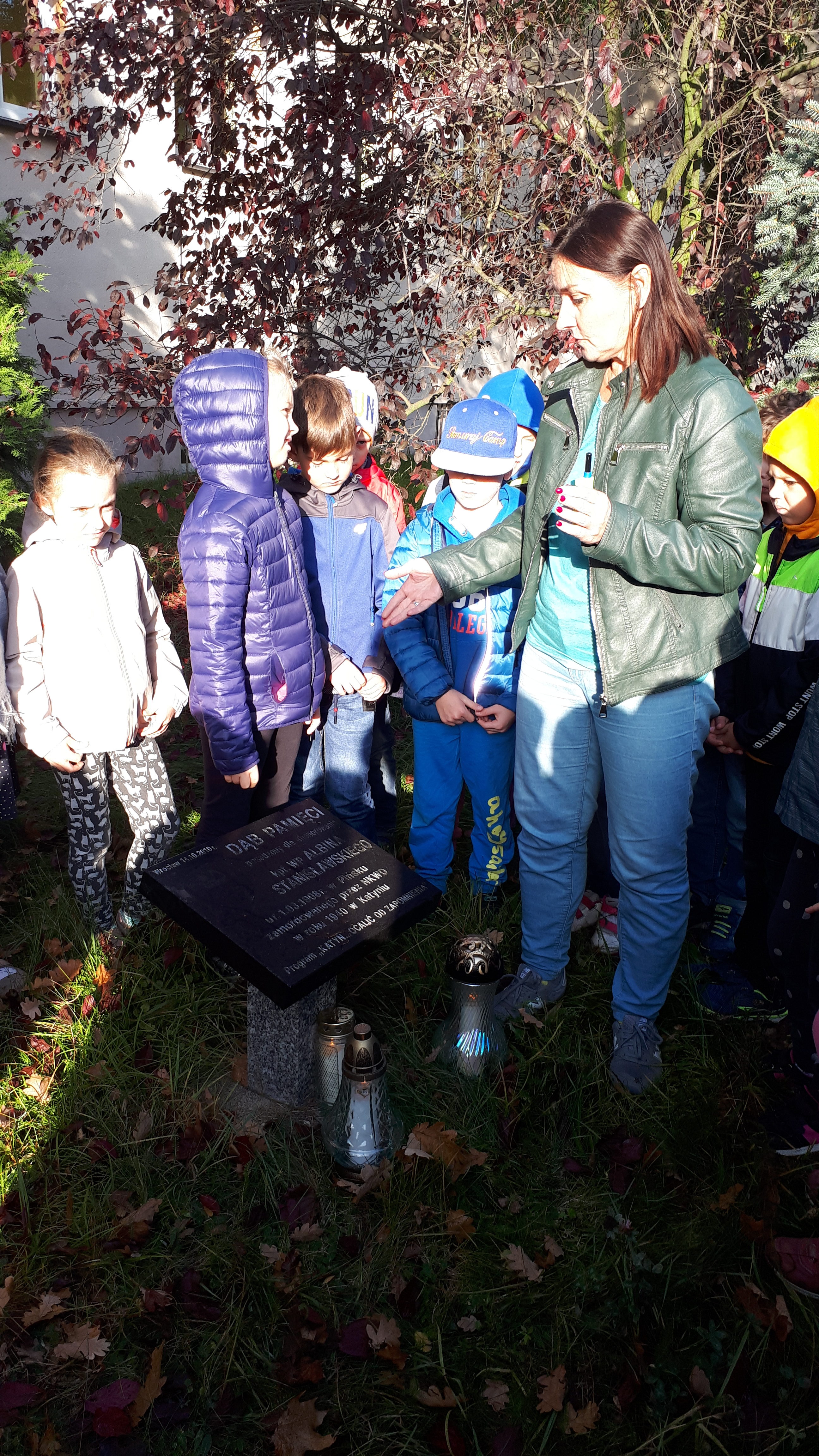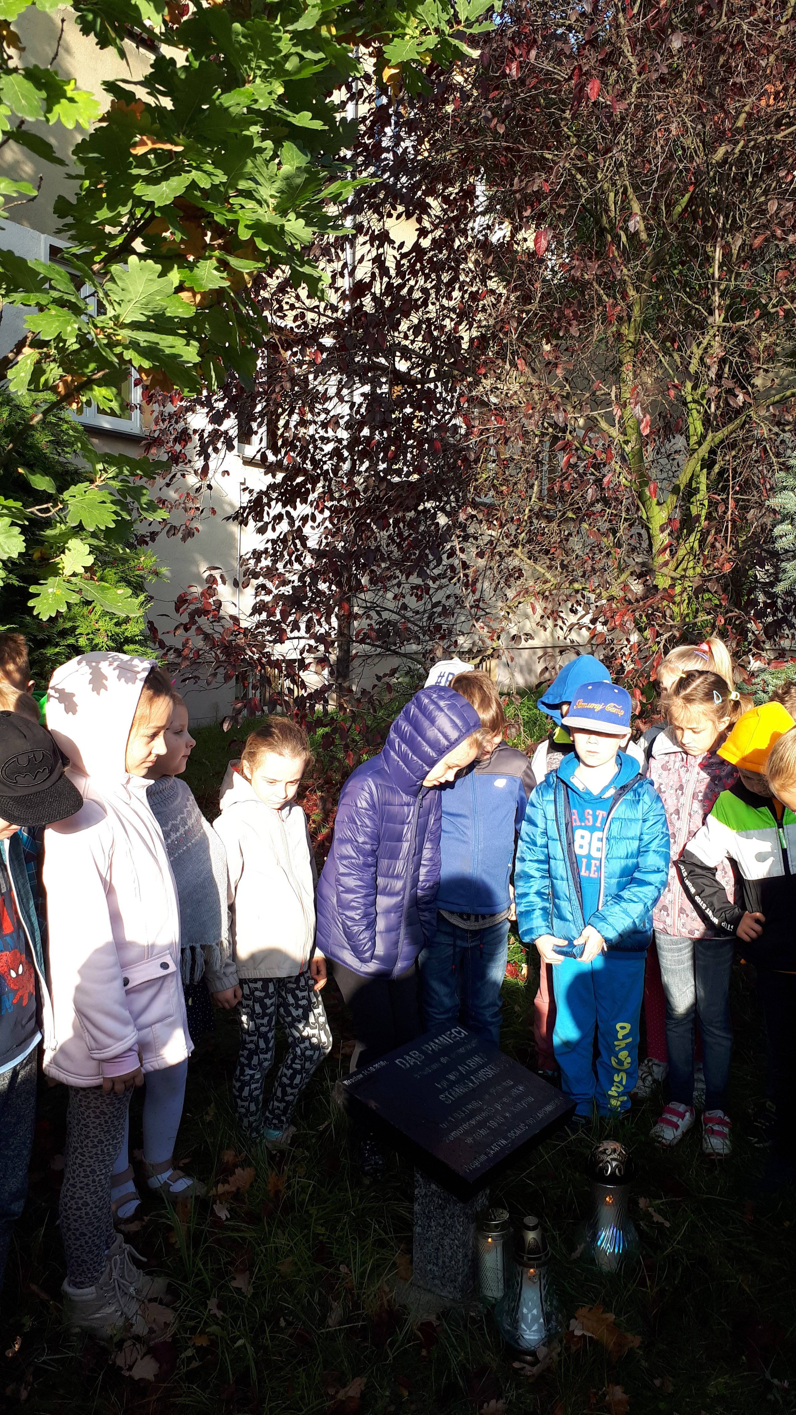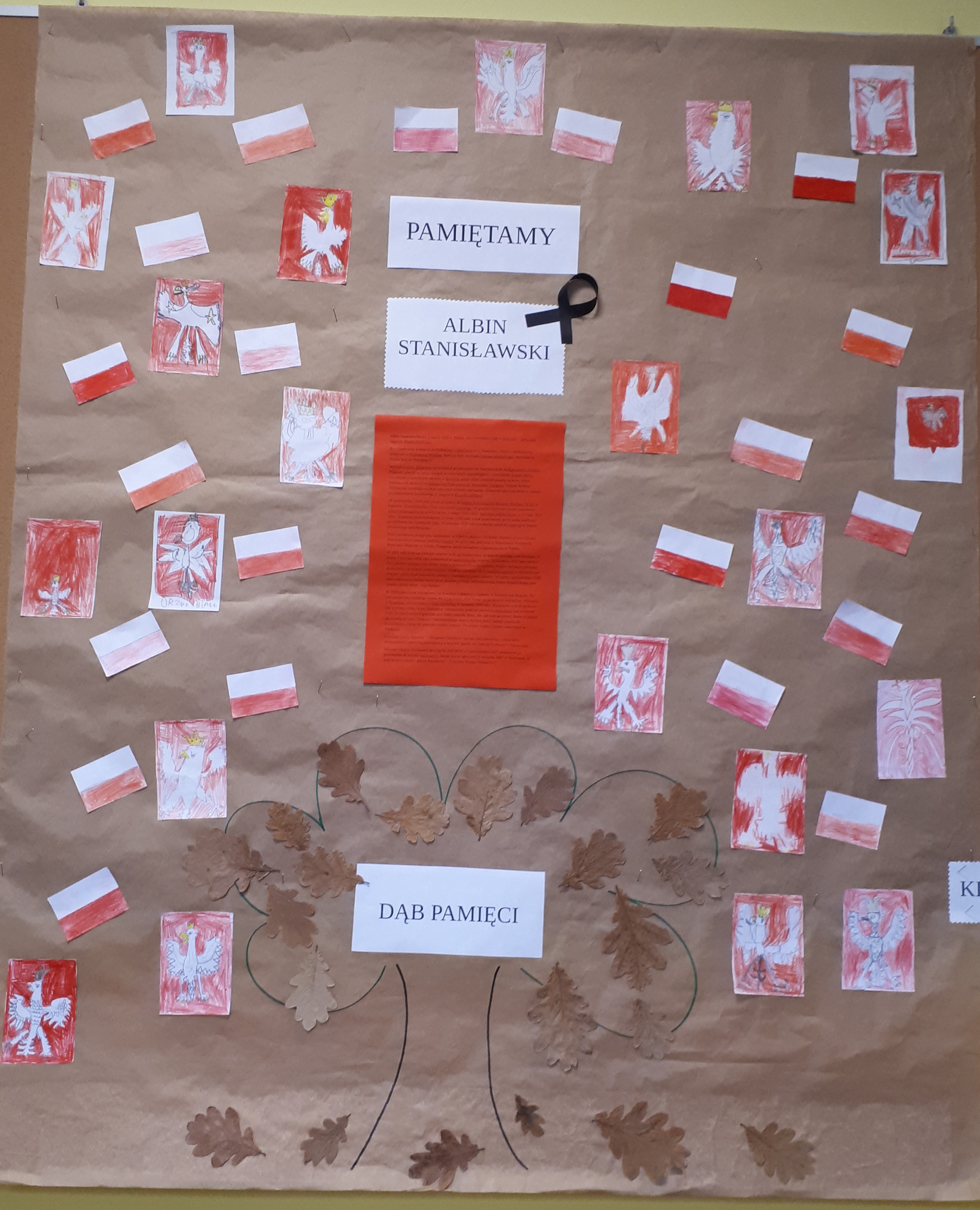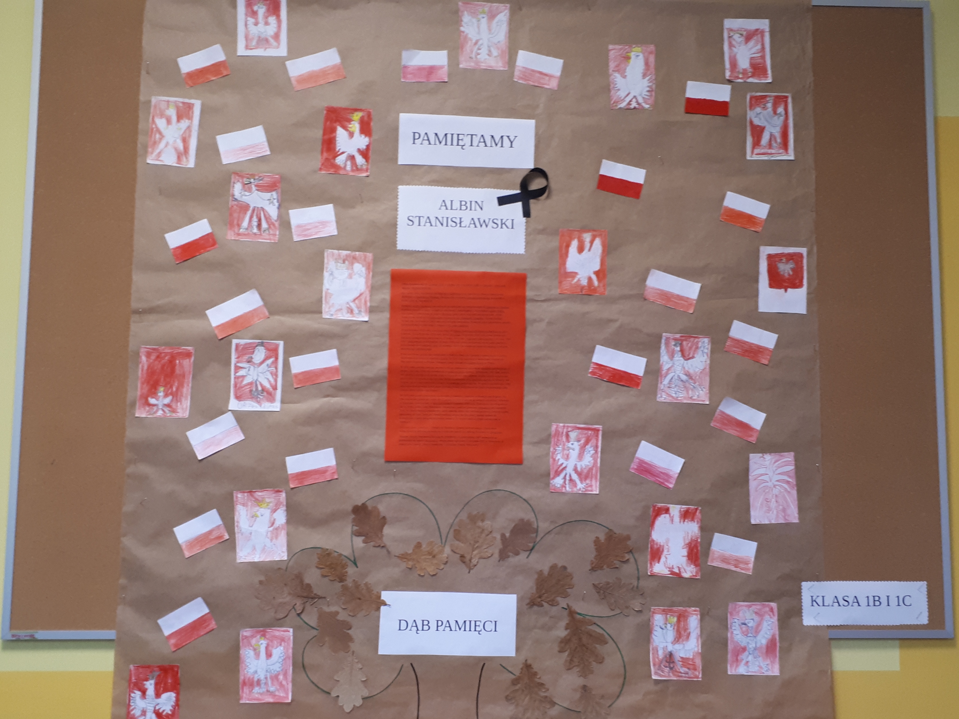 W dniu 25 października 2019 r. klasy 1c i 1b przyłączyły się do akcji Ministerstwa Edukacji Narodowej „Szkoła pamięta”. Tego dnia uczniowie wspólnie zapaliły znicze pod „Dębem Pamięci” w szkolnym ogrodzie oddając w ten sposób hołd poległym w czasie II Wojny Światowej. W klasie uczniowie wykonali plakat ku pamięci poległych i zorganizowali pogadankę na temat postaci Albina Stanisławskiego. Poznali jego życiorys i historię służby w polskim wojsku w czasie II wojny. Oglądali też film o tematyce patriotycznej poznając symbole narodowe. Na koniec Dnia Pamięci wspólnie odśpiewali pieśń patriotyczną „Jesteśmy Polakami”. Plakat obu klas wisi na tablicy korkowej na korytarzu szkolnym – na parterze.