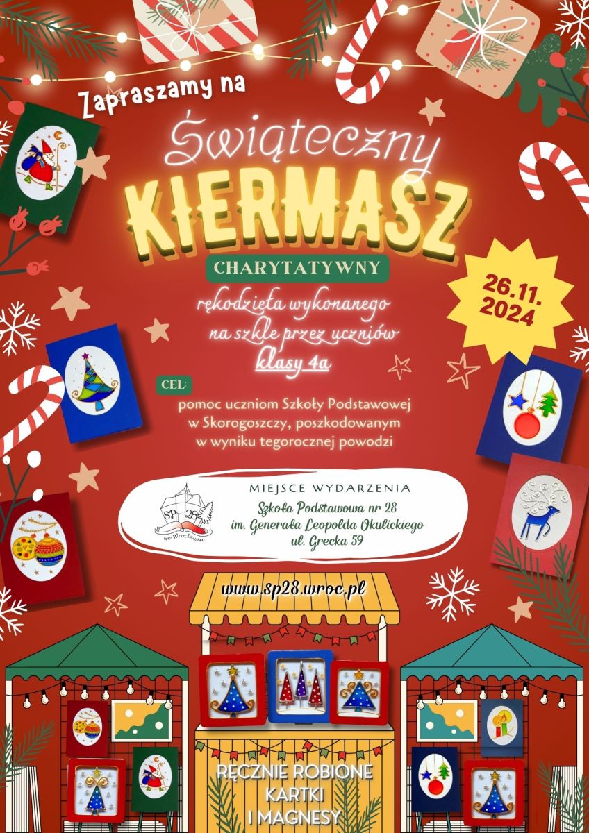 podtrzymując tradycję naszej szkoły i zaangażowanie w pomoc innym, 26 listopada 2024 r. odbędzie się kiermasz świąteczny w szkolnym holu. Zachęcamy Państwa do włączenia się do akcji charytatywnej i serdecznie prosimy o zakup kartek i magnesów, które uczniowie z klasy 4a będą sprzedawać przed zebraniem rodziców w wyżej wymienionym terminie.
