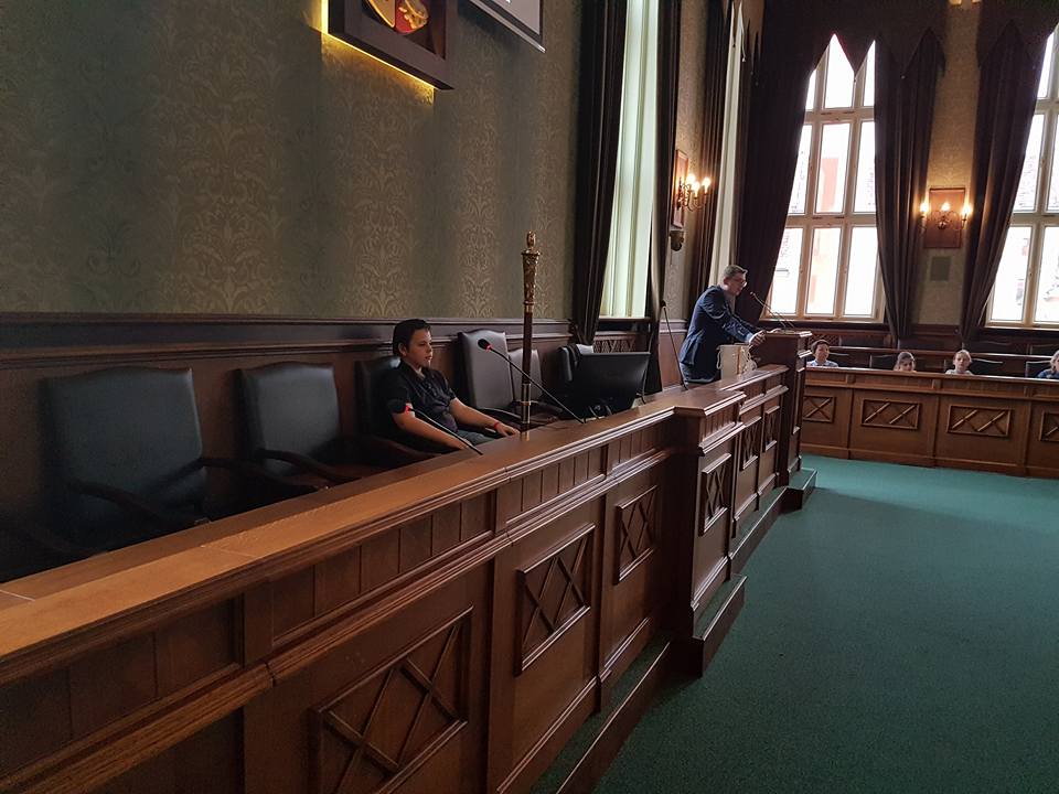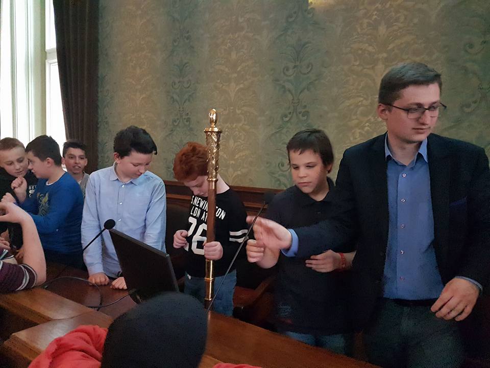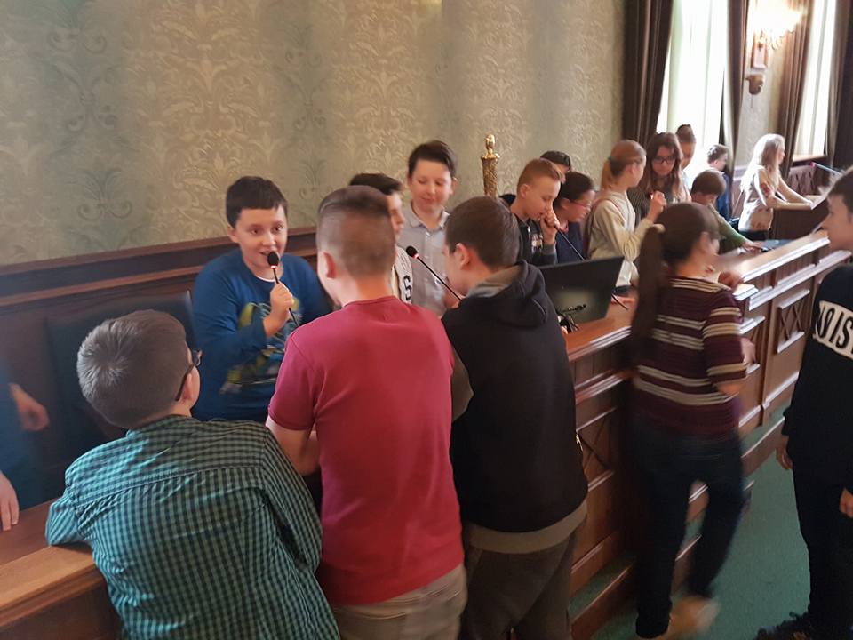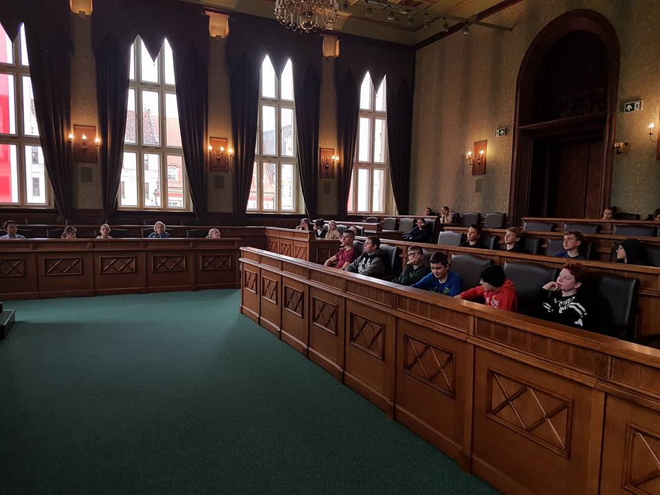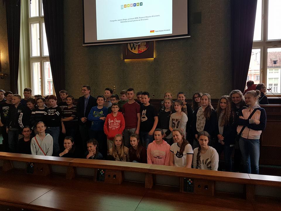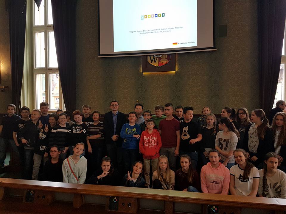 28 kwietnia 2017r. byliśmy gośćmi wrocławskiego samorządu. Na początku poznaliśmy historię Rady Miasta od średniowiecza aż po współczesność. Następnie obejrzeliśmy prezentację i wysłuchaliśmy ciekawego wykładu zaprzyjaźnionego z naszą szkołą pana Łukasza Olberta – radnego naszego pięknego miasta. Na koniec mogliśmy zastukać laską przewodniczącego i spróbować swoich sił przy mikrofonach. Wizyta przybliżyła nam sposoby samorządowego działania radnych. Z całego serca dziękujemy panu Łukaszowi za zaproszenie.