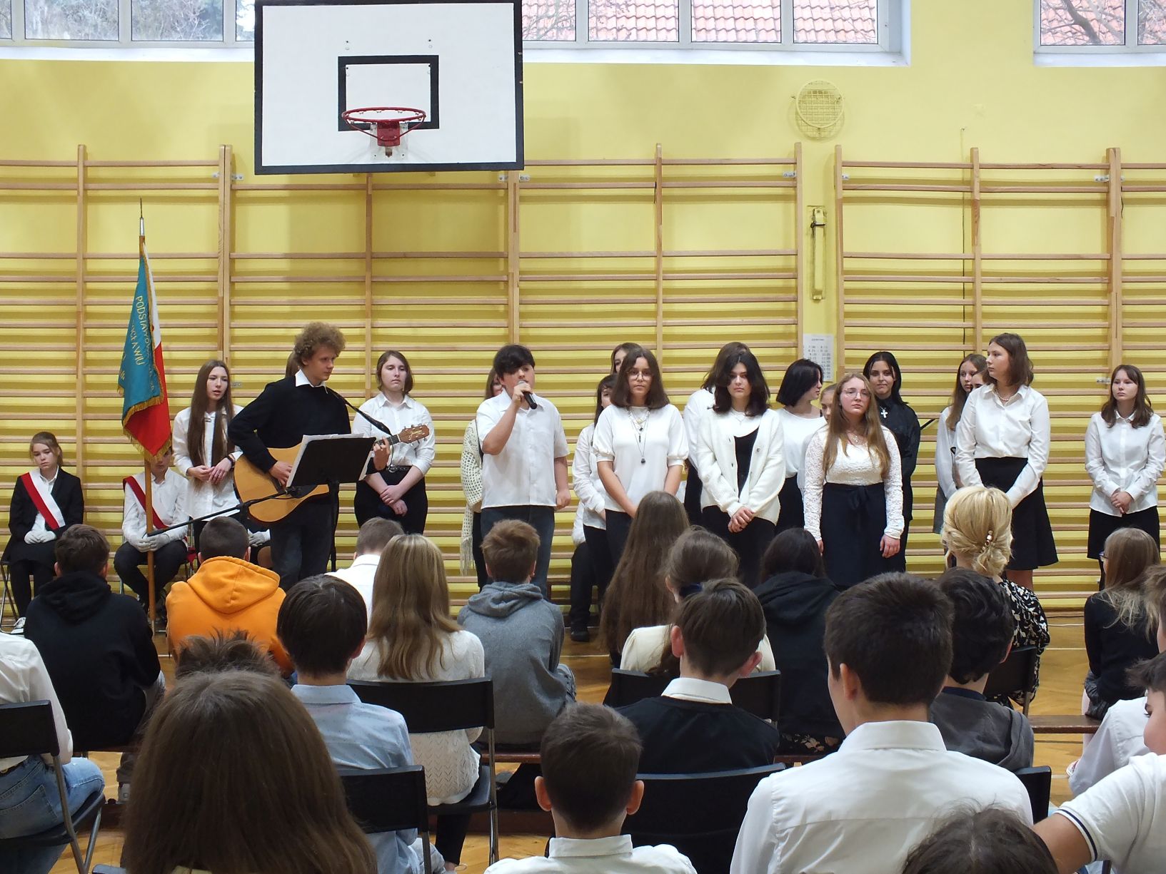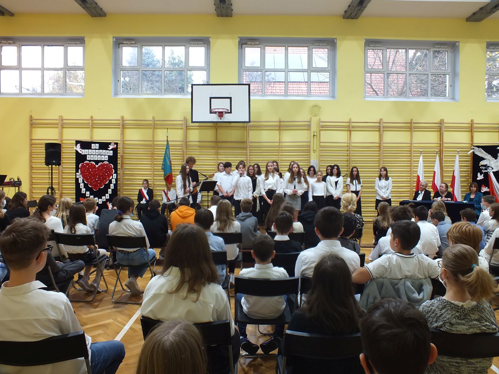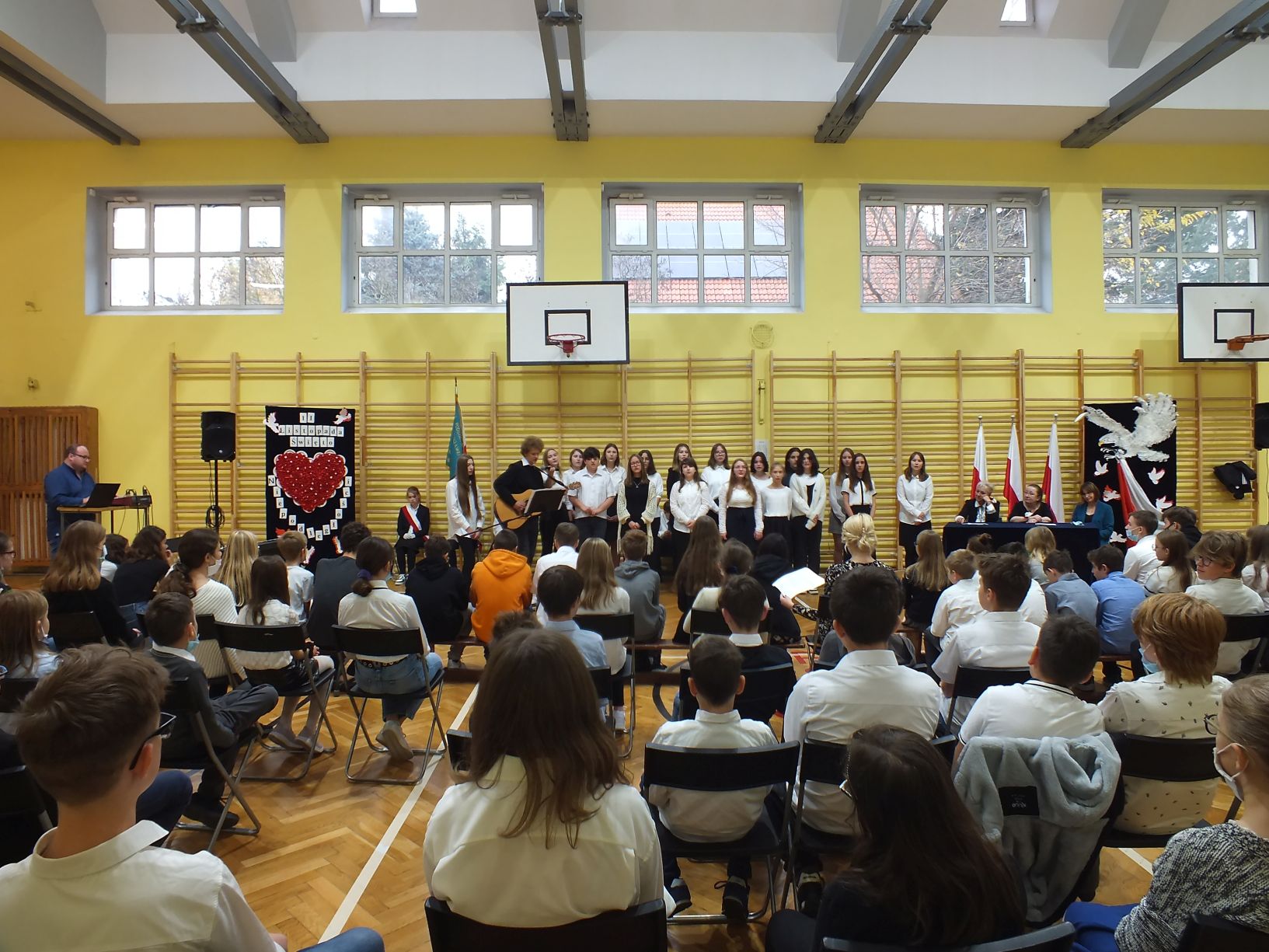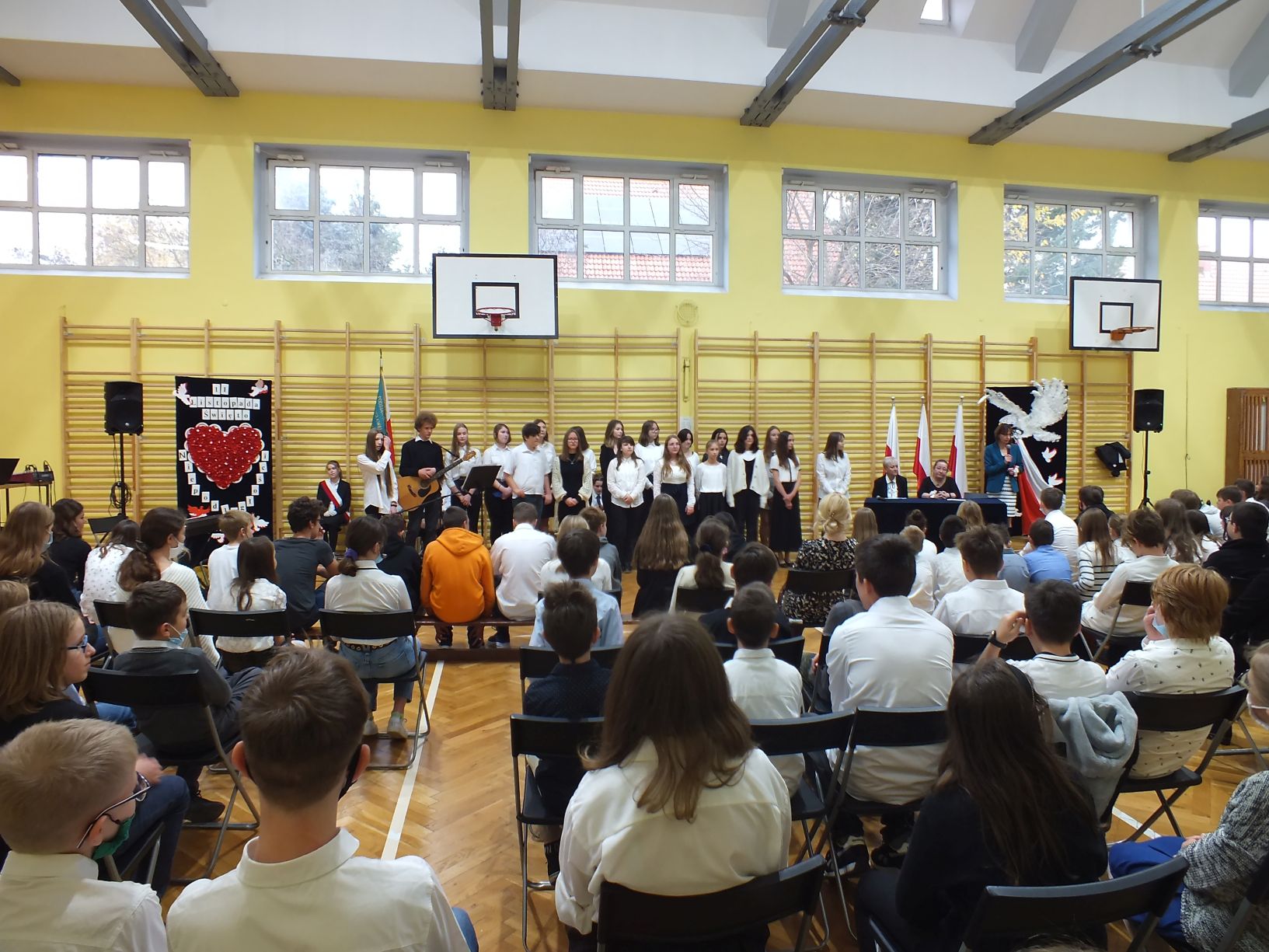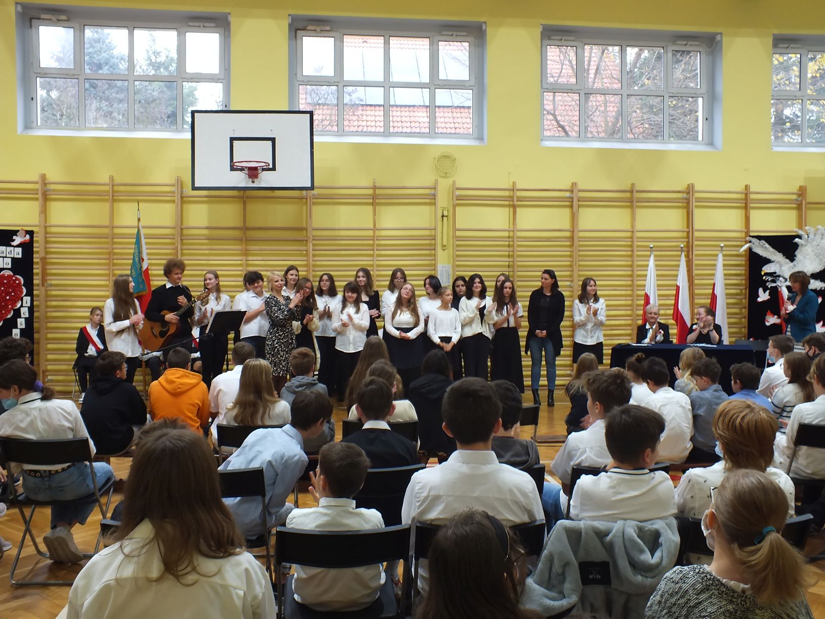 We wtorek 9-11-2021 uczniowie klas 8a i 8b przy wsparciu p. Dominiki Gromali i p. Alicji Wiłkowskiej przygotowali apel z okazji 103. rocznicy odzyskania przez Polskę niepodległości. Na scenie, udekorowanej przez p. Małgorzatę Donarską-Dubaj, pojawiły się talenty naszej szkoły. Usłyszeliśmy wzruszające wiersze i piosenki patriotyczne. Uczniowie naszej szkoły są niezwykle uzdolnieni artystycznie, a my mogliśmy docenić umiejętności Amelki (pianino i recytacja), Grzesia (gitara i wokal), Julii, Szymona, Zuzi i Zuzi, Hani, Alony oraz Wiki (śpiew i recytacja), Zuzi, Mai, Huberta, Ireny, Igi, Oli, Wiki oraz Illi (recytacja). Kto był – docenił, kto nie był – niech żałuje.