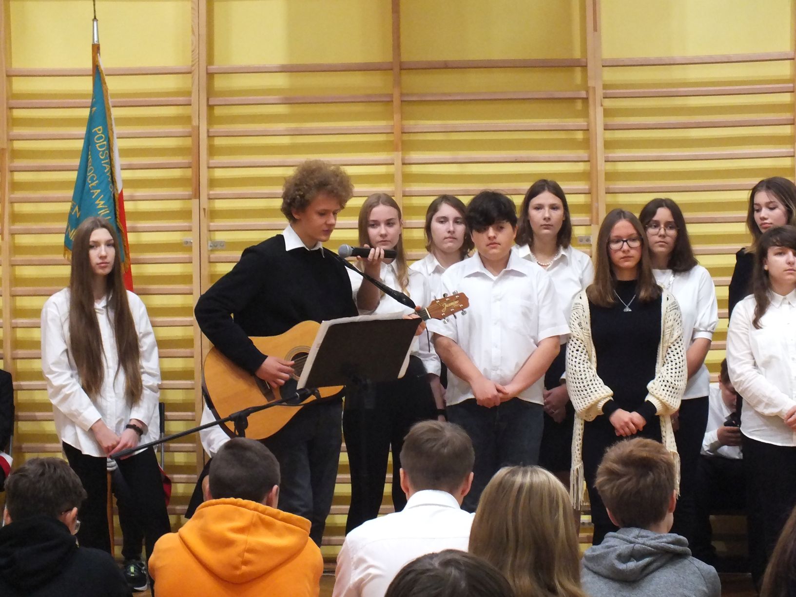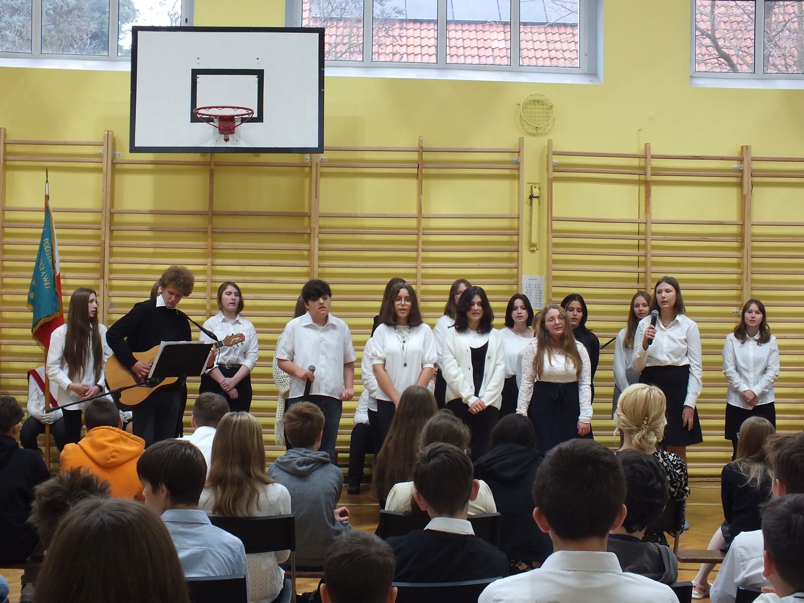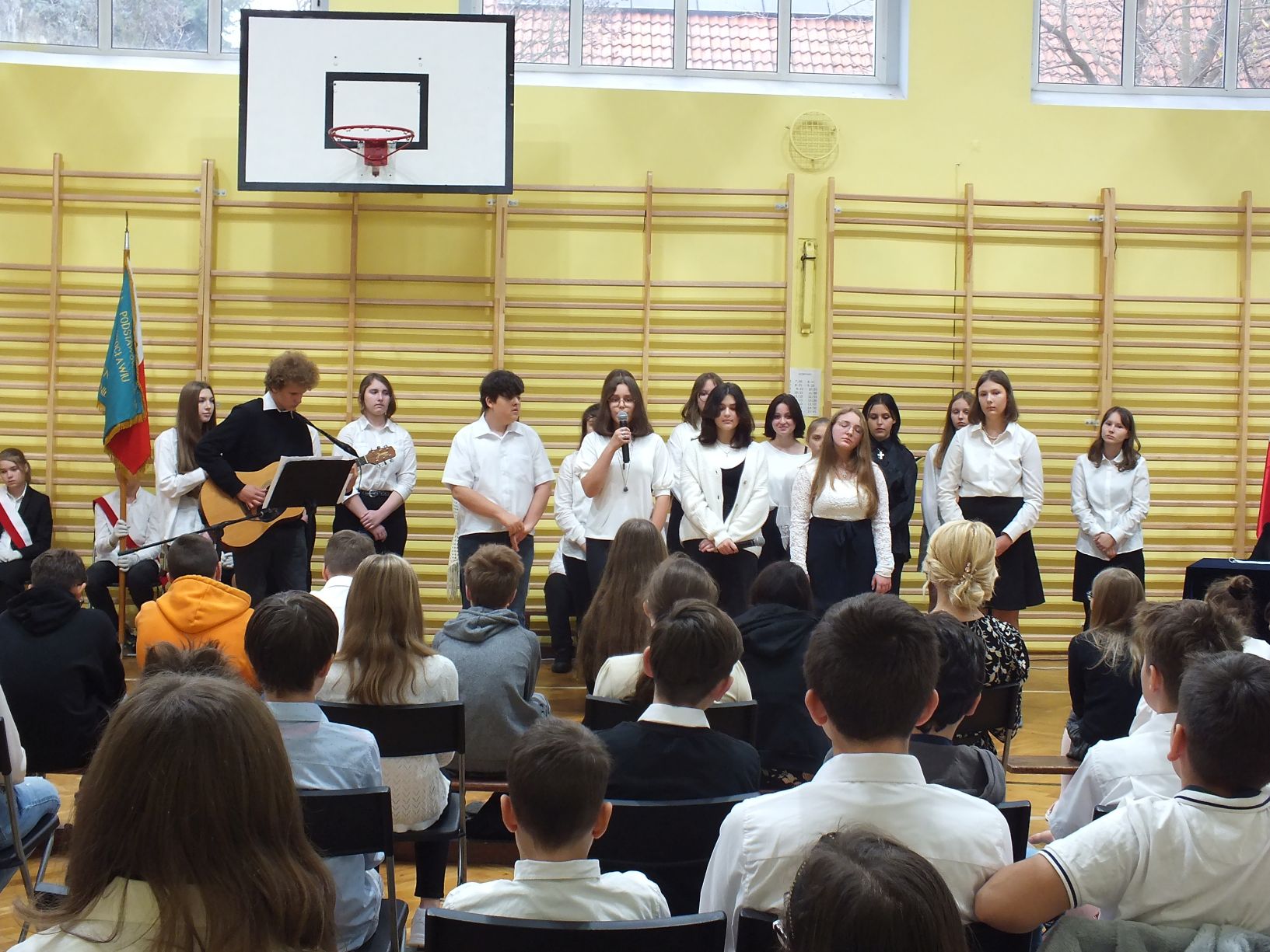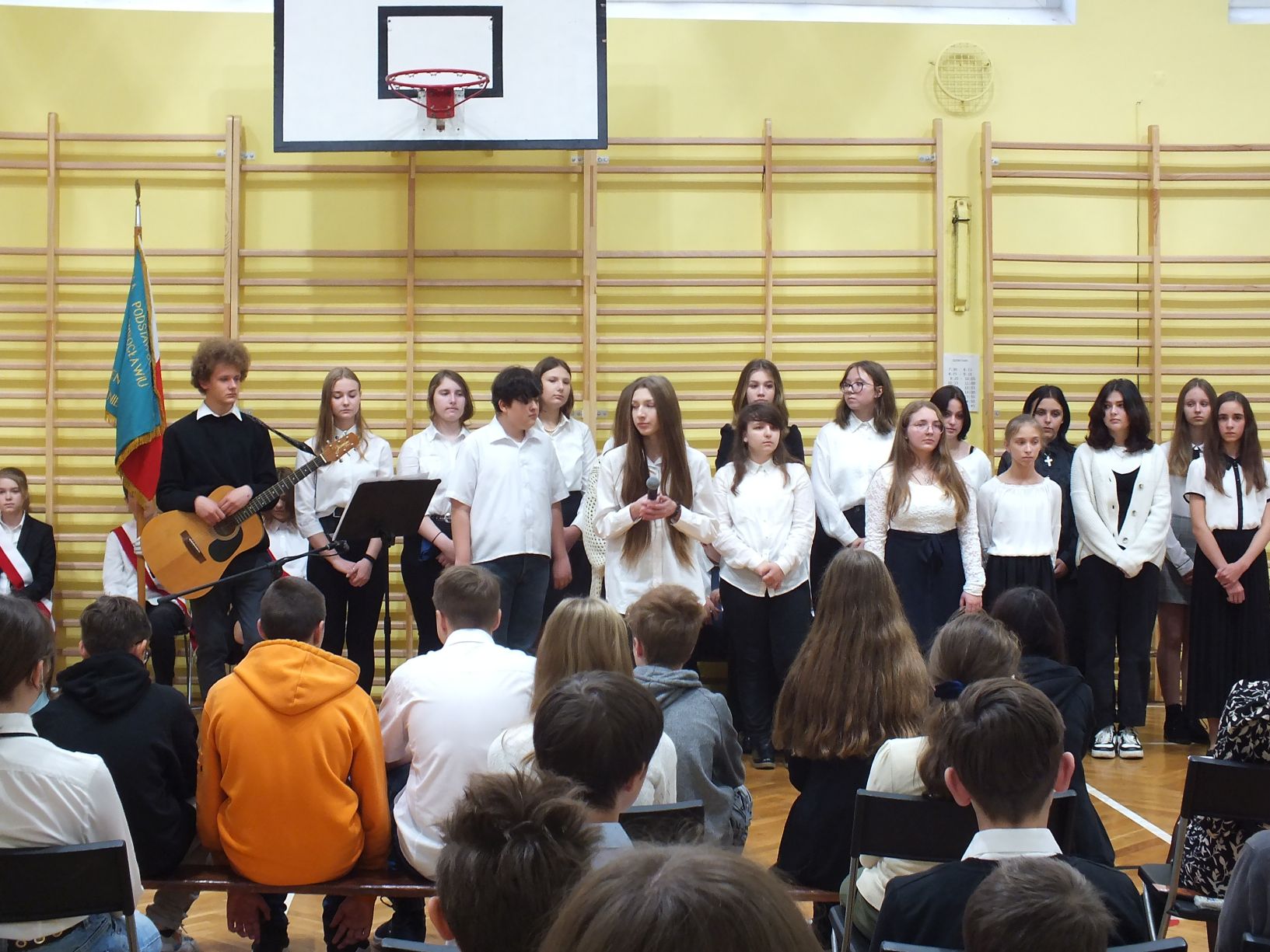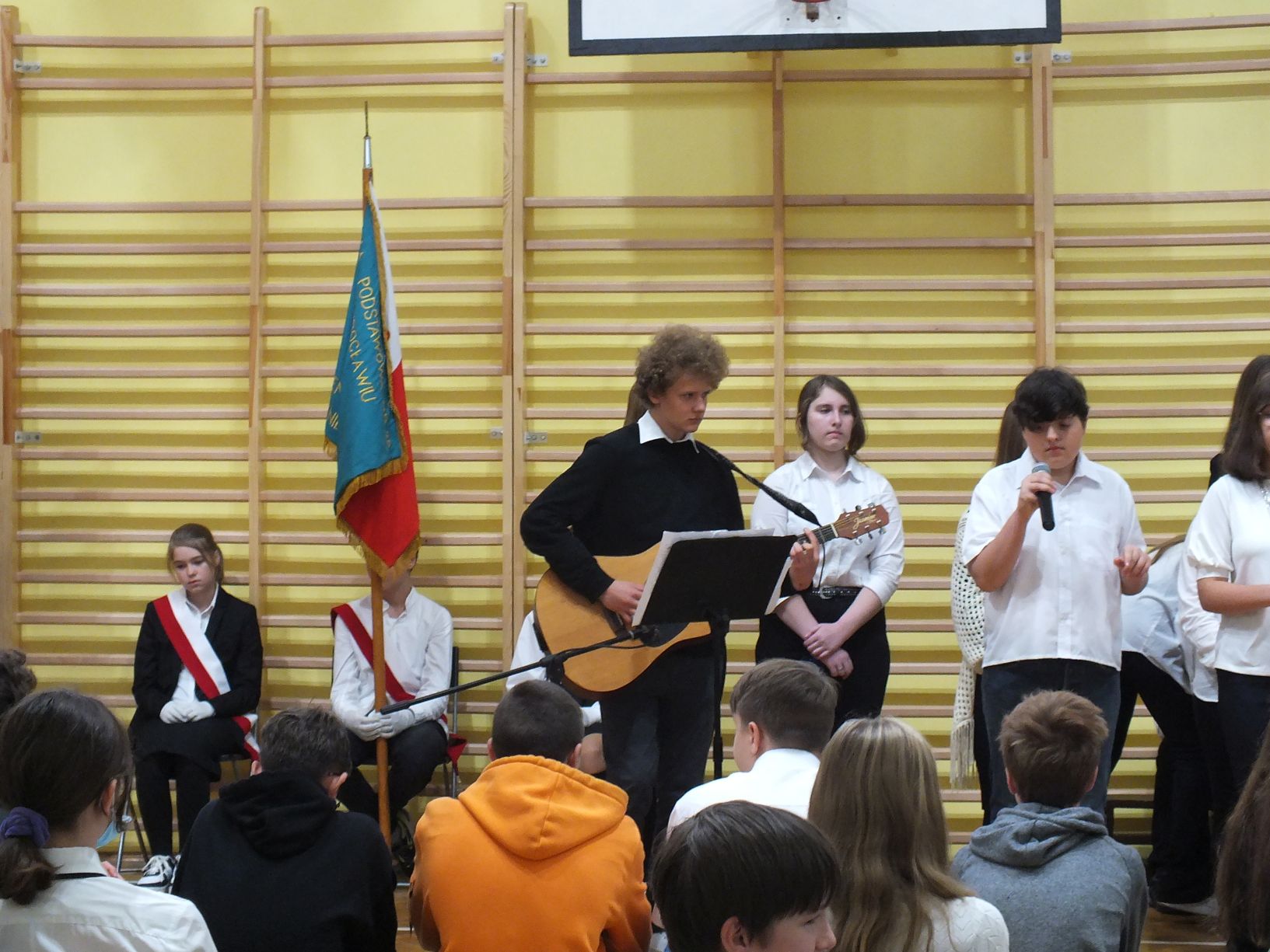 We wtorek 9-11-2021 uczniowie klas 8a i 8b przy wsparciu p. Dominiki Gromali i p. Alicji Wiłkowskiej przygotowali apel z okazji 103. rocznicy odzyskania przez Polskę niepodległości. Na scenie, udekorowanej przez p. Małgorzatę Donarską-Dubaj, pojawiły się talenty naszej szkoły. Usłyszeliśmy wzruszające wiersze i piosenki patriotyczne. Uczniowie naszej szkoły są niezwykle uzdolnieni artystycznie, a my mogliśmy docenić umiejętności Amelki (pianino i recytacja), Grzesia (gitara i wokal), Julii, Szymona, Zuzi i Zuzi, Hani, Alony oraz Wiki (śpiew i recytacja), Zuzi, Mai, Huberta, Ireny, Igi, Oli, Wiki oraz Illi (recytacja). Kto był – docenił, kto nie był – niech żałuje.