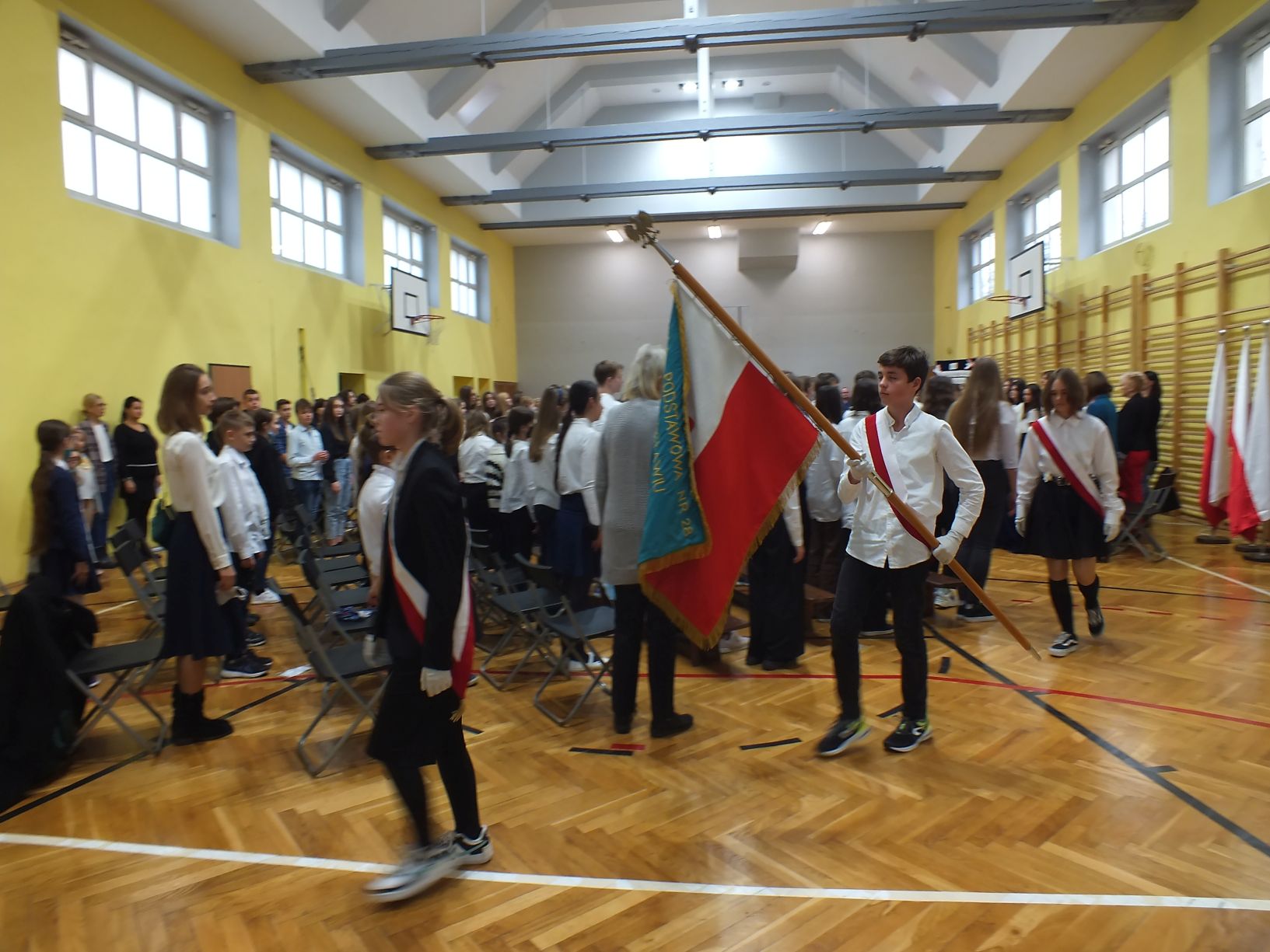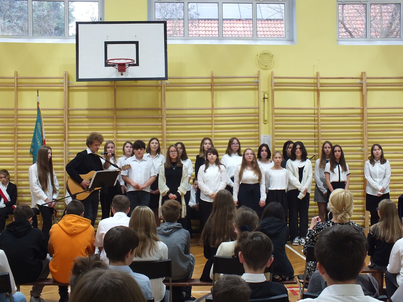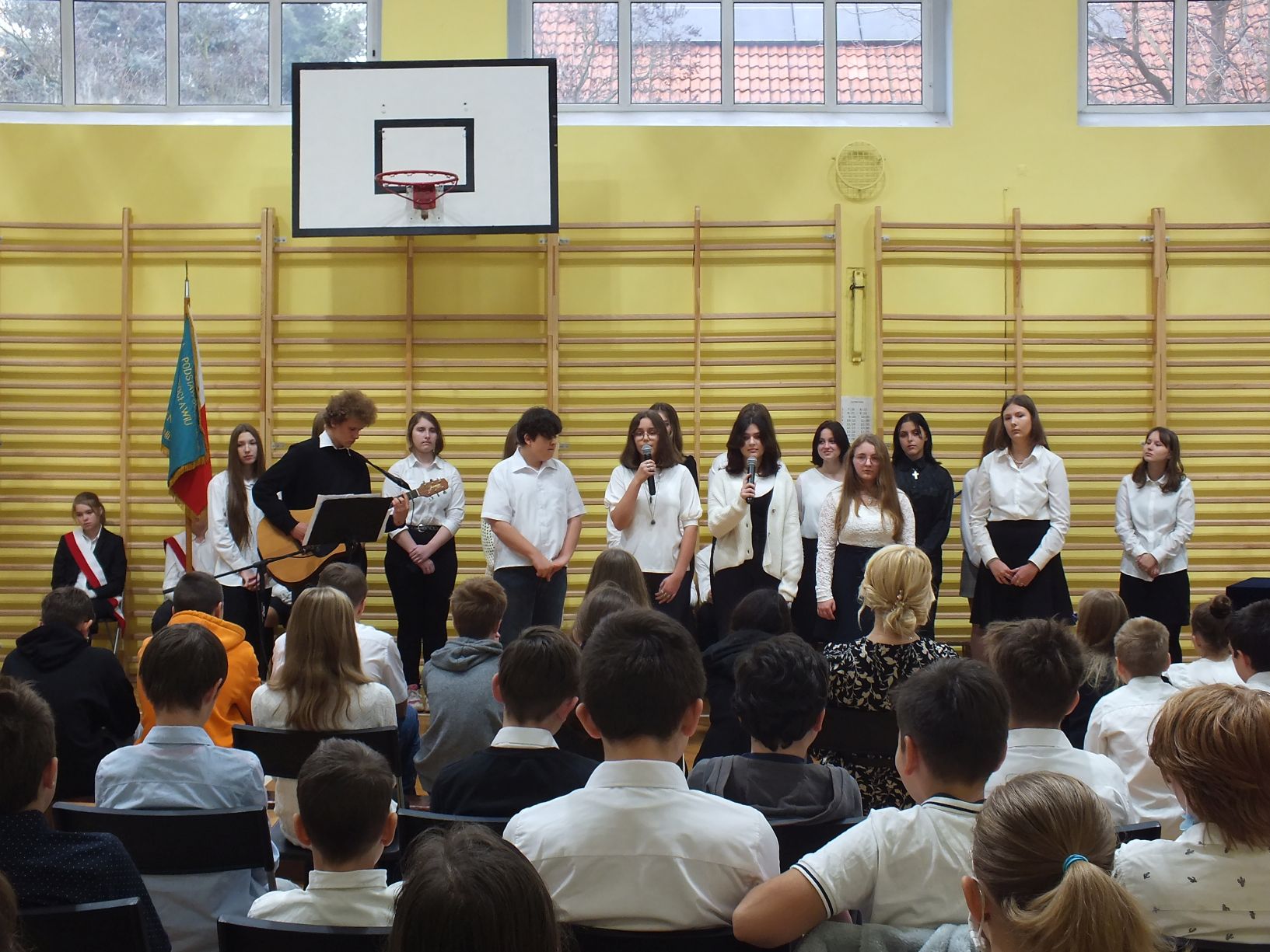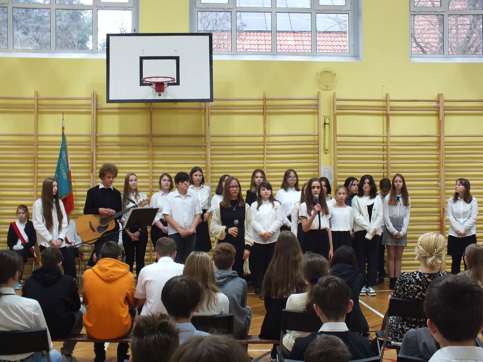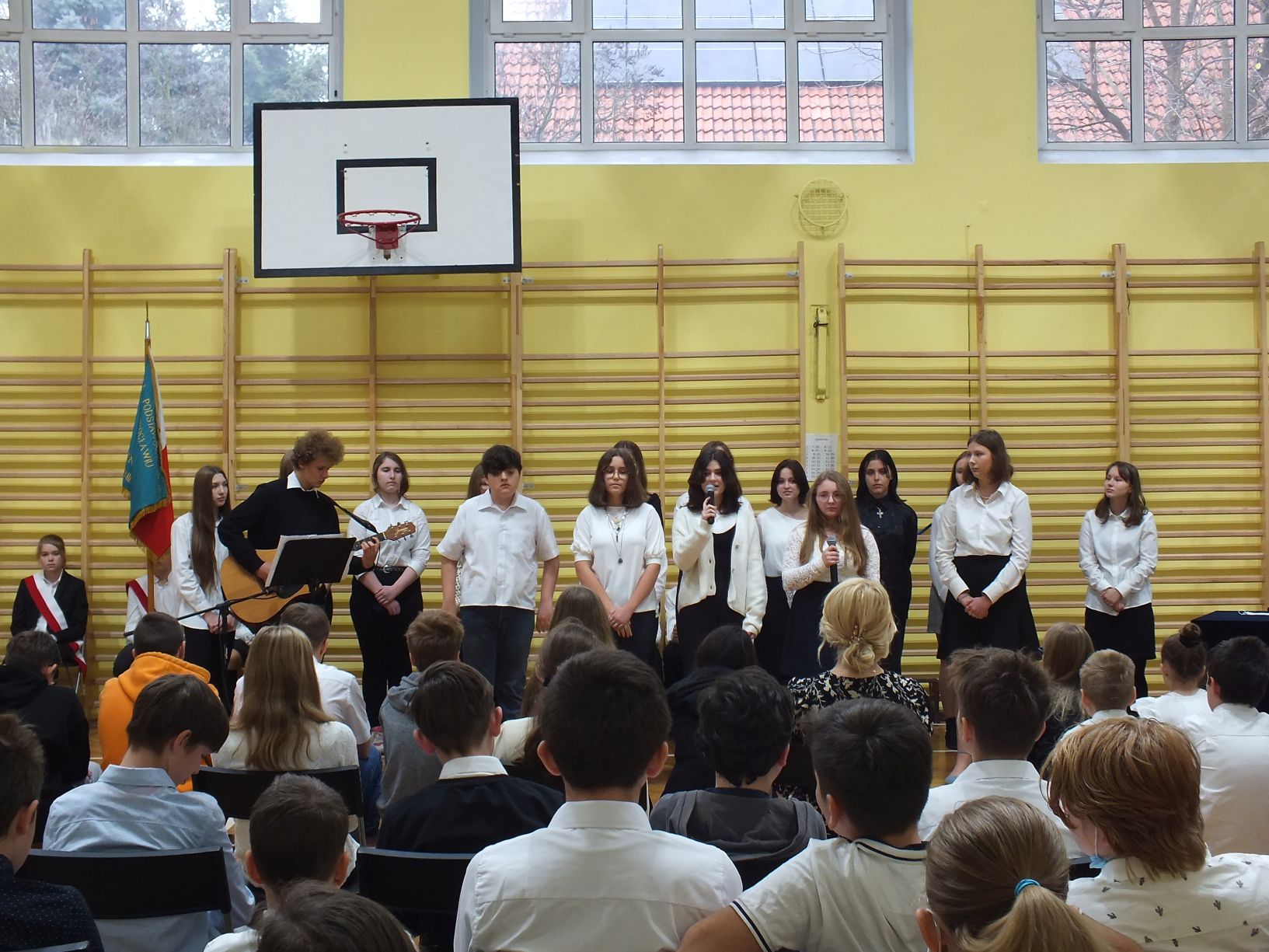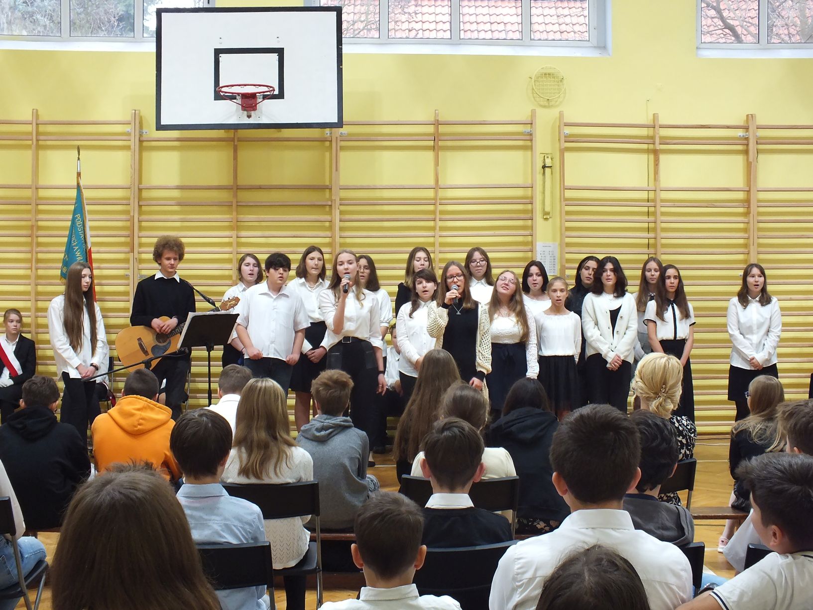 We wtorek 9-11-2021 uczniowie klas 8a i 8b przy wsparciu p. Dominiki Gromali i p. Alicji Wiłkowskiej przygotowali apel z okazji 103. rocznicy odzyskania przez Polskę niepodległości. Na scenie, udekorowanej przez p. Małgorzatę Donarską-Dubaj, pojawiły się talenty naszej szkoły. Usłyszeliśmy wzruszające wiersze i piosenki patriotyczne. Uczniowie naszej szkoły są niezwykle uzdolnieni artystycznie, a my mogliśmy docenić umiejętności Amelki (pianino i recytacja), Grzesia (gitara i wokal), Julii, Szymona, Zuzi i Zuzi, Hani, Alony oraz Wiki (śpiew i recytacja), Zuzi, Mai, Huberta, Ireny, Igi, Oli, Wiki oraz Illi (recytacja). Kto był – docenił, kto nie był – niech żałuje.