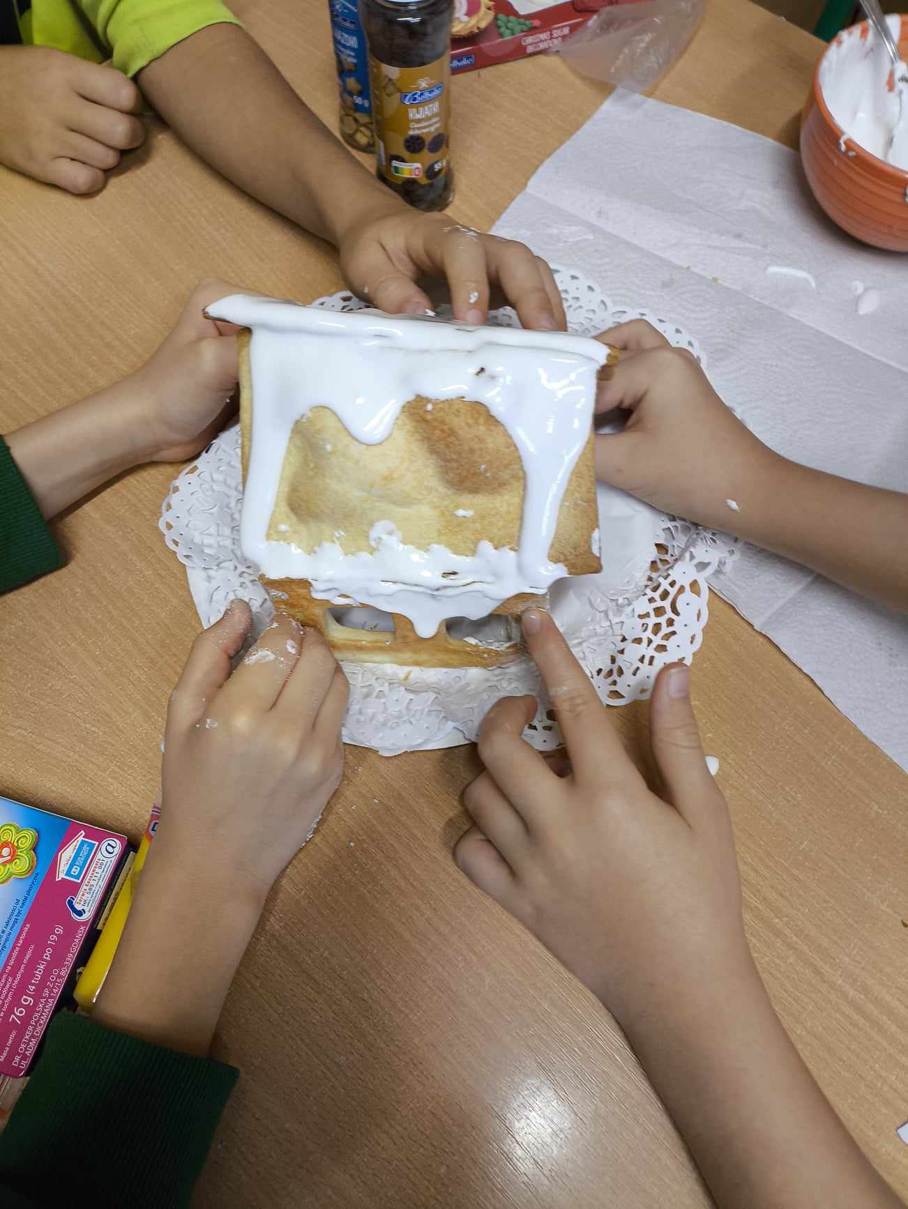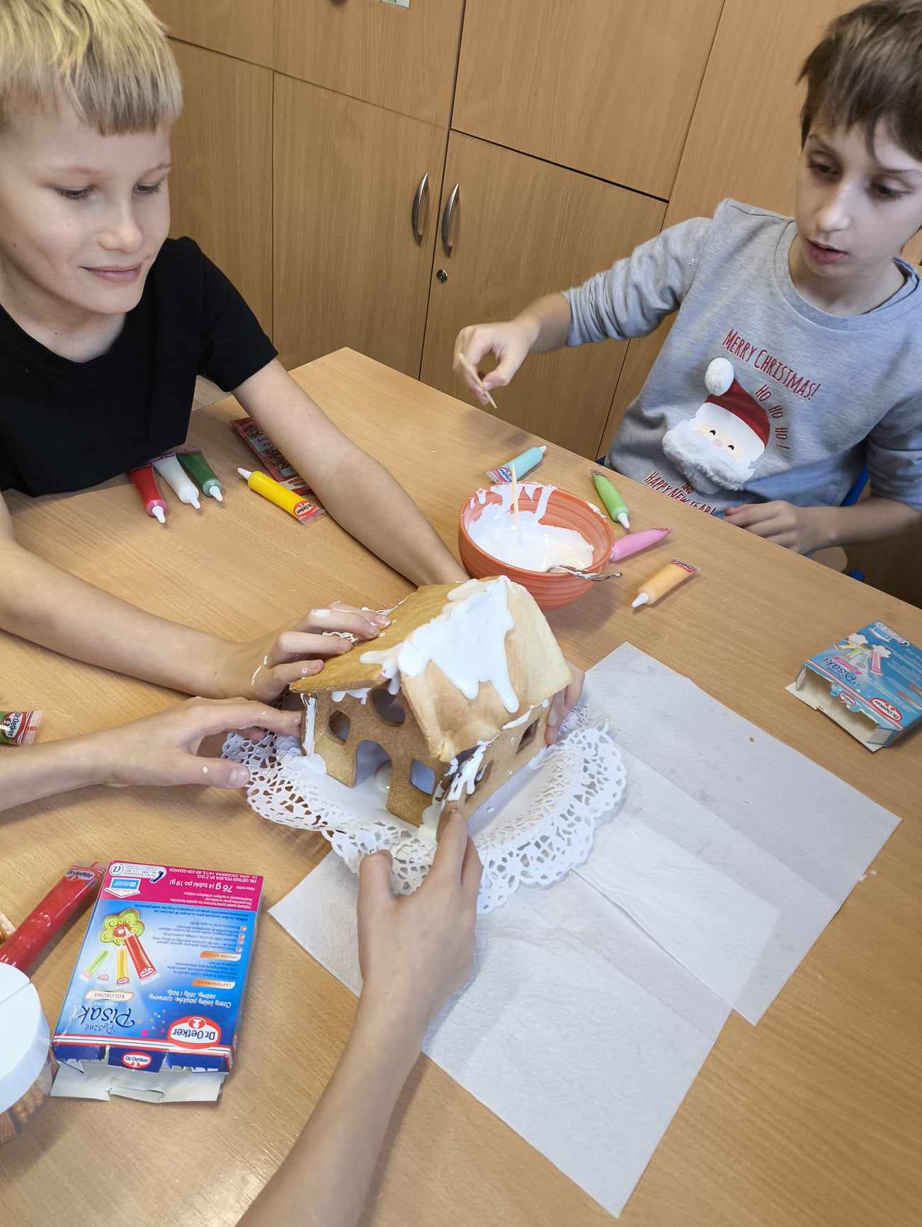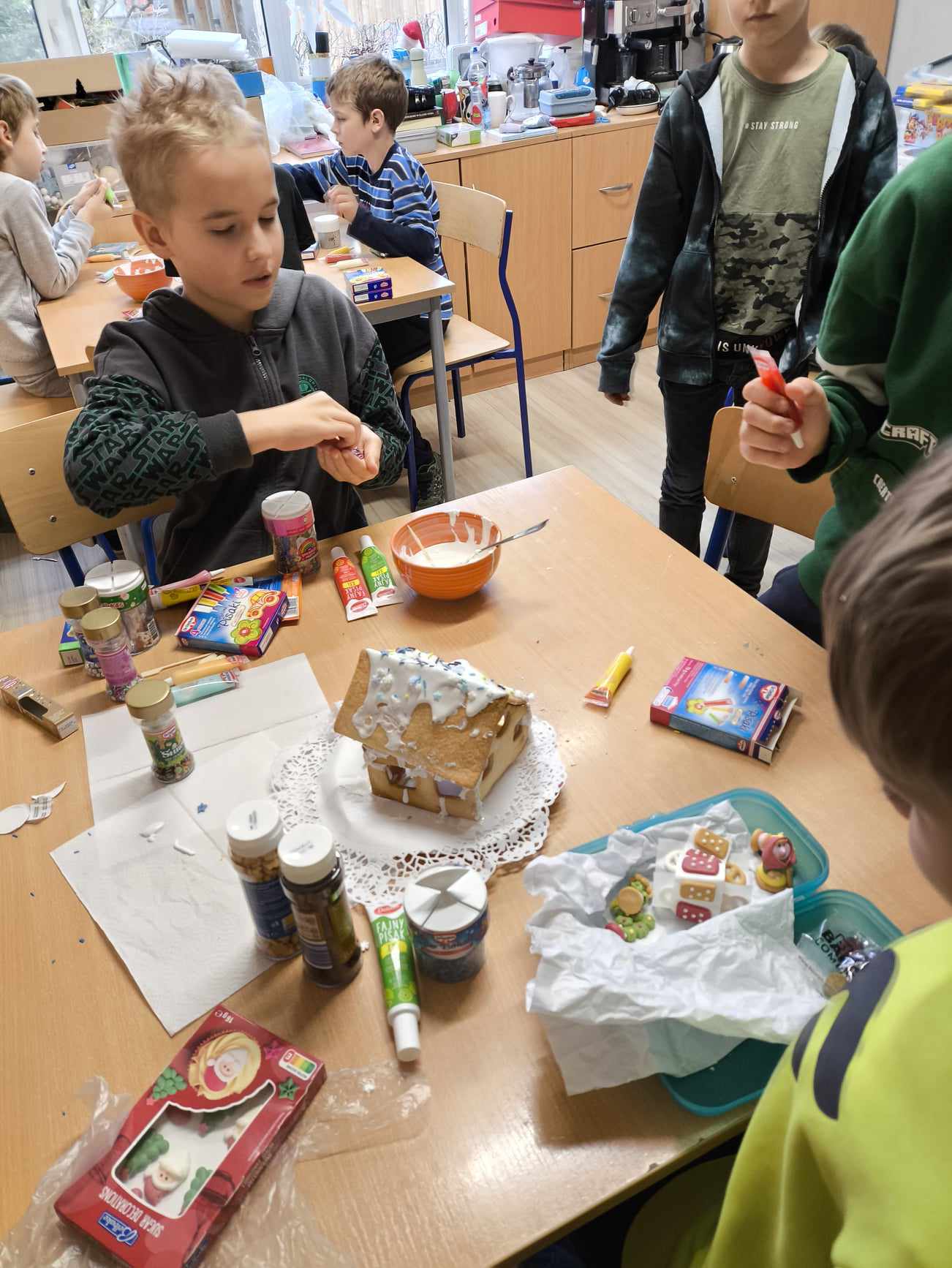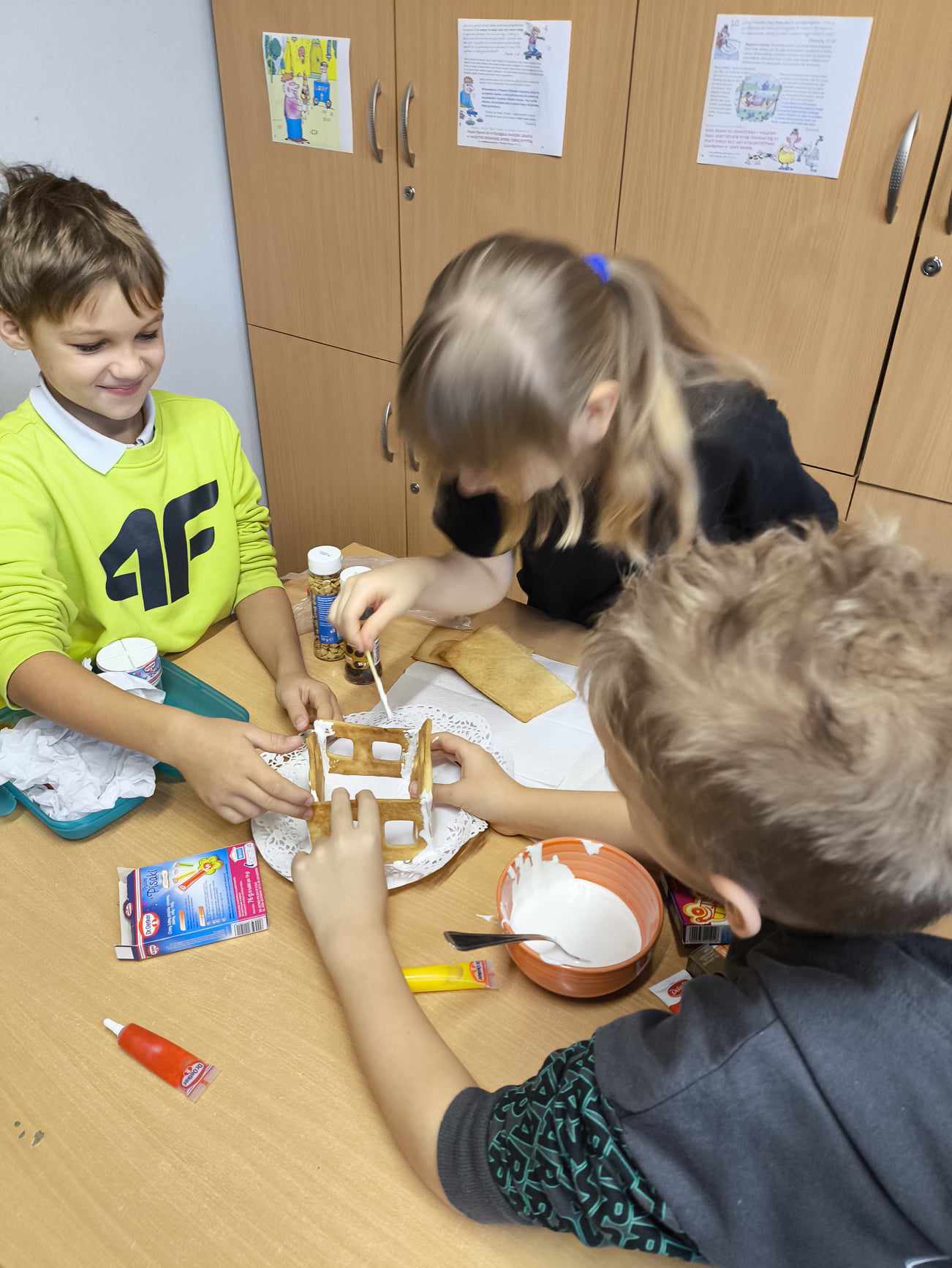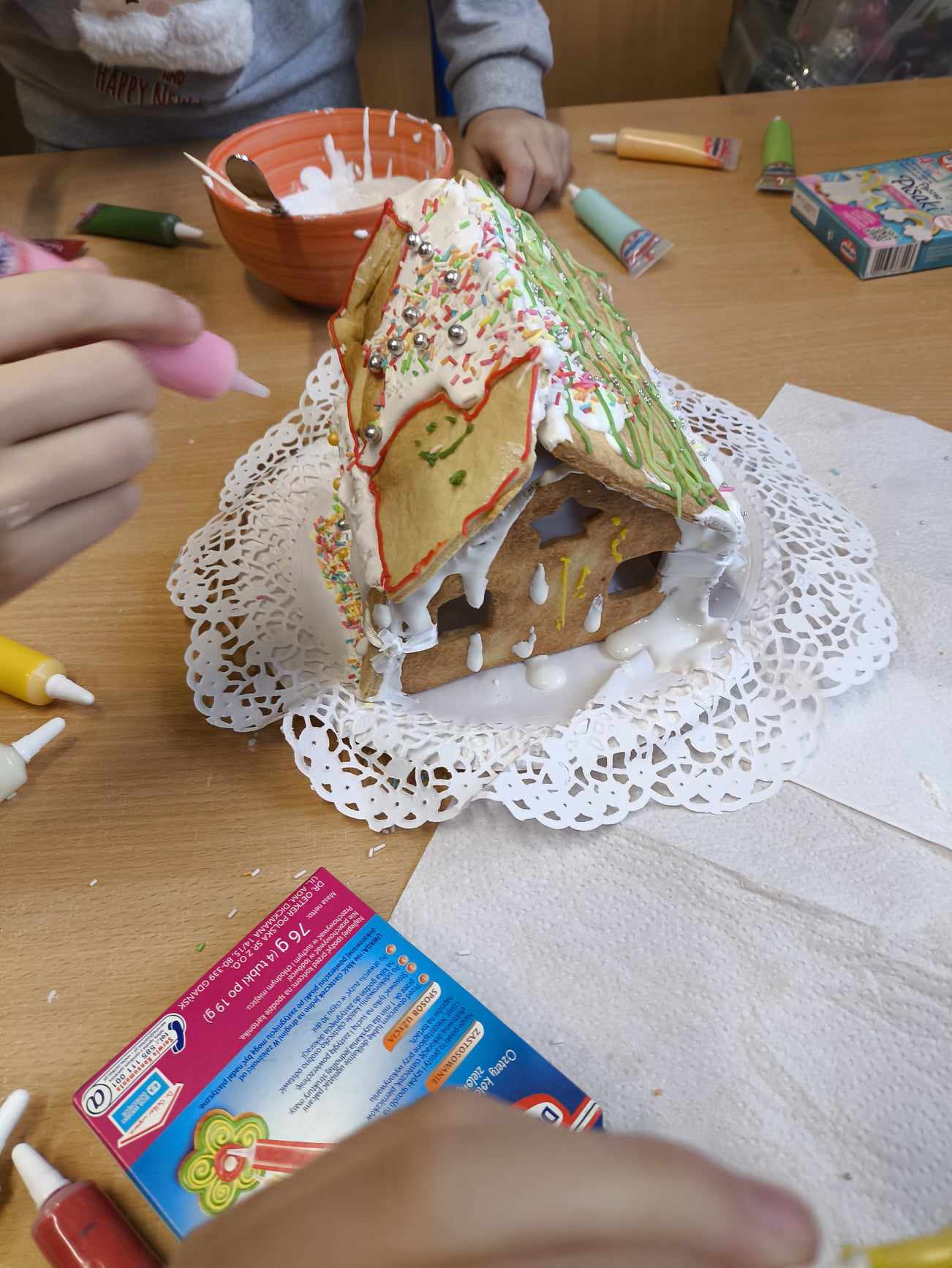 Podczas ostatnich zajęć przed świętami tworzyliśmy domki zimowe z ciastek i lukru. Najwięcej zabawy było jednak podczas dekorowania 😀