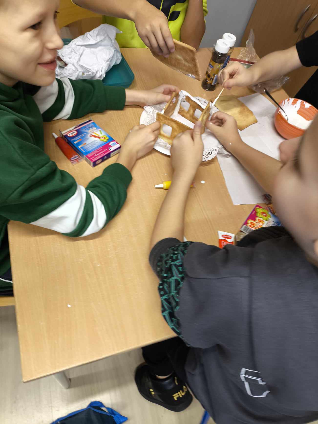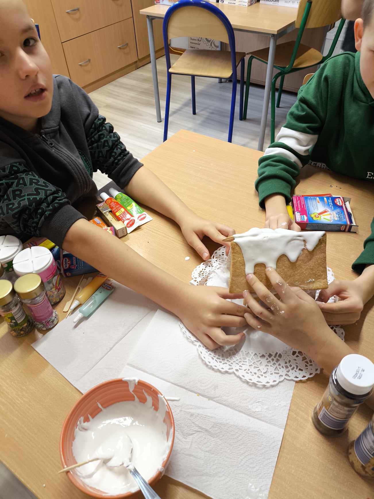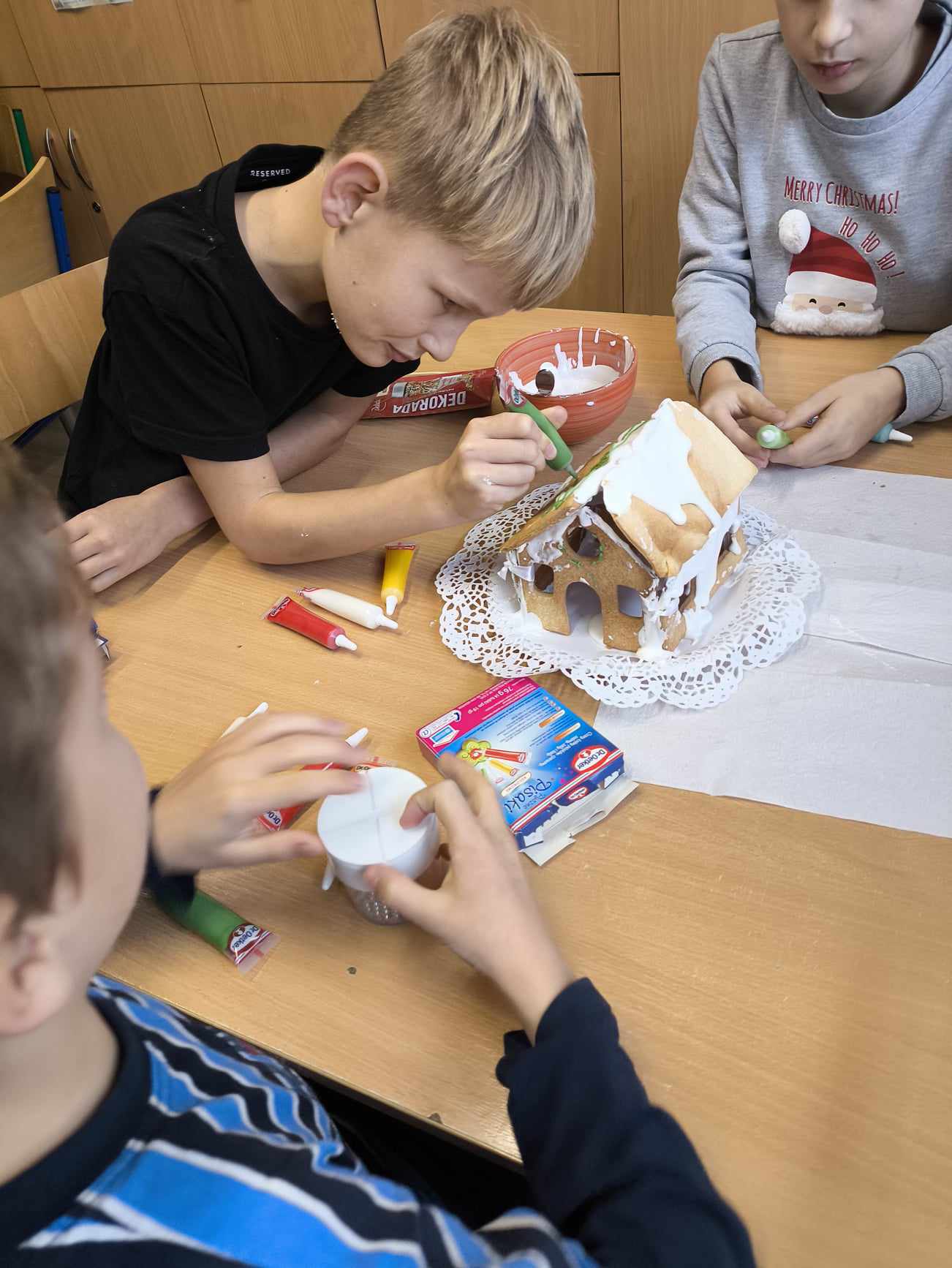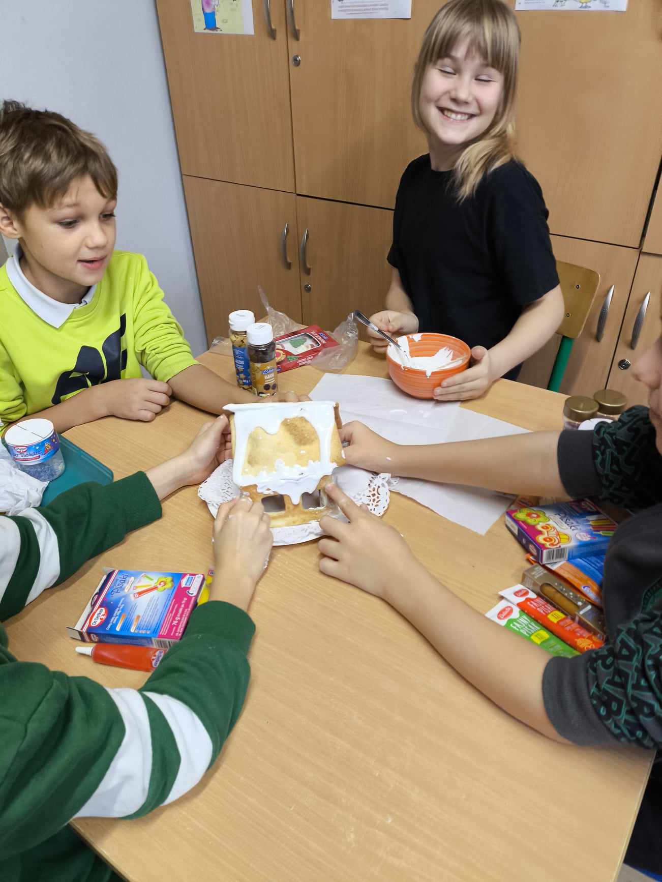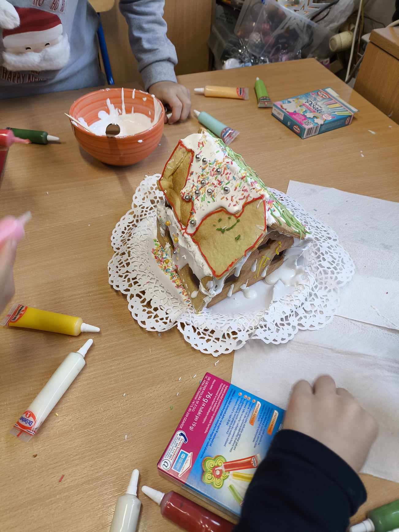Podczas ostatnich zajęć przed świętami tworzyliśmy domki zimowe z ciastek i lukru. Najwięcej zabawy było jednak podczas dekorowania 😀