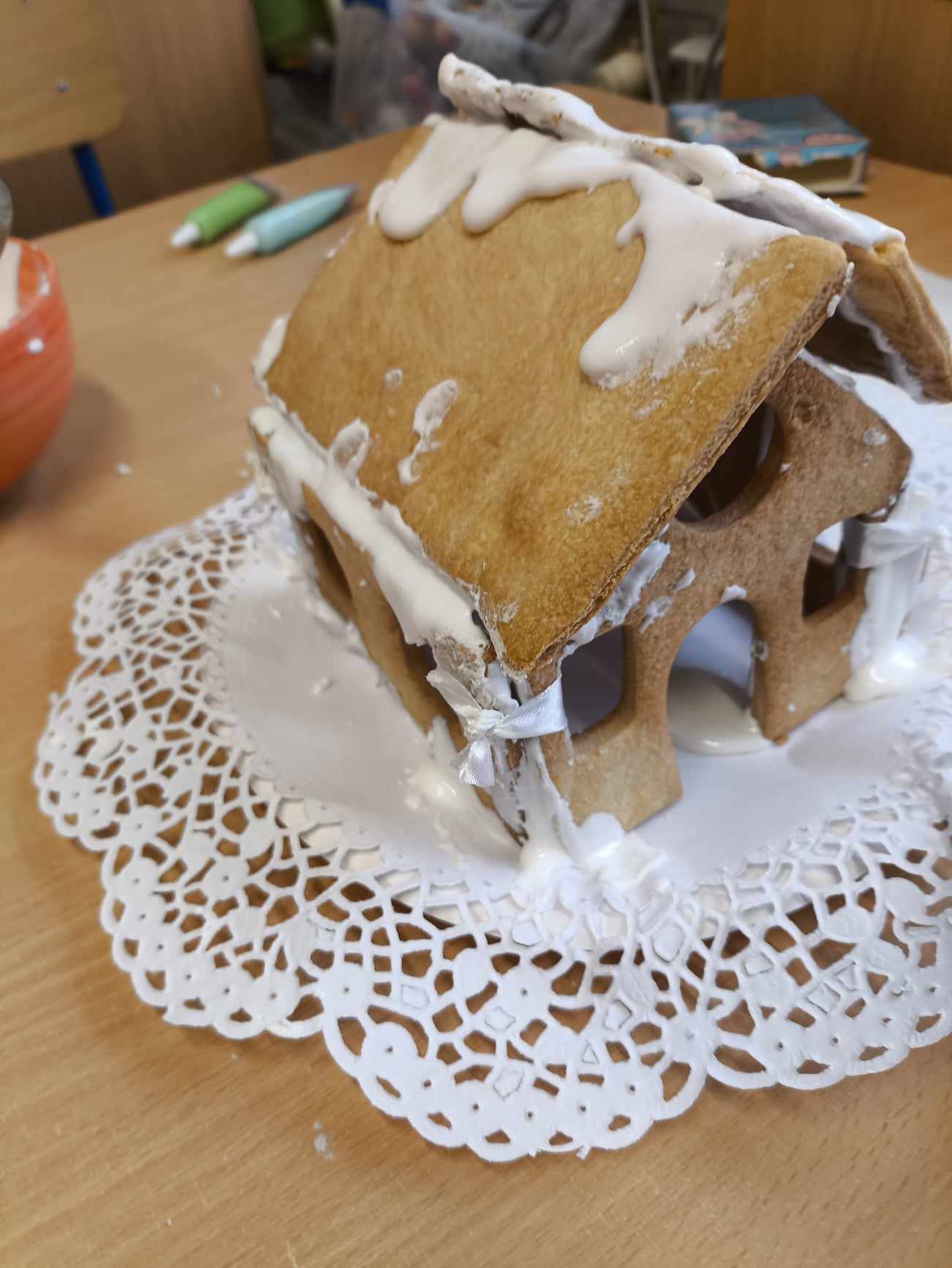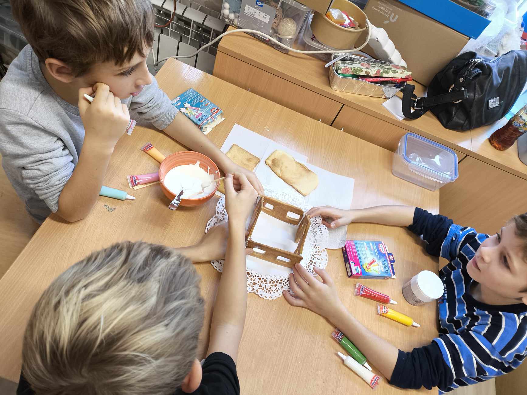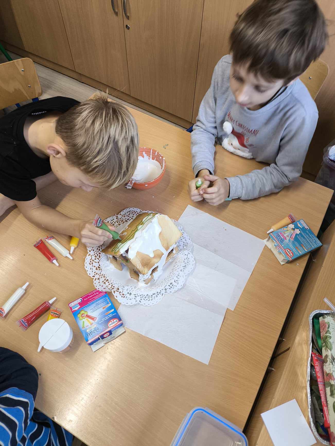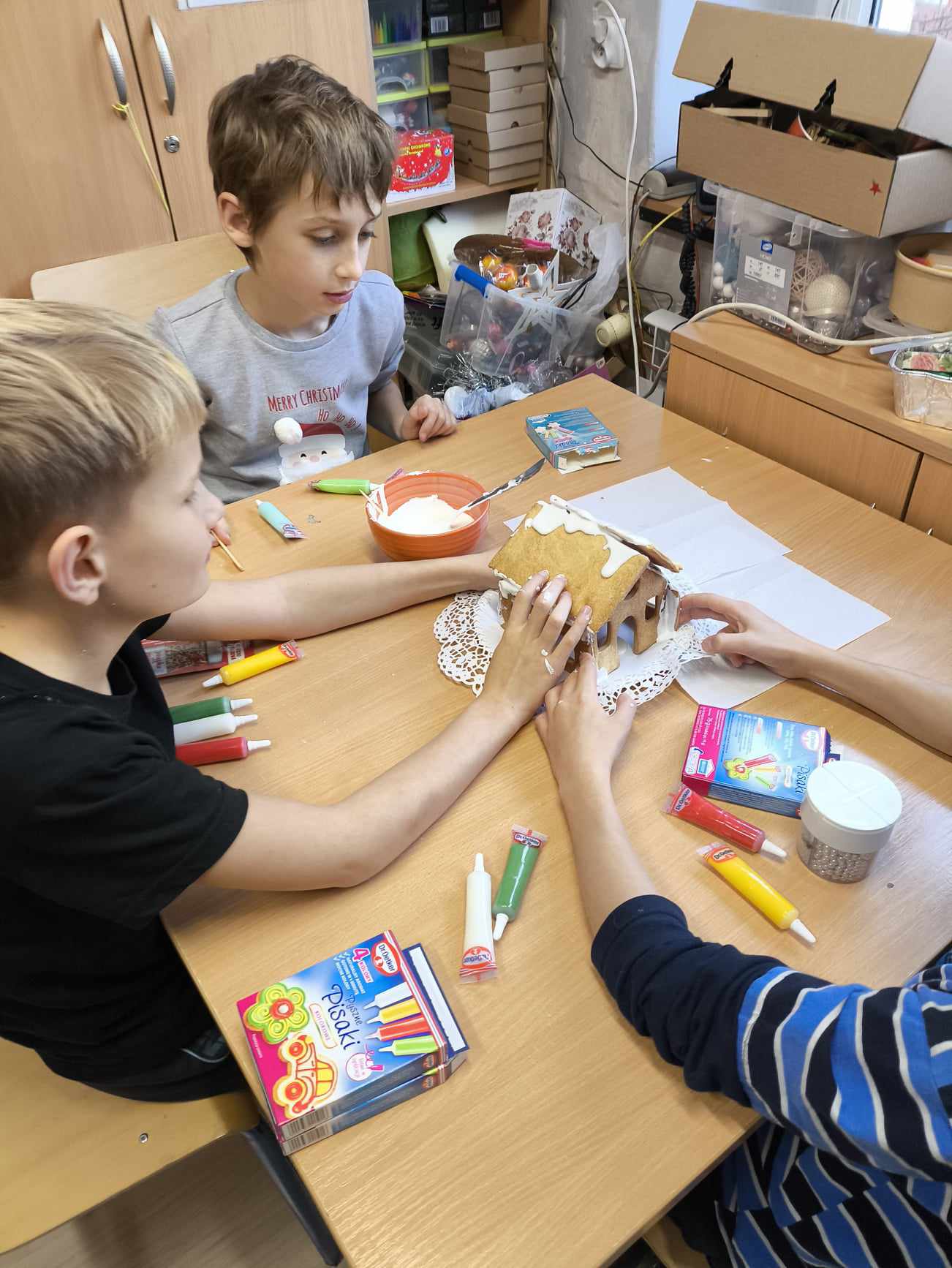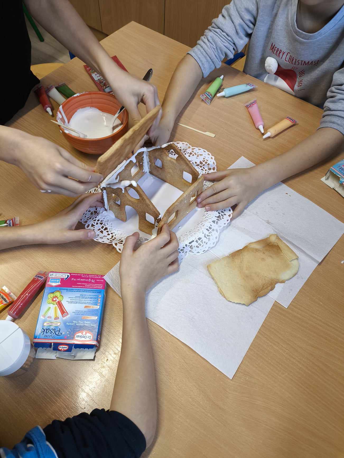 Podczas ostatnich zajęć przed świętami tworzyliśmy domki zimowe z ciastek i lukru. Najwięcej zabawy było jednak podczas dekorowania 😀