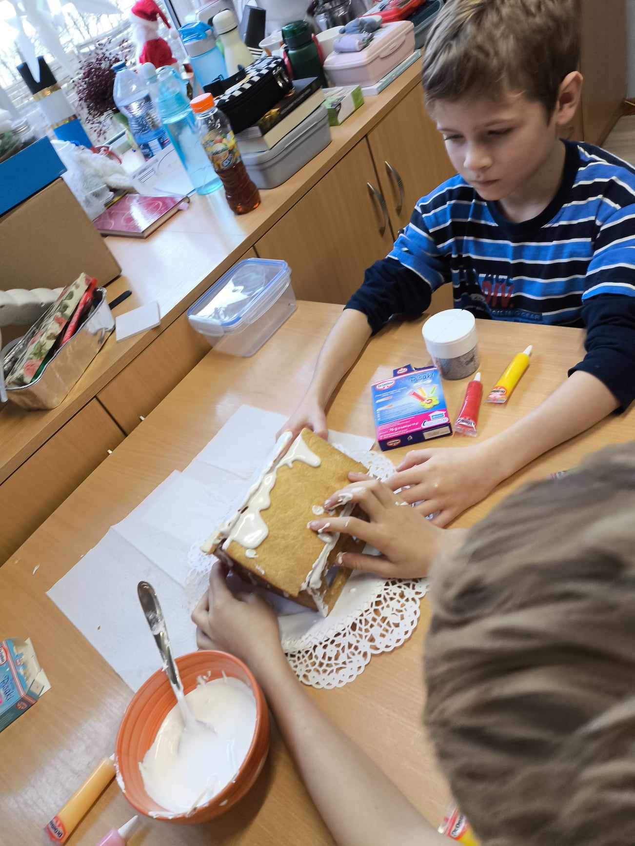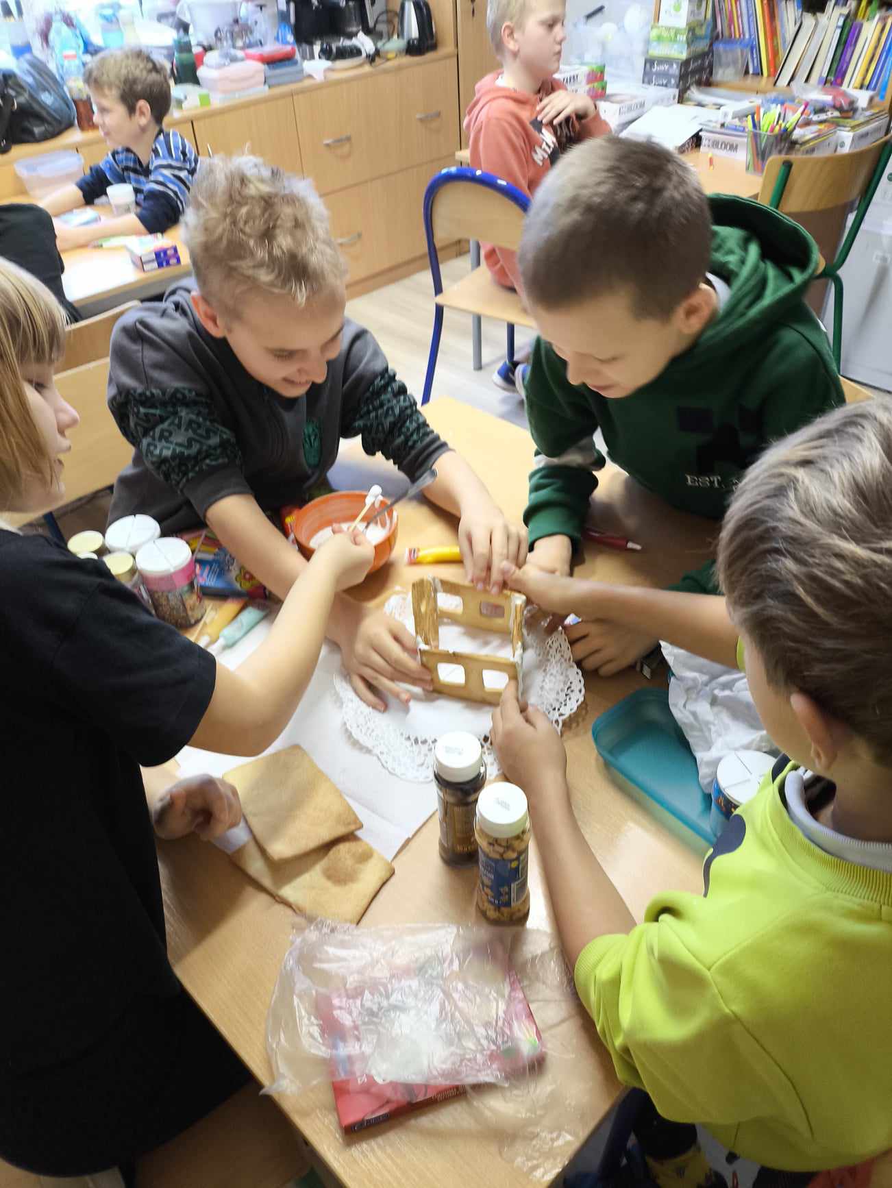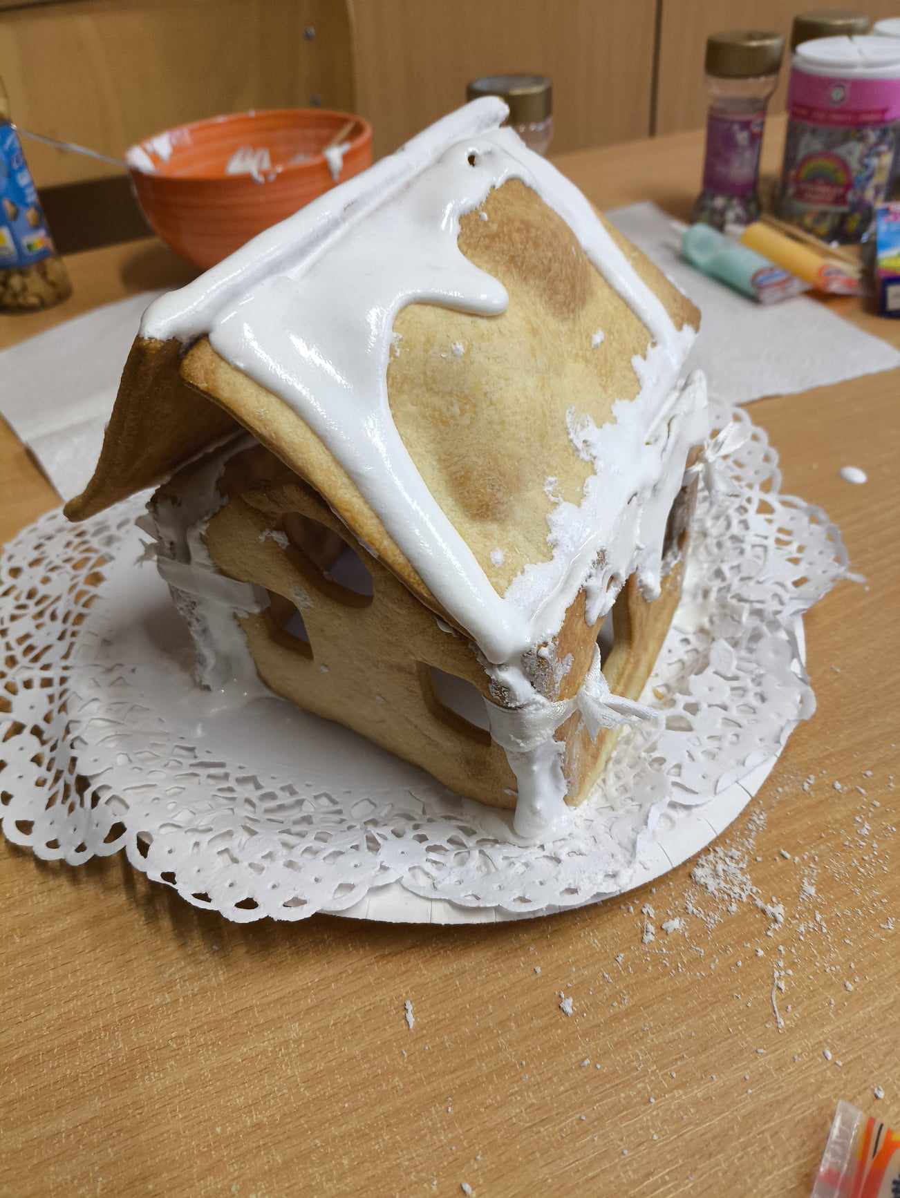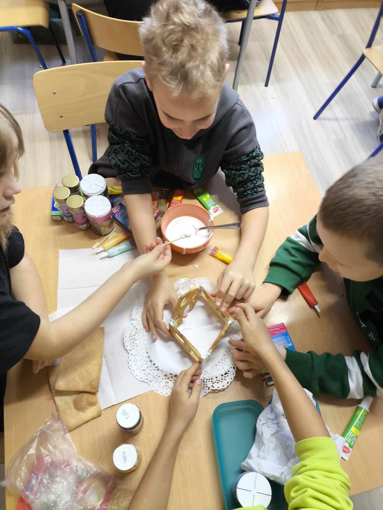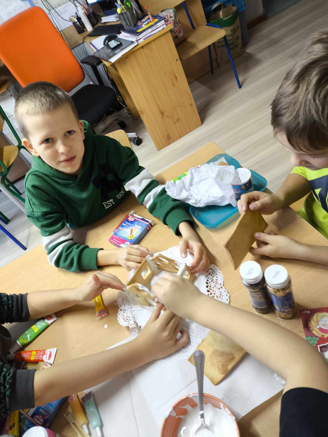Podczas ostatnich zajęć przed świętami tworzyliśmy domki zimowe z ciastek i lukru. Najwięcej zabawy było jednak podczas dekorowania 😀