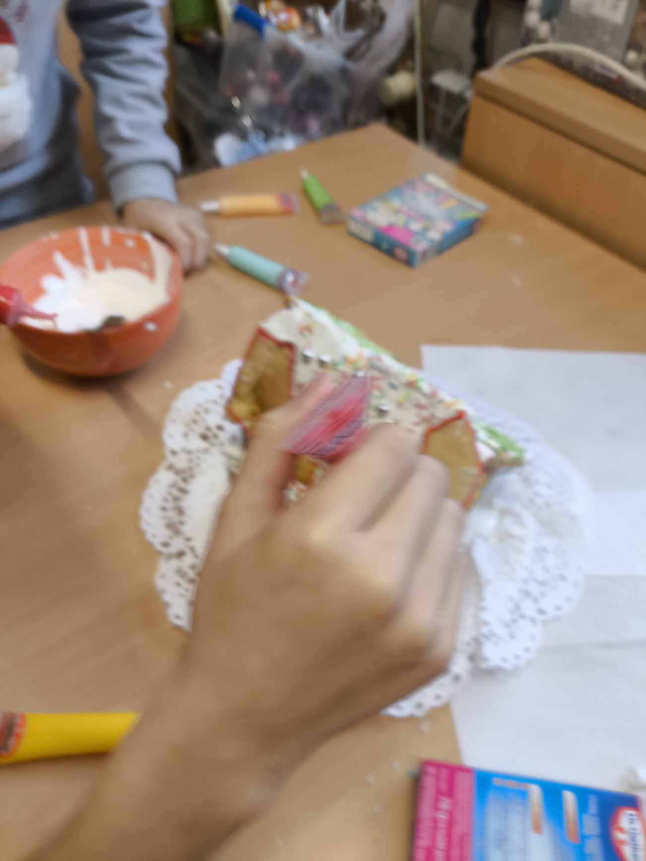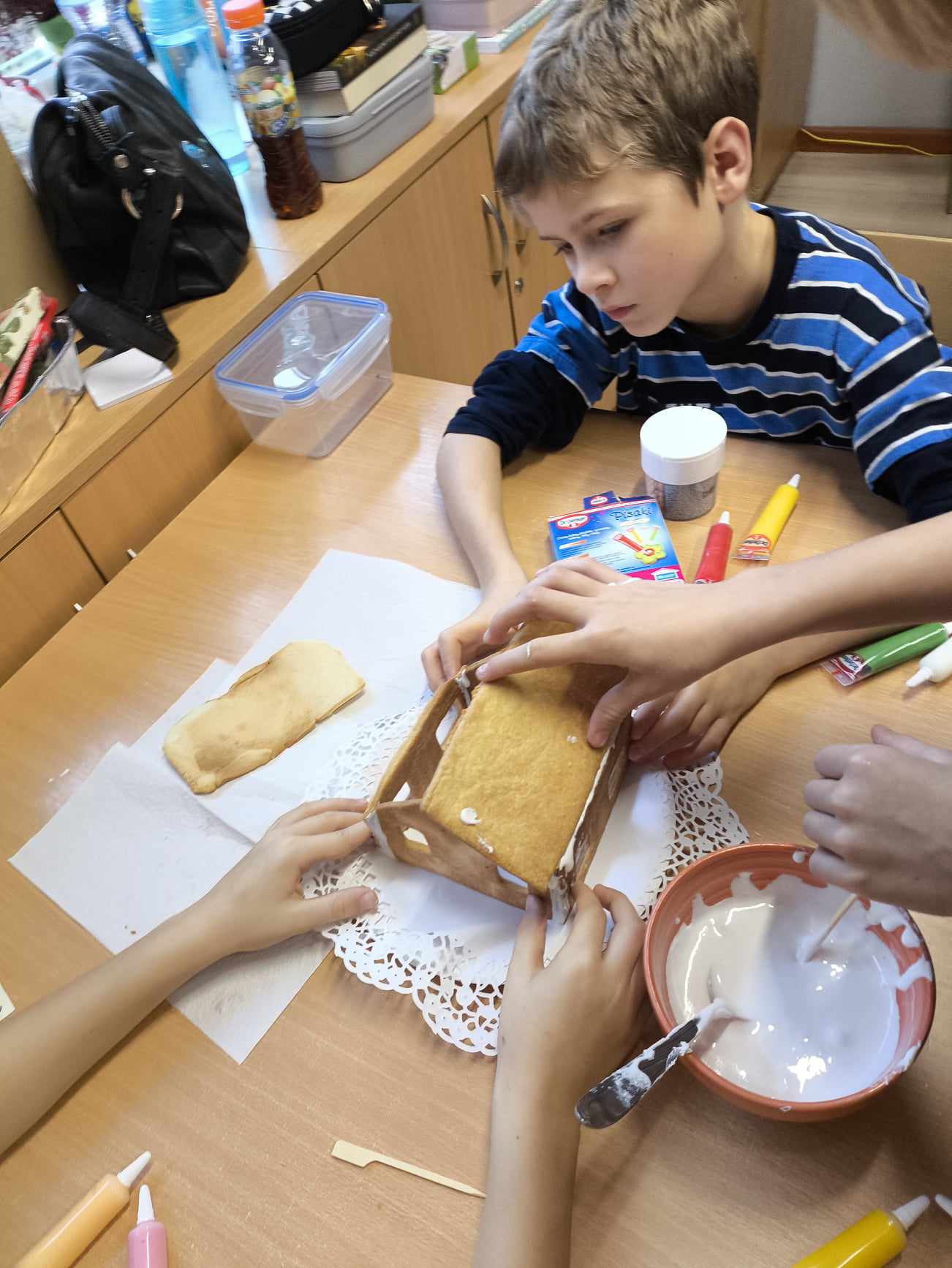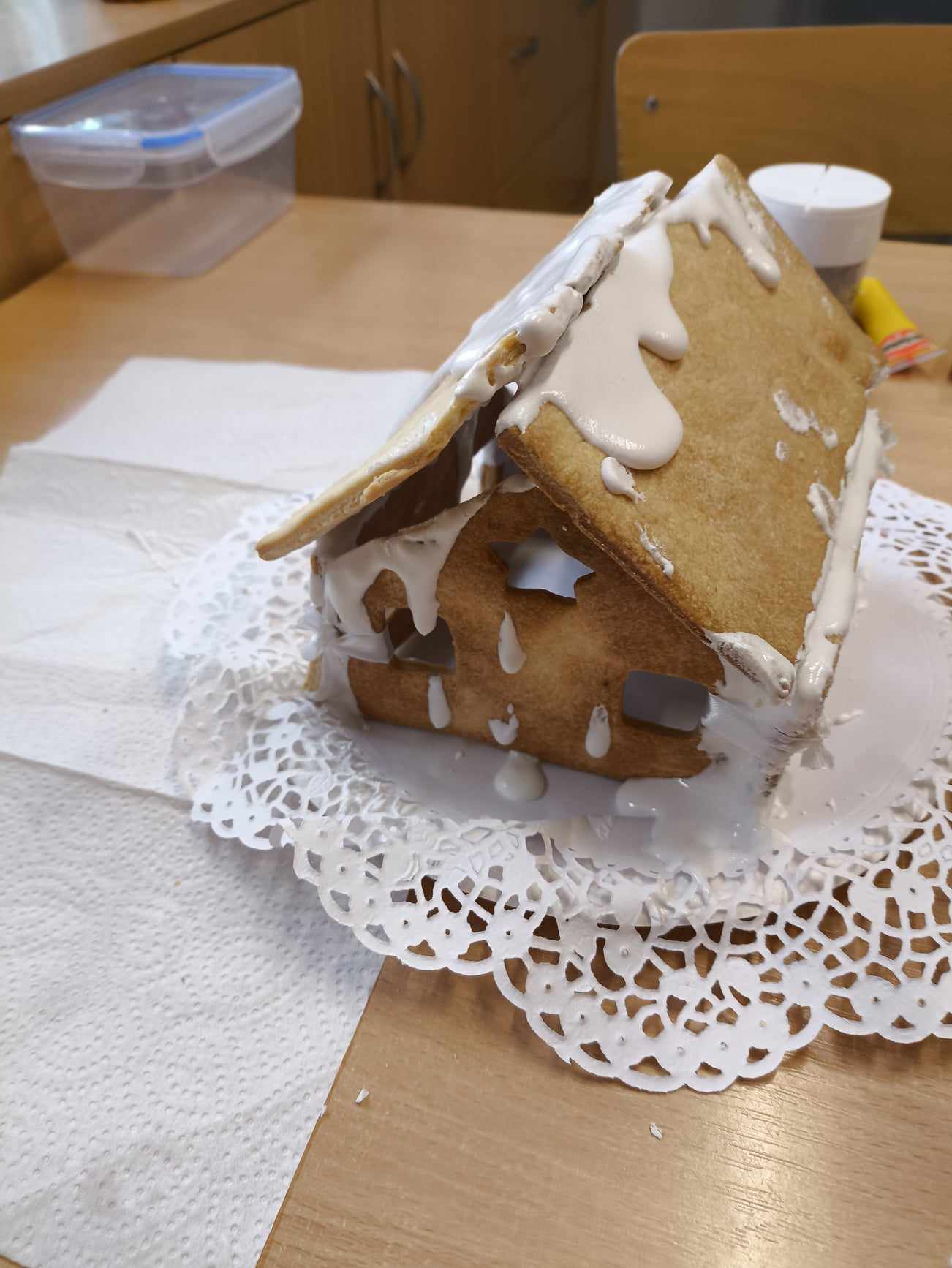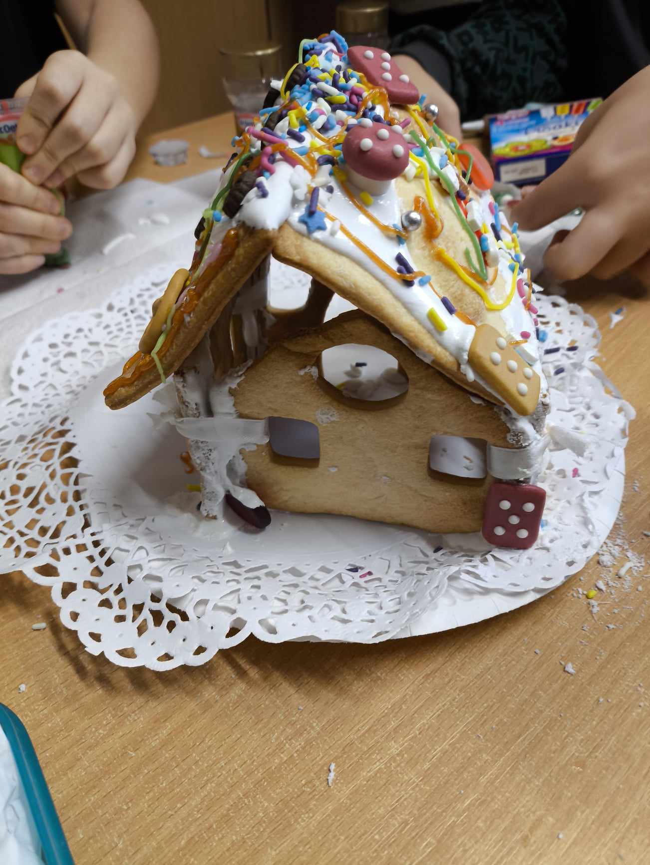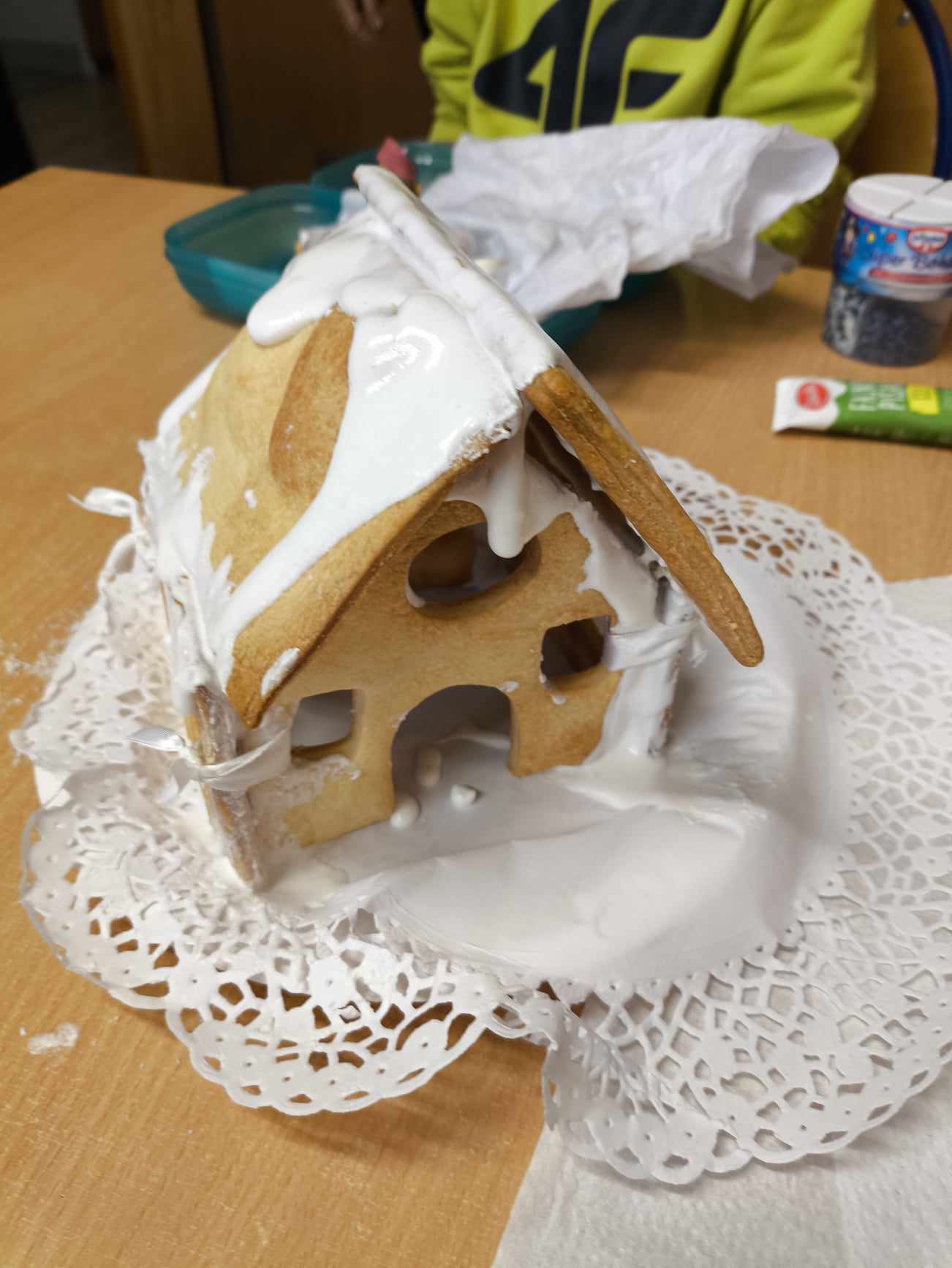 Podczas ostatnich zajęć przed świętami tworzyliśmy domki zimowe z ciastek i lukru. Najwięcej zabawy było jednak podczas dekorowania 😀