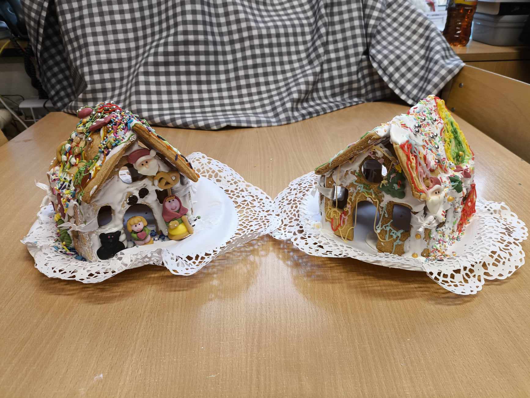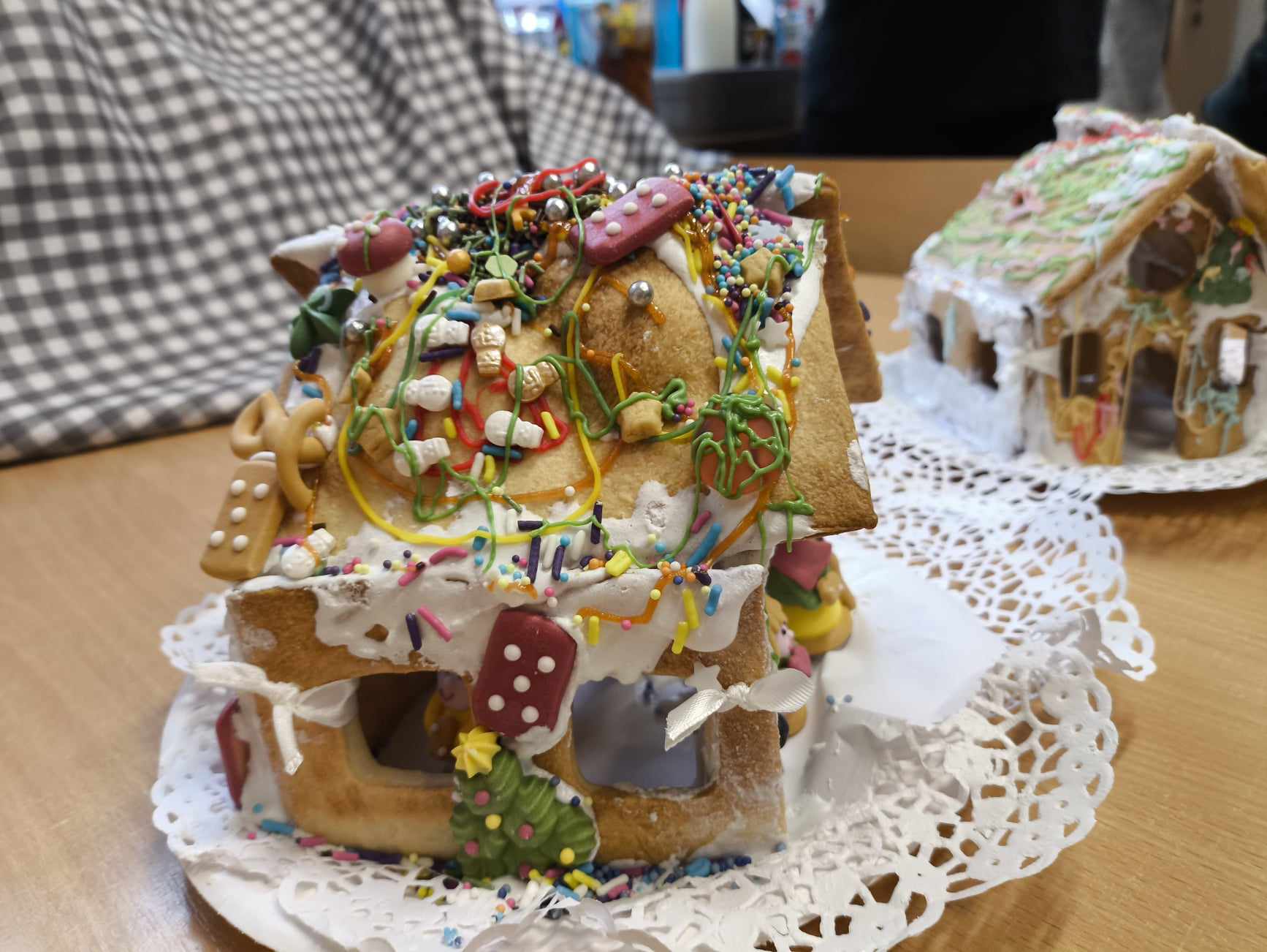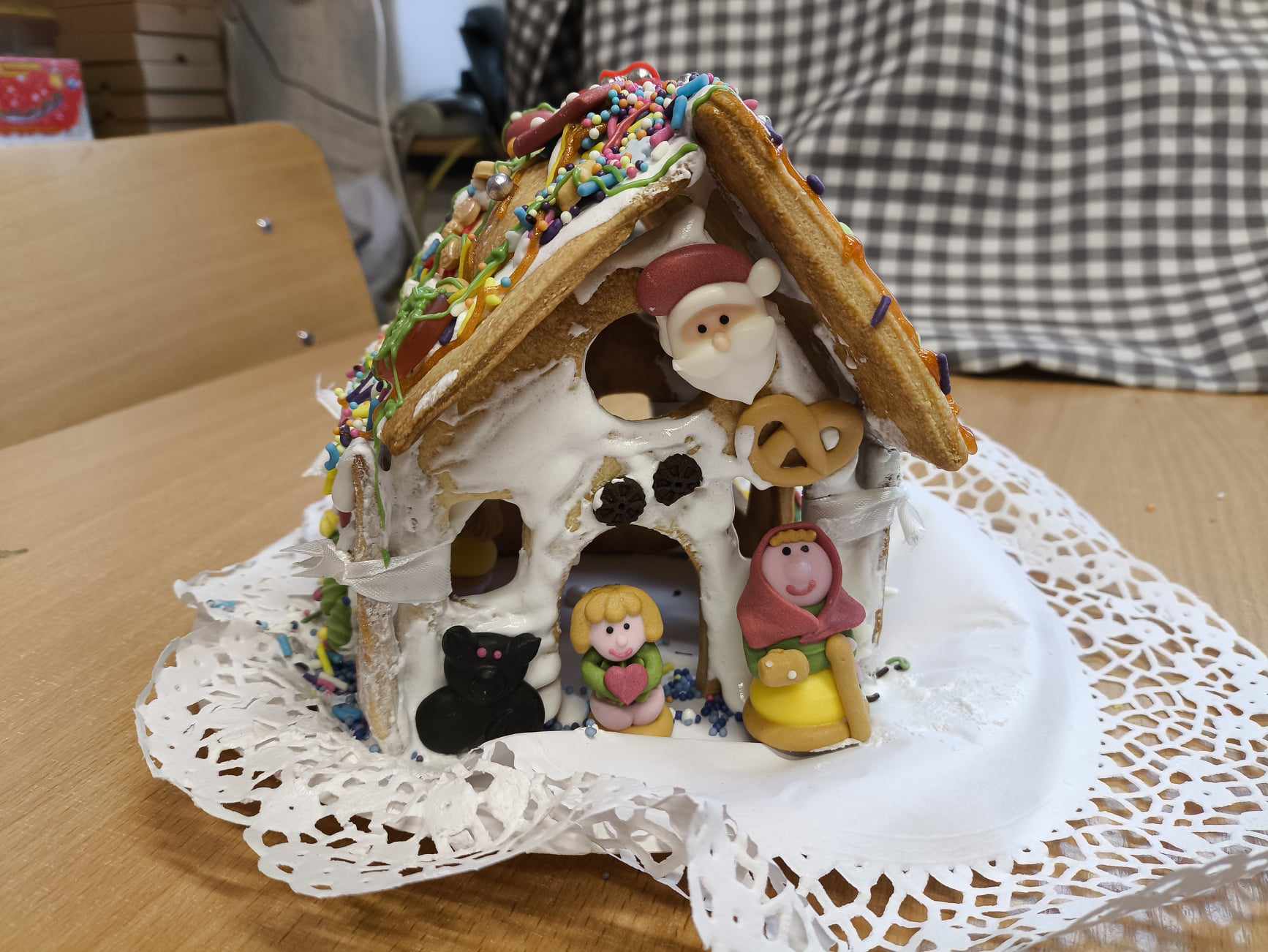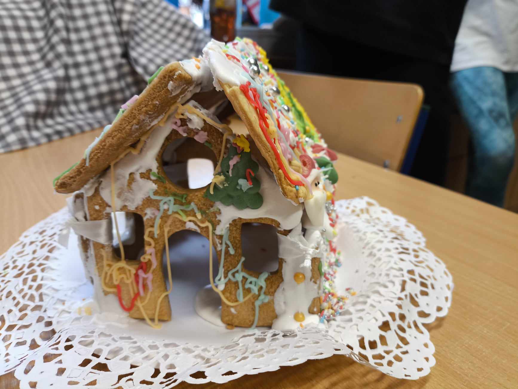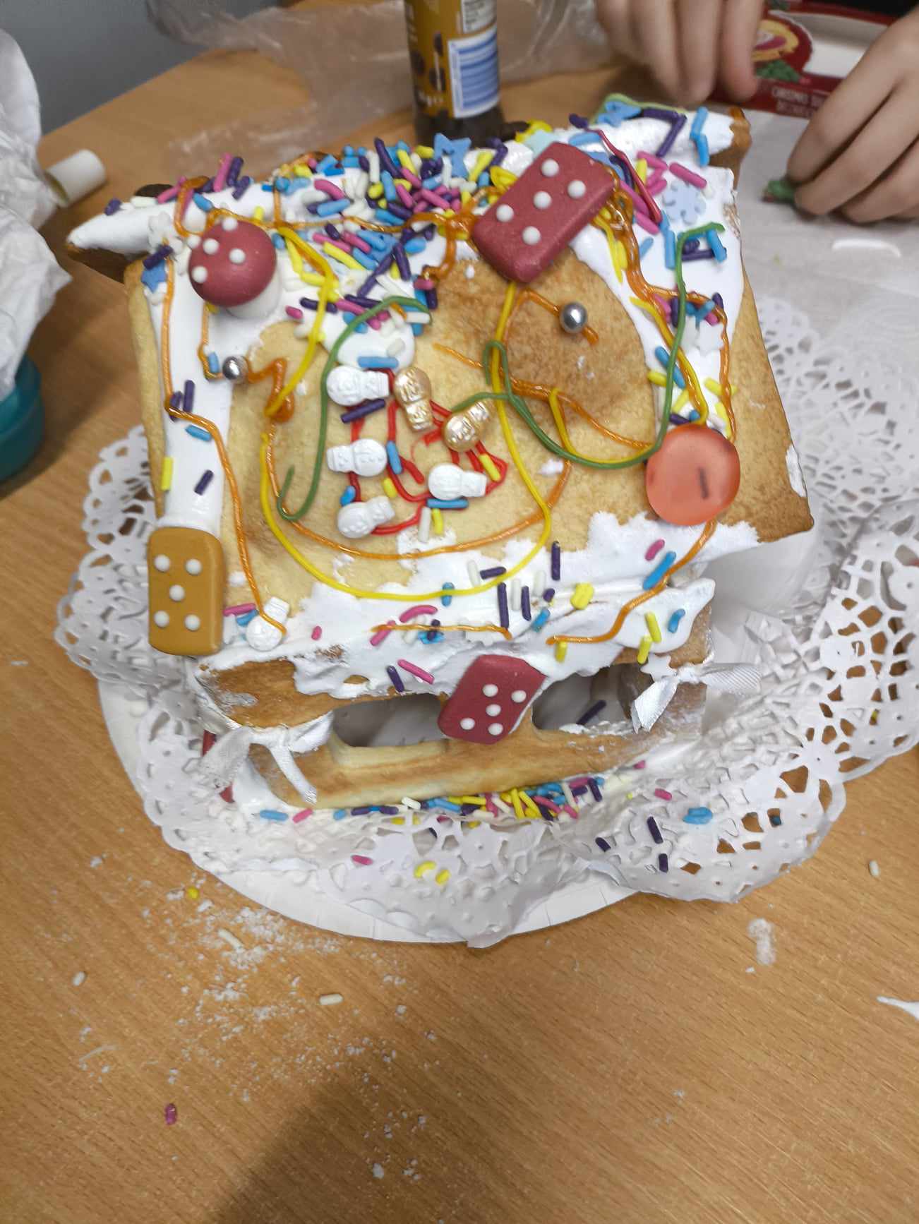 Podczas ostatnich zajęć przed świętami tworzyliśmy domki zimowe z ciastek i lukru. Najwięcej zabawy było jednak podczas dekorowania 😀