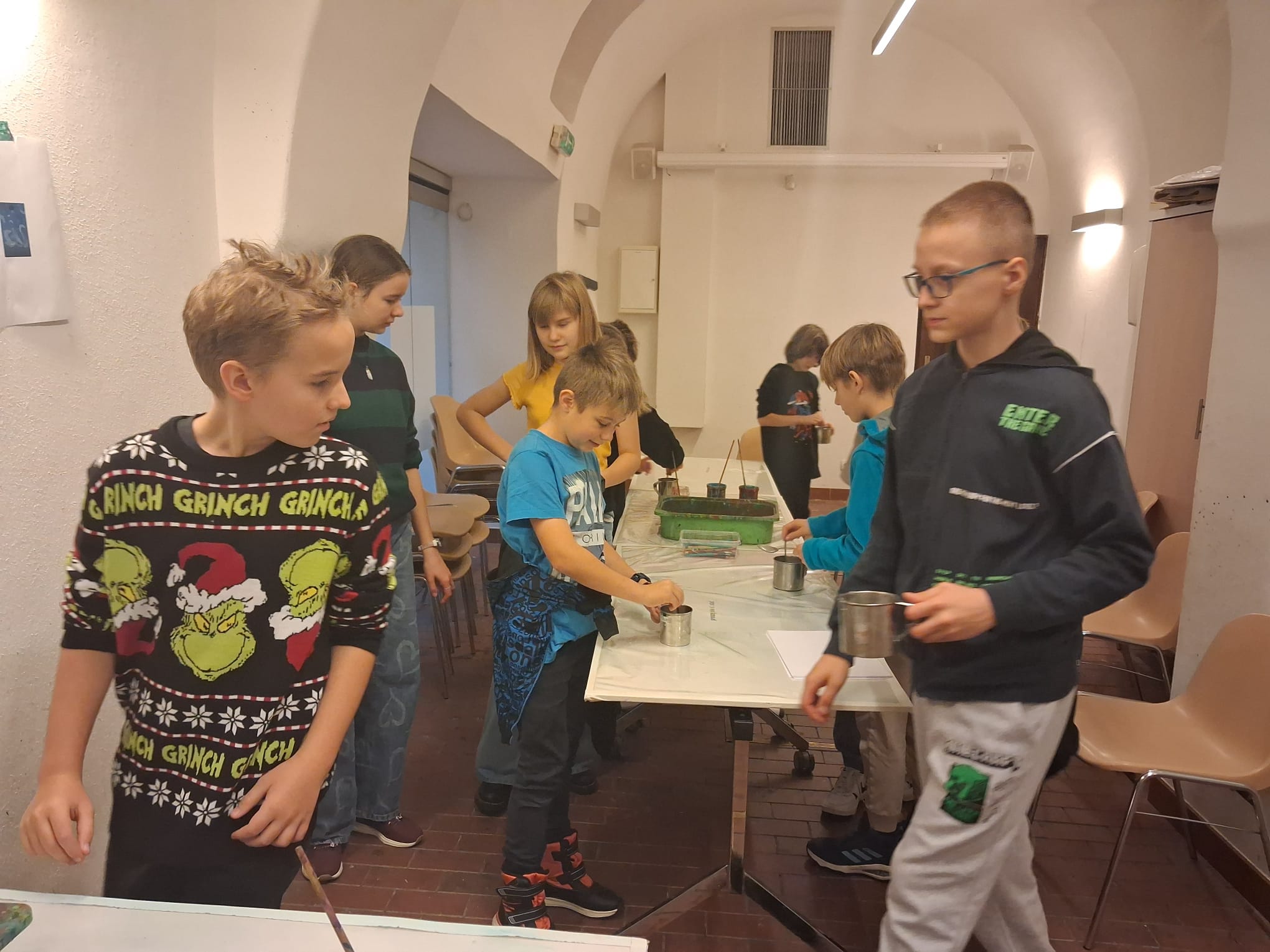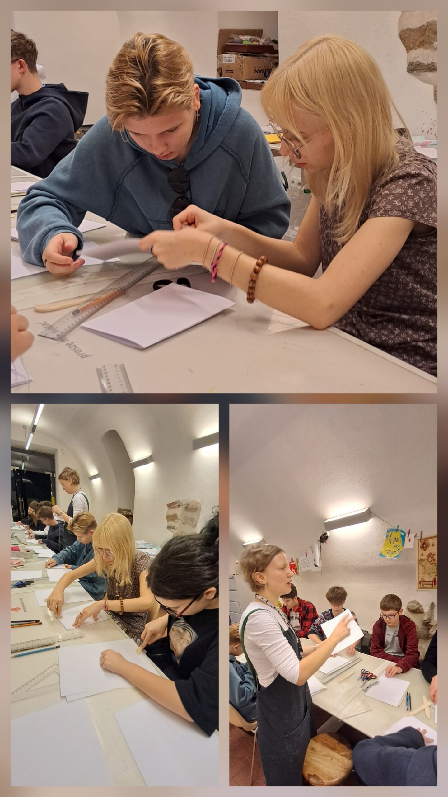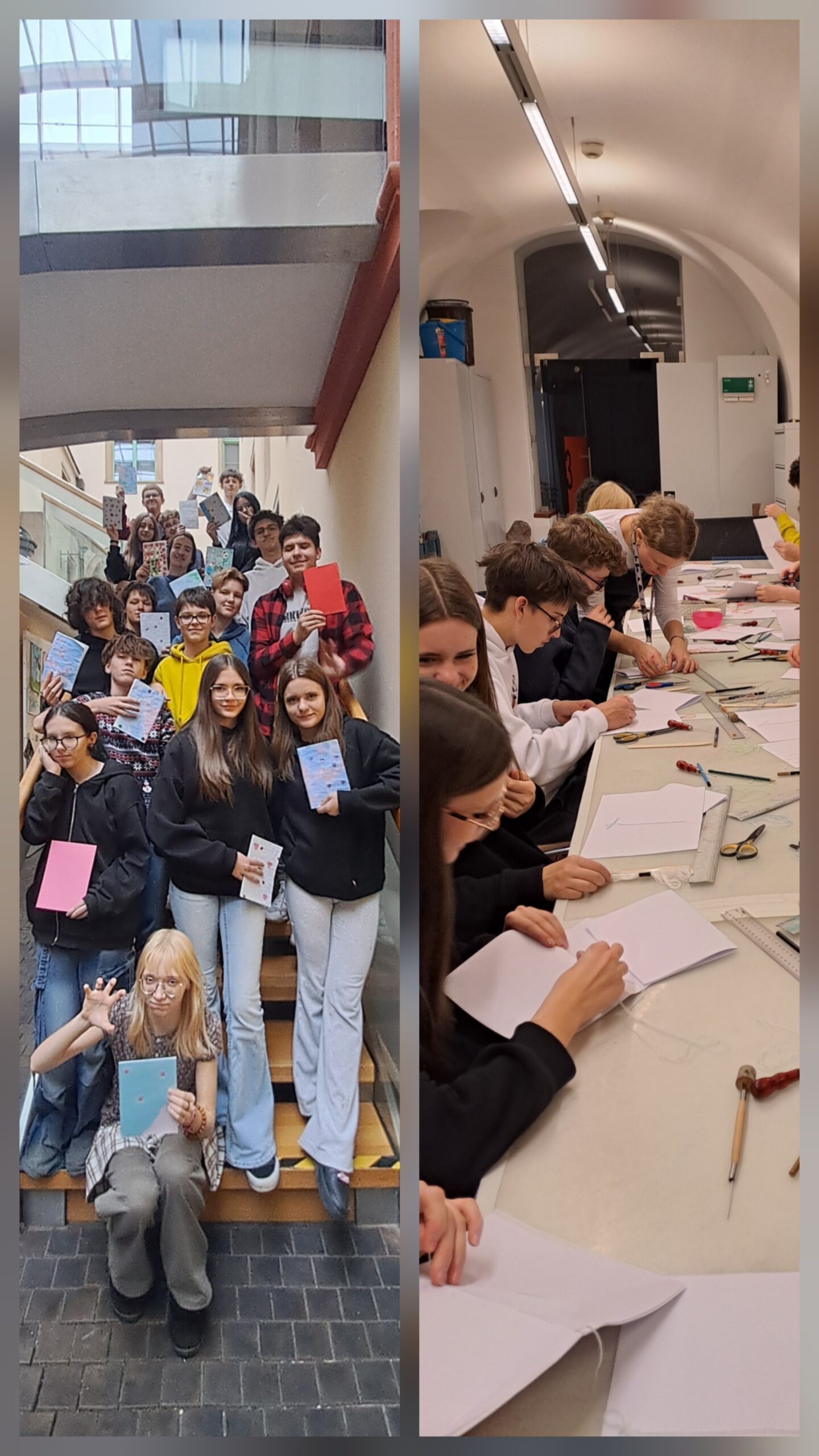 Z kolei klasa ósma uczestniczyła w warsztatach introligatorskich, podczas których uczniowie poznali tajniki dziewiętnastowiecznego rzemiosła książkowego. Dowiedzieli się, jak wyglądała dawna introligatornia, czym zajmował się introligator i jakie techniki pozwalały na tworzenie trwałych, ręcznie oprawianych tomów. Zwieńczeniem zajęć było wykonanie własnych, ręcznie szytych notatników, które uczniowie zabrali ze sobą jako pamiątkę i dowód zdobytych umiejętności.