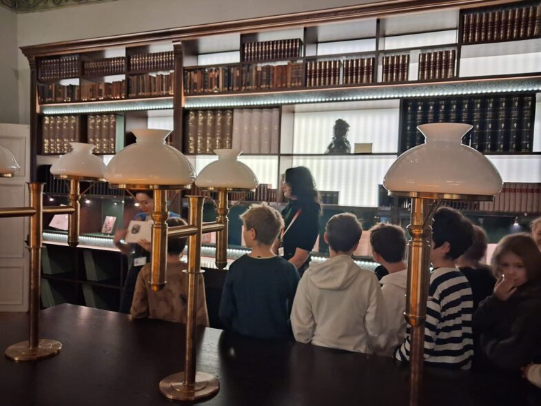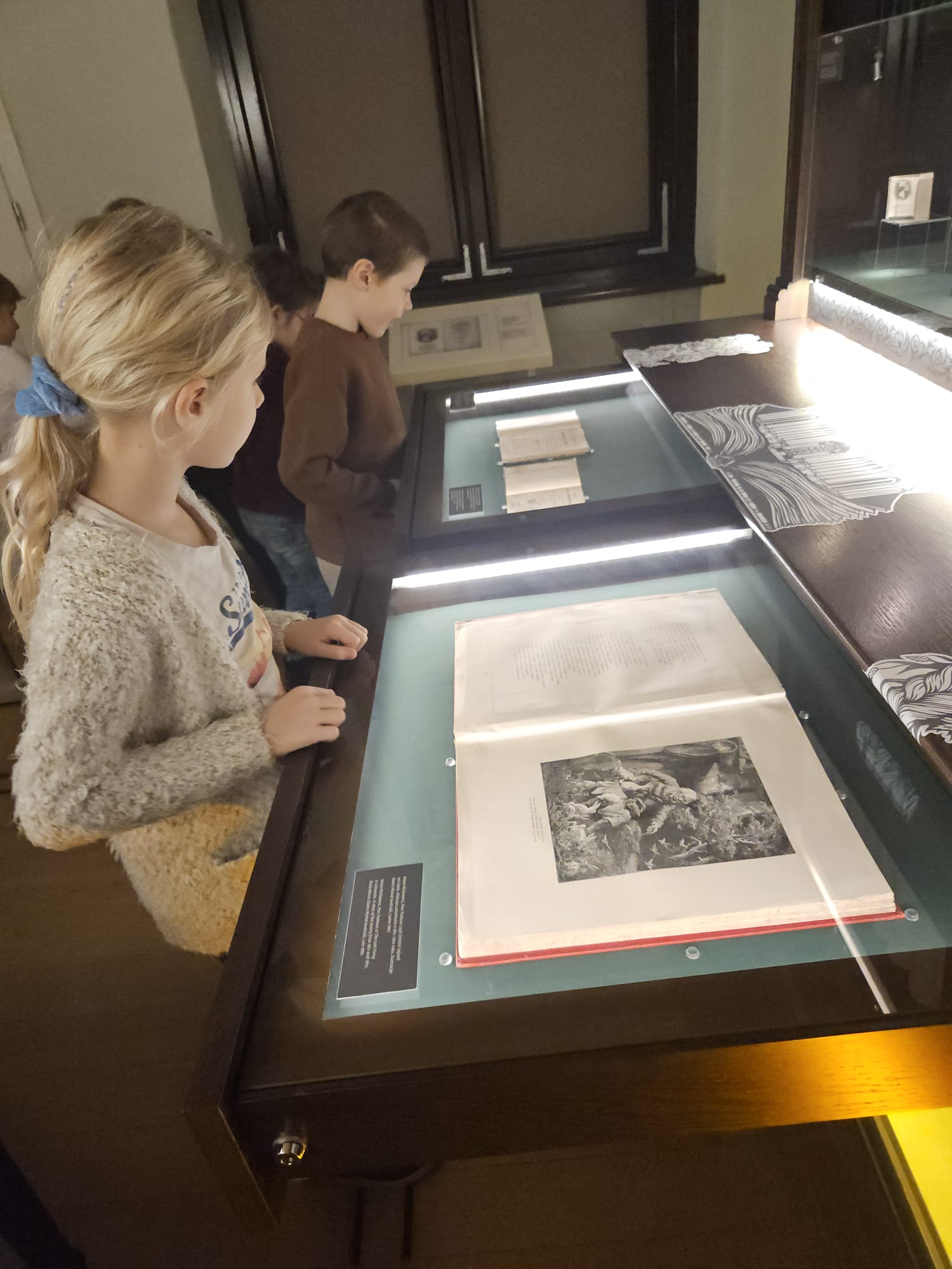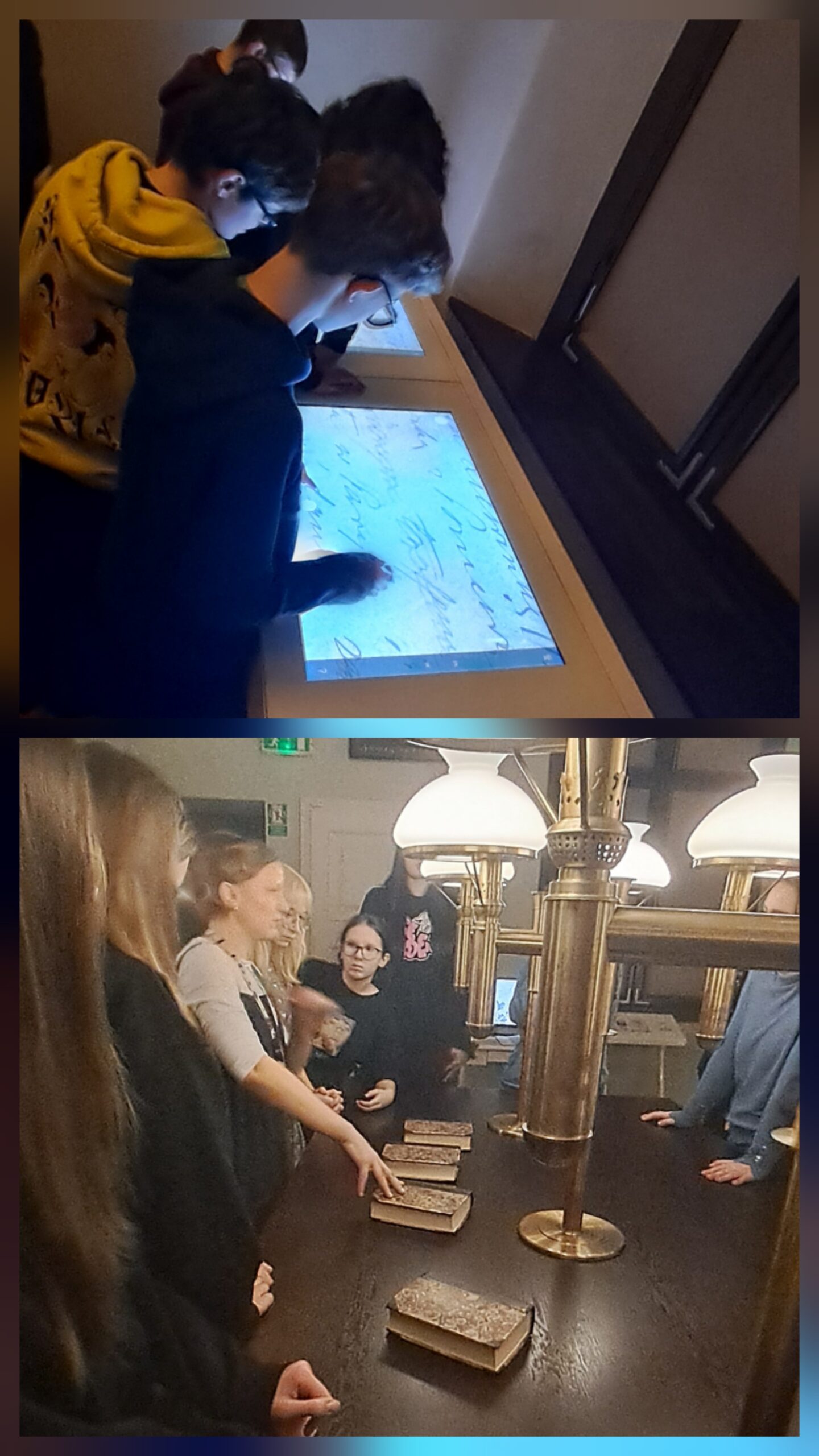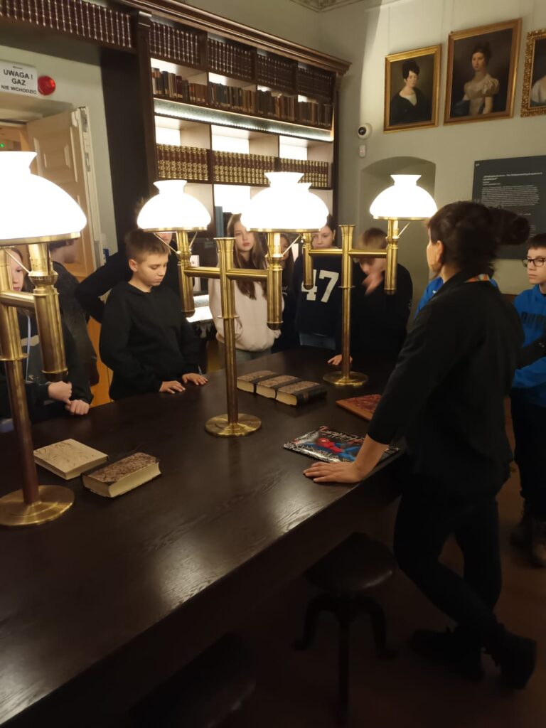 Pierwszym etapem wizyty było zwiedzanie fragmentu ekspozycji poświęconego rękopisowi Pana Tadeusza oraz sali Biblioteka, gdzie uczniowie poznali niezwykłe losy dzieła Adama Mickiewicza. Muzealne zbiory stały się inspiracją do działań kreatywnych – zarówno artystycznych, jak i związanych z dawnymi technikami druku i oprawy książek.