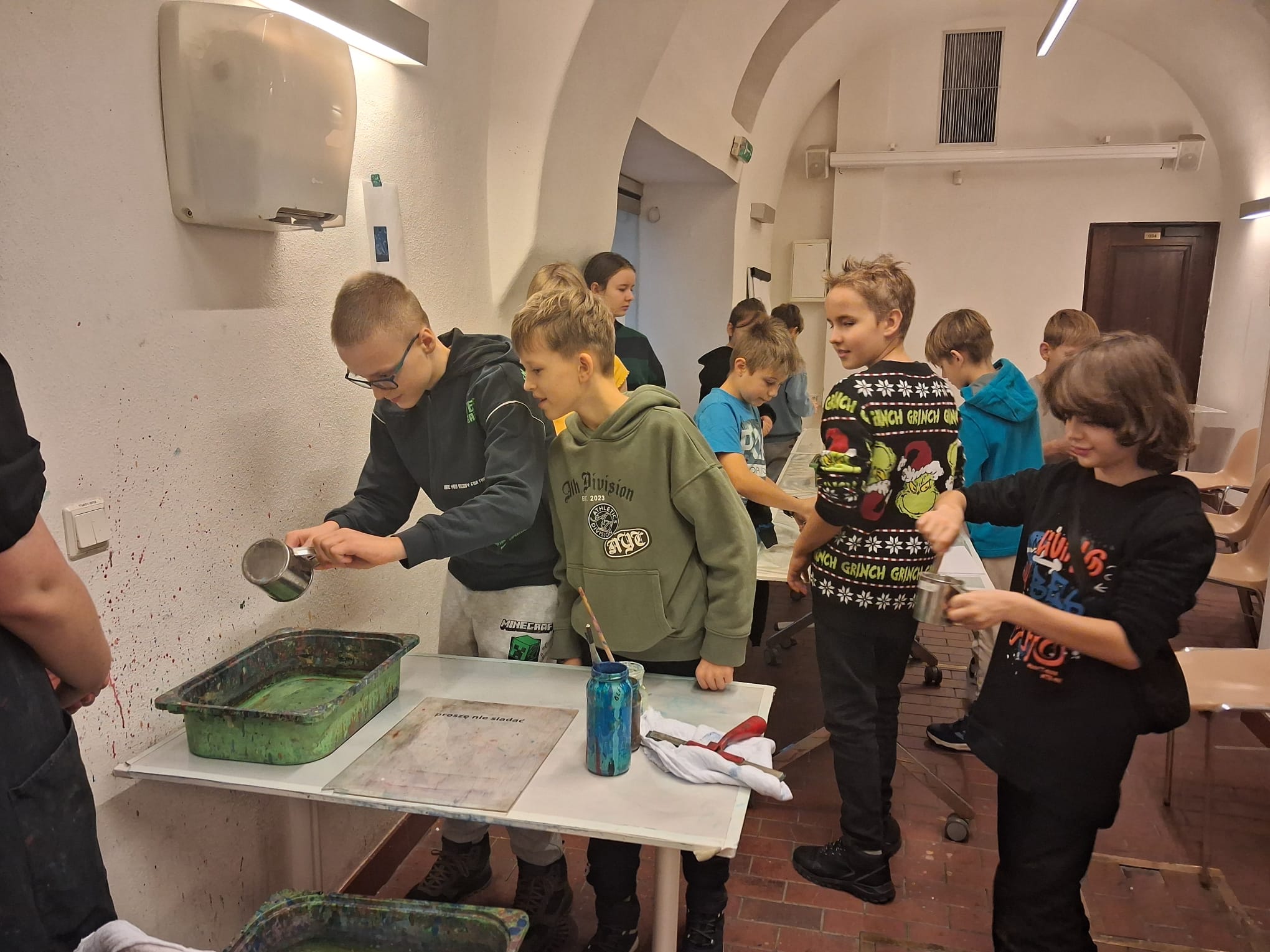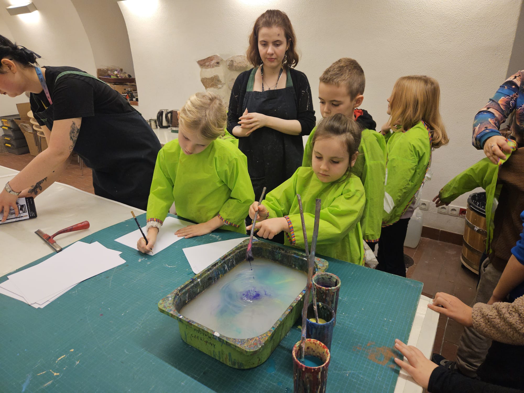 Następnie uczestnicy przystąpili do pracy twórczej. Młodsze klasy wzięły udział w zajęciach poświęconych kolażowi i wykonywaniu okładek z papieru marmurkowego, tworząc barwne i pełne wyobraźni kompozycje inspirowane soplicowskim ogrodem oraz klasycznymi wzorami. Pod okiem muzealnych edukatorów powstały oryginalne desenie papieru oraz unikatowe projekty artystyczne.