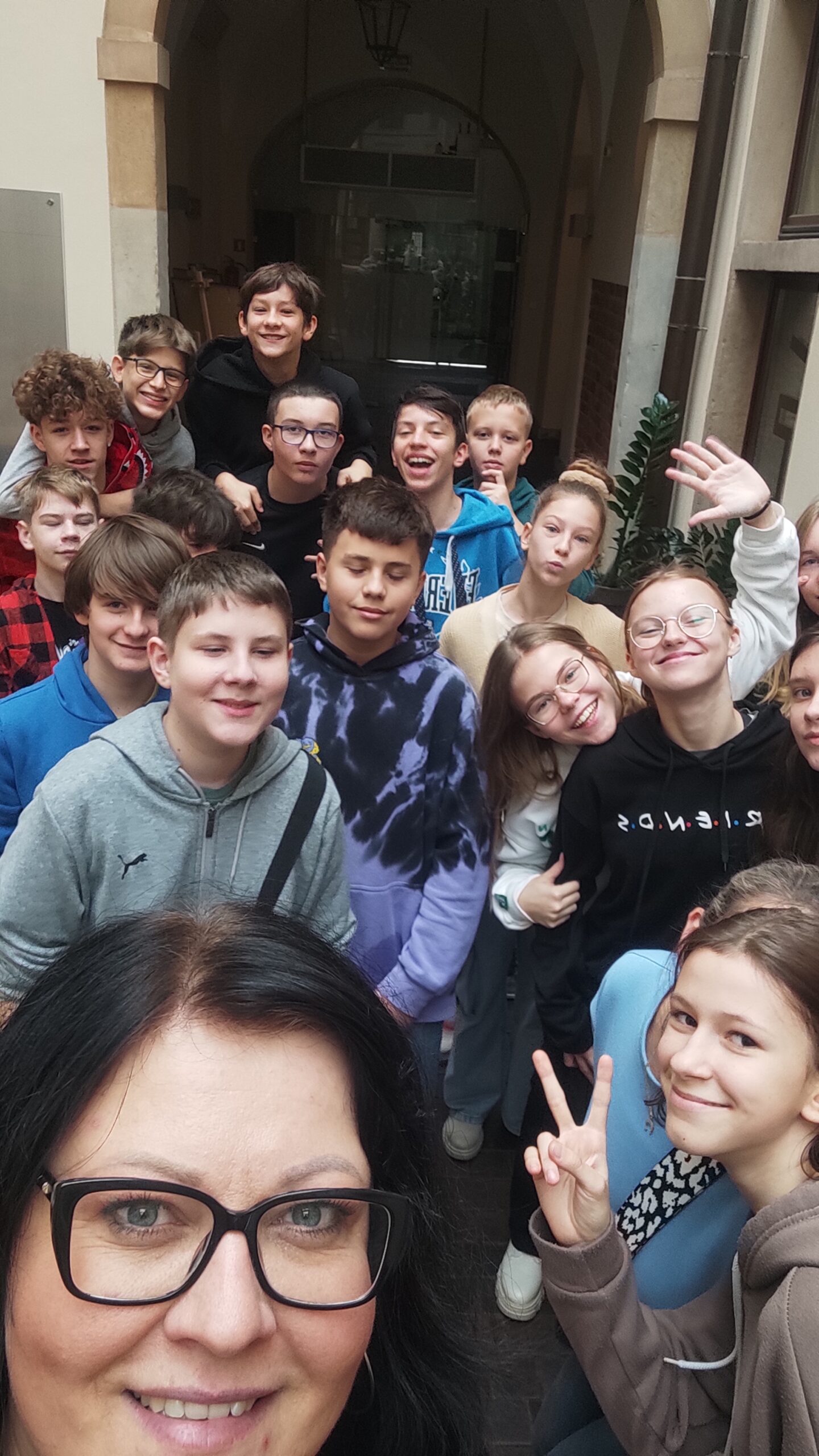 Po wskoczeniu w kurtki i wyjściu na zewnątrz budynku dowiedzieliśmy się, że rozpoczynamy konkurencję na sfotografowanie się z jak największą liczbą wrocławskich krasnali, znajdujących się w Rynku. Szybko podzieliliśmy się na grupy i popędziliśmy na fotograficzne polowanie, bo wszystkim pomysł się spodobał. Najwięcej zdjęć selfie z krasnalami miała grupa Maksa, Tymka, Sewy i Patryka. W nagrodę za zaangażowanie w poszukiwania Pani Stec, obiecała, że dla całej klasy upiecze ciasto i przyniesie do szkoły. Po obowiązkowej wizycie w restauracji Mc Donalds, z której wszyscy zmarznięci byli bardzo zadowoleni (również panie Hercuń i Stec) udaliśmy się na przystanek tramwajowy. Wycieczkę zakończyliśmy około 15.00. Zdecydowanie zaliczyliśmy ją do baaaaardzo udanych.