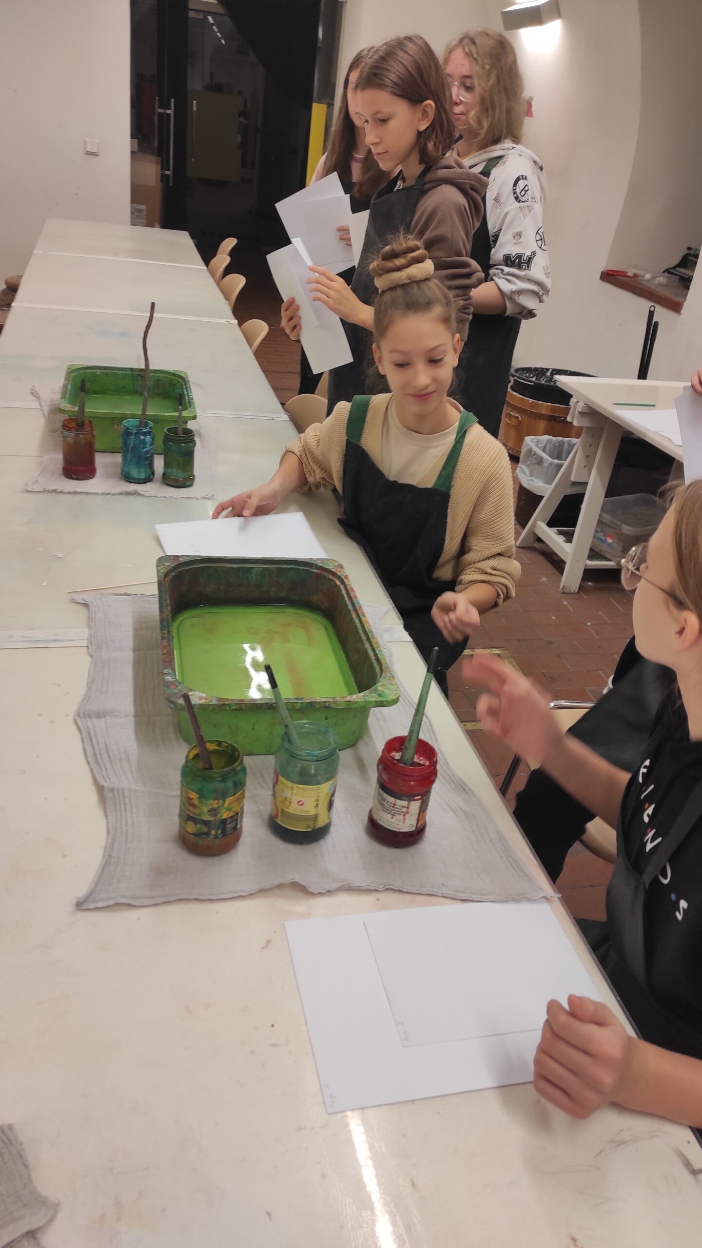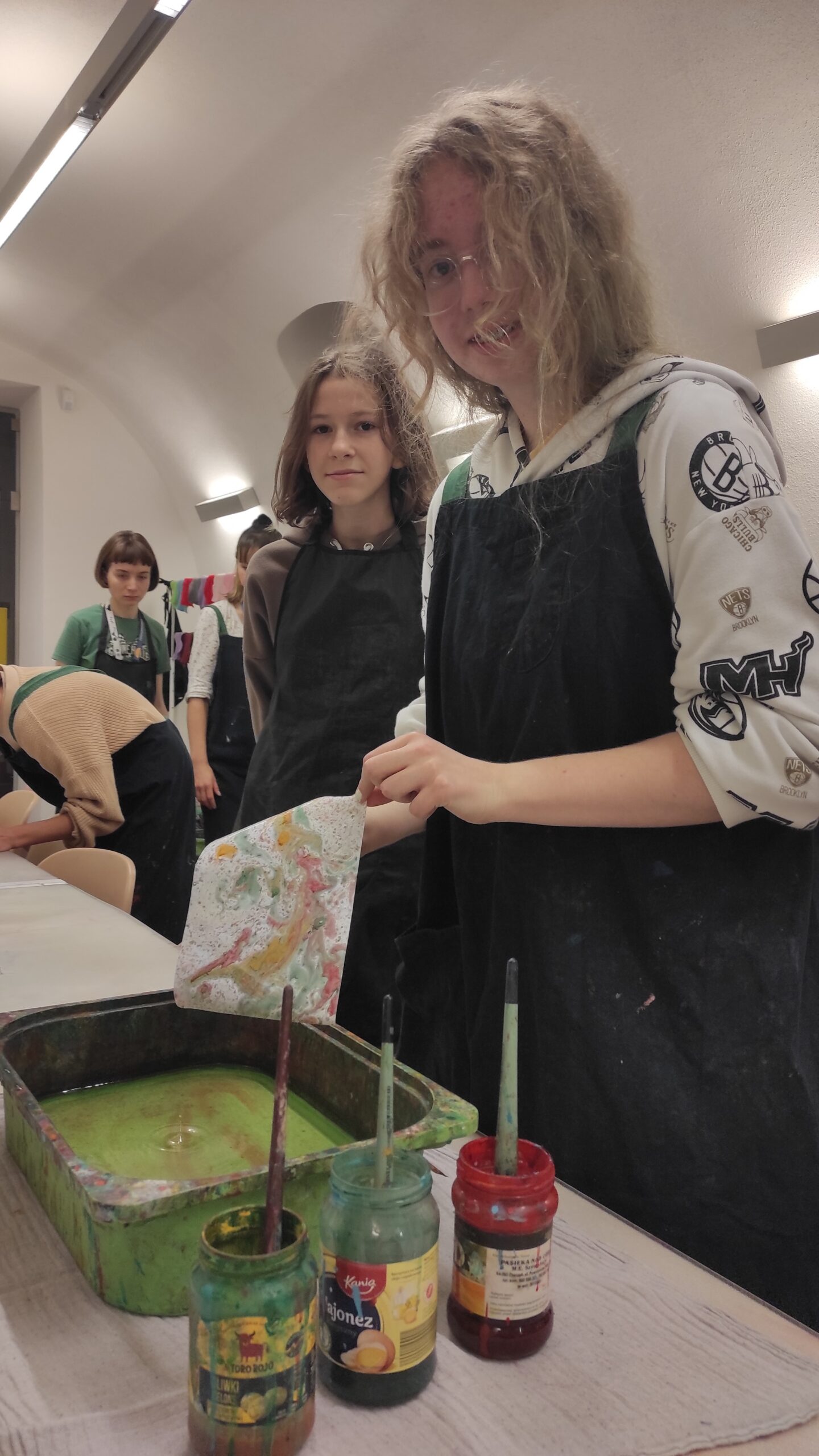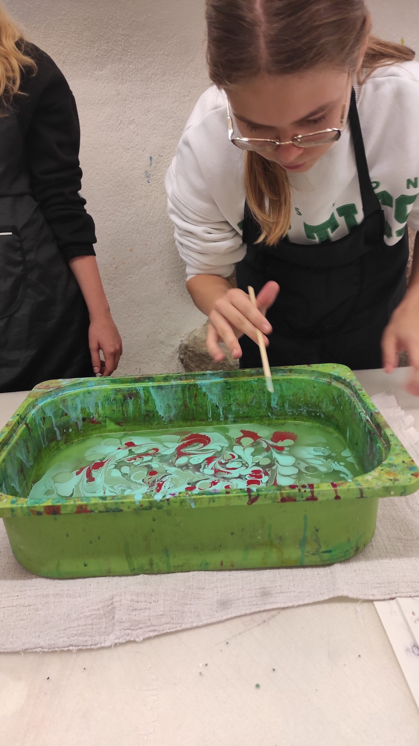 Okazało się bardzo szybko, że warsztaty z własnoręcznie wykonywanego papieru ebru zaciekawiły nie tylko podekscytowane dziewczyny, ale też chłopaków. Nie było widać, żeby ktoś się nudził. Warsztaty sprawiły wszystkim dużo radości.