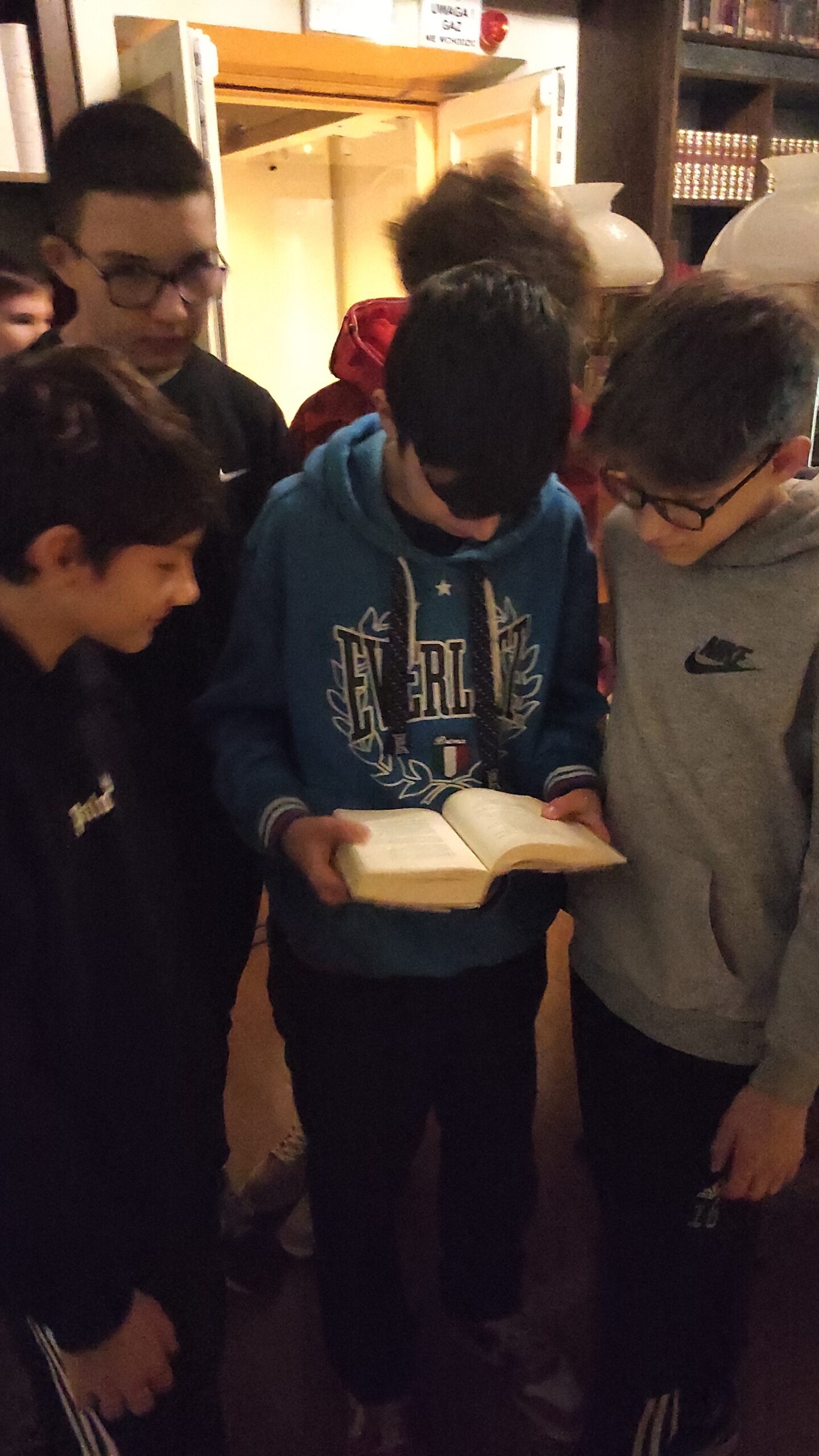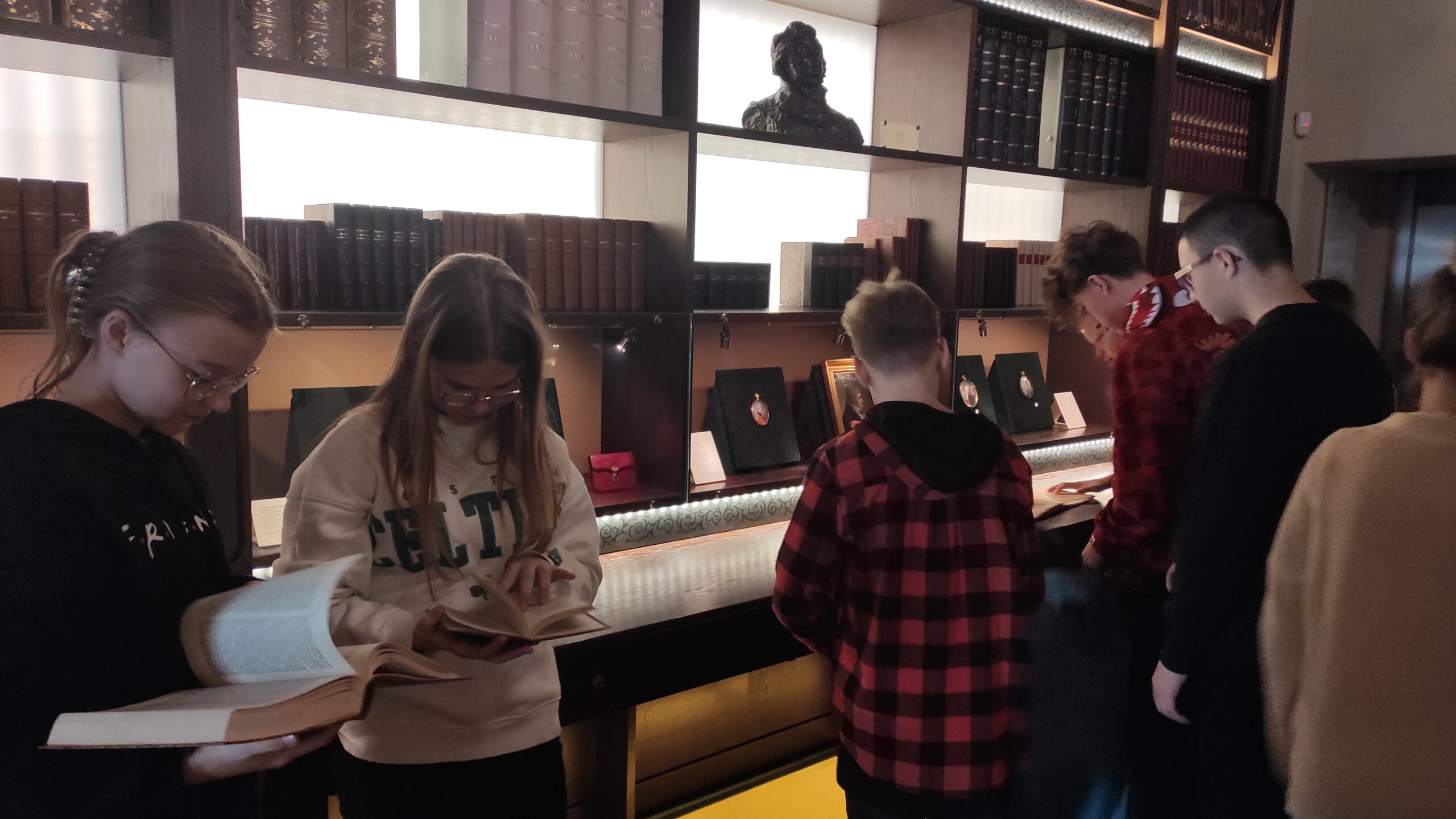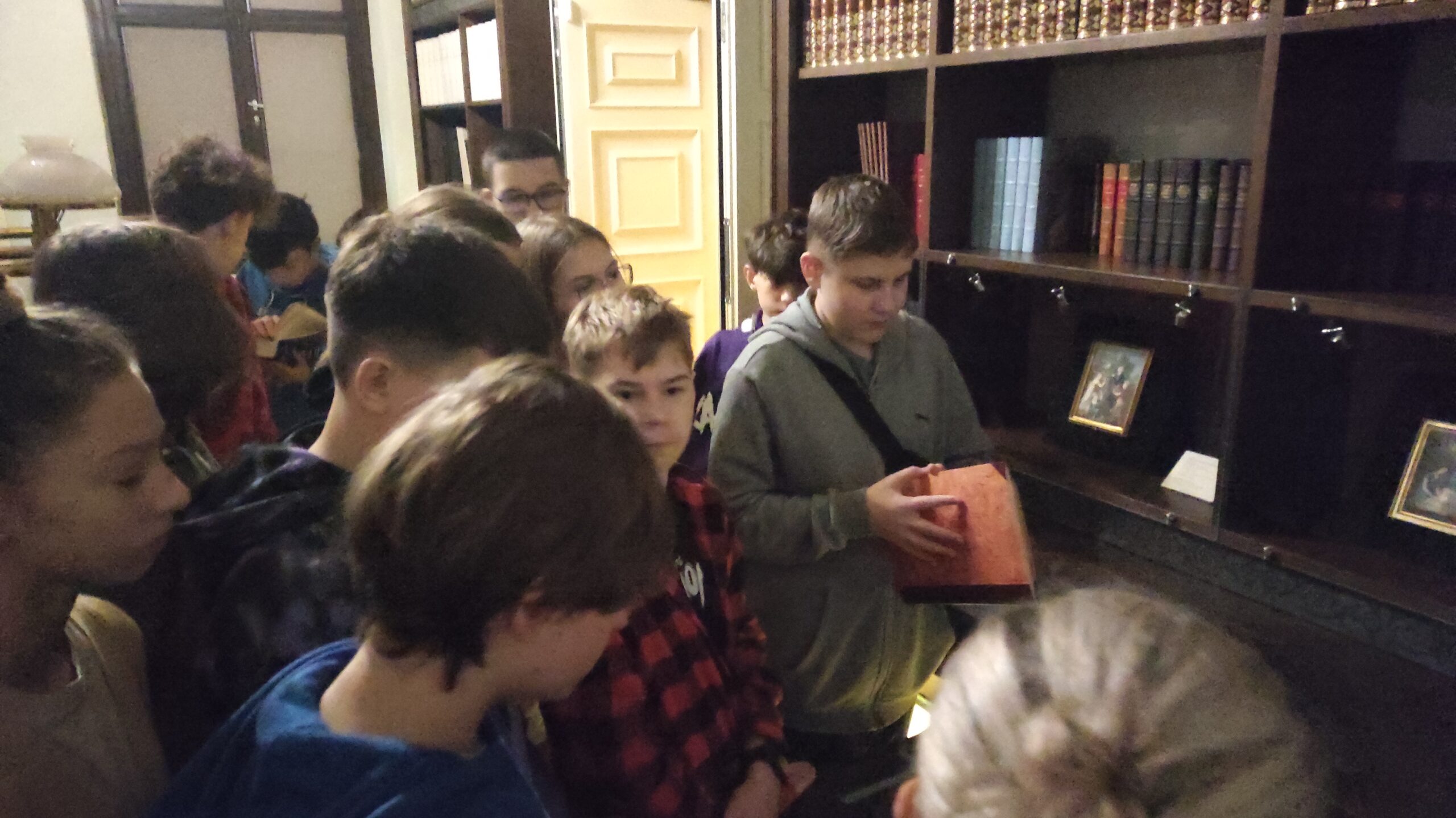 A potem panie zabrały nas na piętro muzeum w stylu dawnej domowej biblioteki. Był tam piękny, zdobiony, stary sufit. Przewodniczki wprowadziły nas najpierw w historię powstania Pana Tadeusza, a następnie dały nam do obejrzenia kopię pierwszego wydania książki. Dzięki temu, że omówiliśmy już z panią Hercuń tę lekturę chętnie odpowiadaliśmy na zadawane pytania. Ciekawość uczestników wycieczki rozbudziły dawne sposoby zabezpieczenia dokumentów – w tym przed fałszerstwem i sposoby oprawiania ksiąg papierem ebru.
