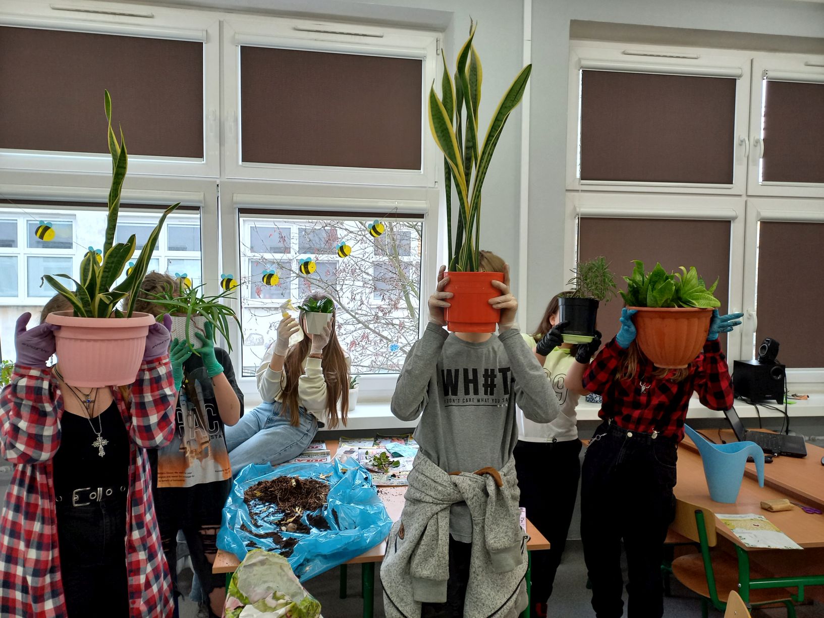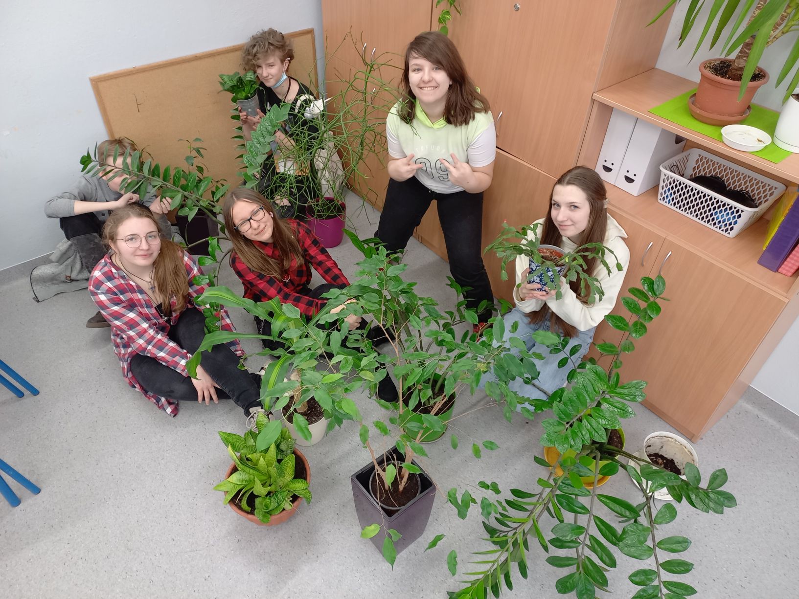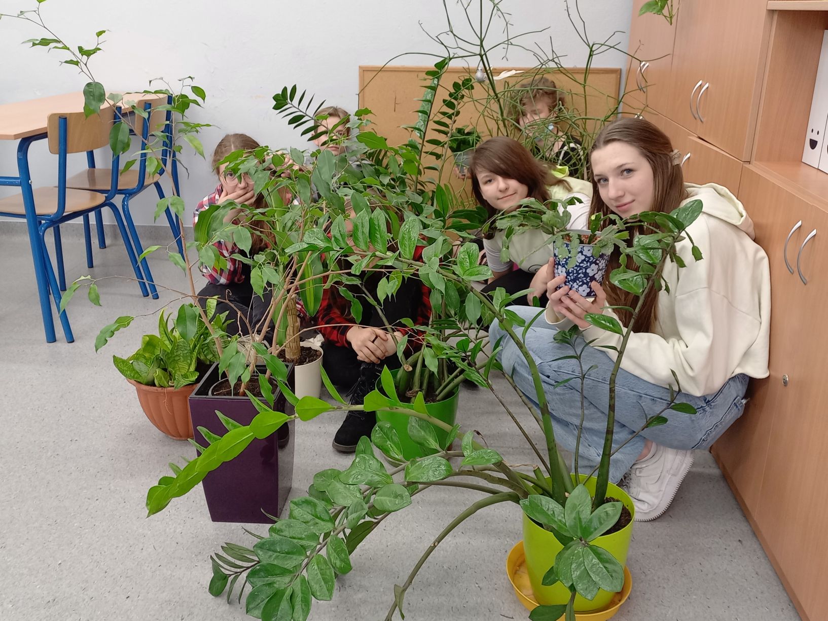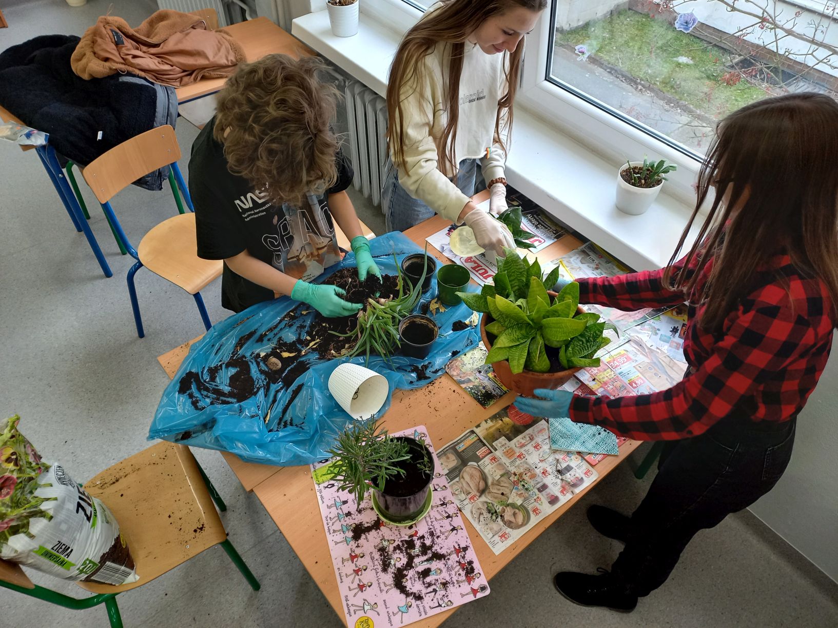 W zeszłym tygodniu nasi wolontariusze zajęli się pielęgnacją roślin w budynku przy ulicy Szkockiej. Kwiatowa sekcja w składzie: Natalia, Julka, Ola, dwie Wiktorie (8a) oraz Tycjan (8c) przez blisko 3 godziny myła, przesadzała i przycinała rośliny. Nasze kolejne spotkanie wśród zieleni już wkrótce.